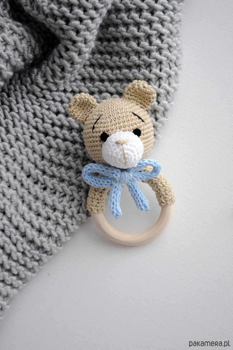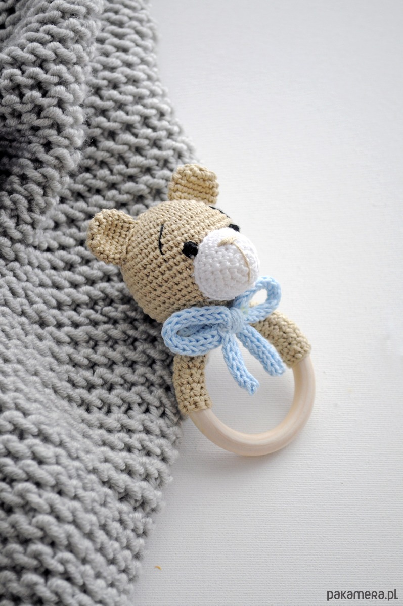 - grzechotki z głową misia; wys. 13cm, szer. 7cm, miś wydaje delikatny grzechoczący dźwięk