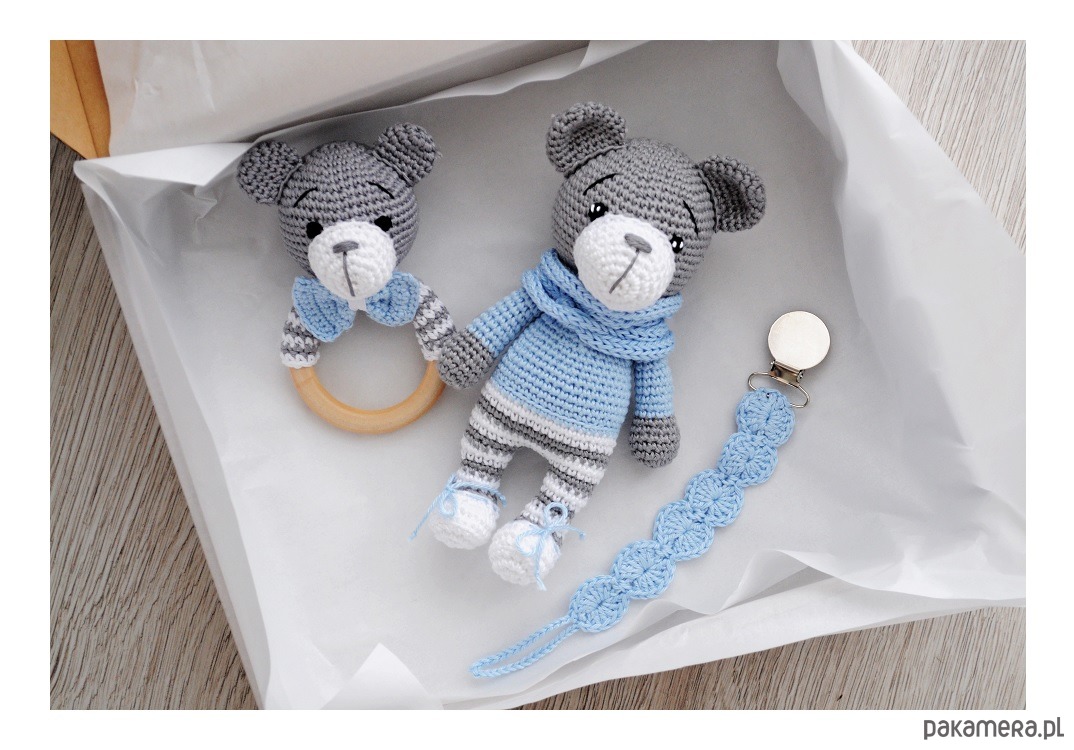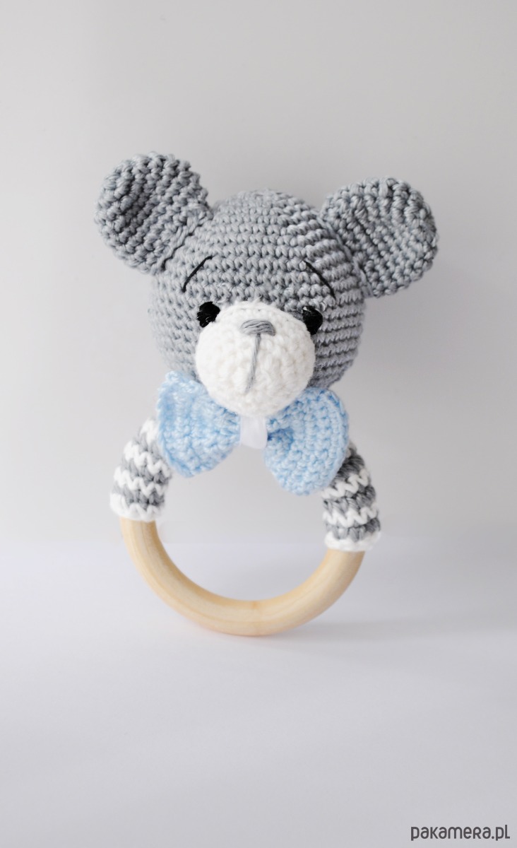 - grzechotki; wys. 12cm, szer. 7cm, miś wydaje delikatny grzechoczący dźwięk