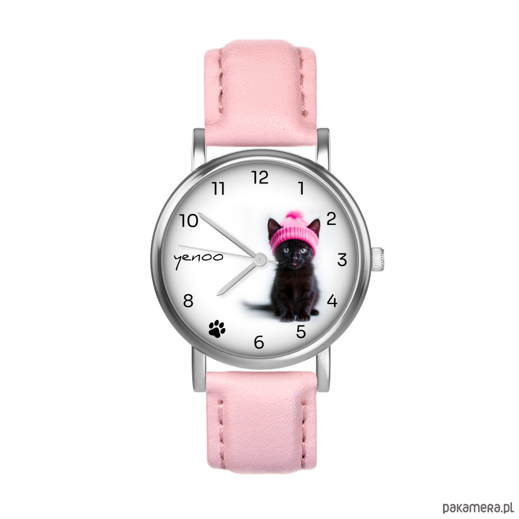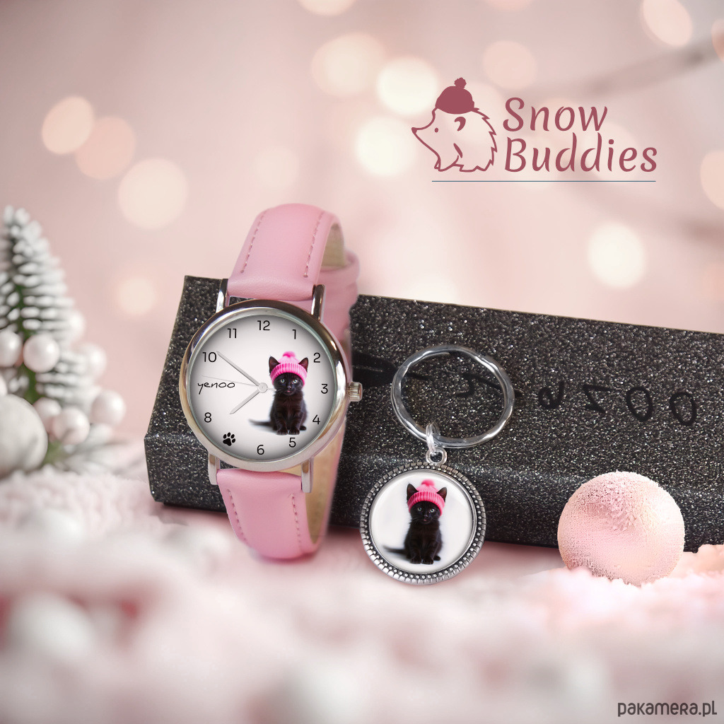Zestaw prezentowy - Czarny kotek - zegarek i brelok - skórzany, różowy