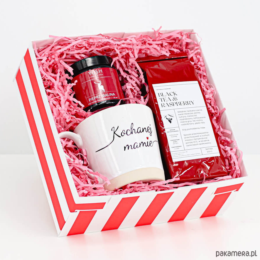 Zestaw prezentowy dla mamy z kubkiem, herbatą i świeczką sojową