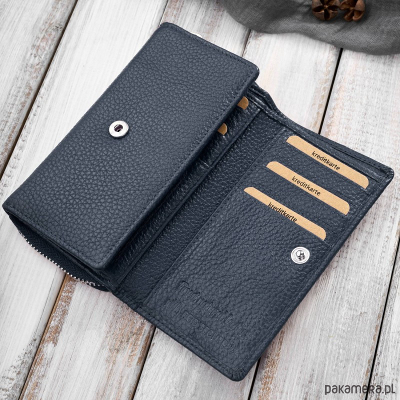 Portfel wyposażono w ochronną warstwę RFID, która zabezpiecza karty zbliżeniowe przed nieautoryzowanym skanowaniem. Dzięki temu możesz czuć się bezpiecznie w każdej sytuacji – w sklepie, komunikacji miejskiej czy podczas podróży. Wymiary portfela sprawiają, że mieści się do każdej torebki, a przy tym oferuje dużo miejsca wewnątrz.