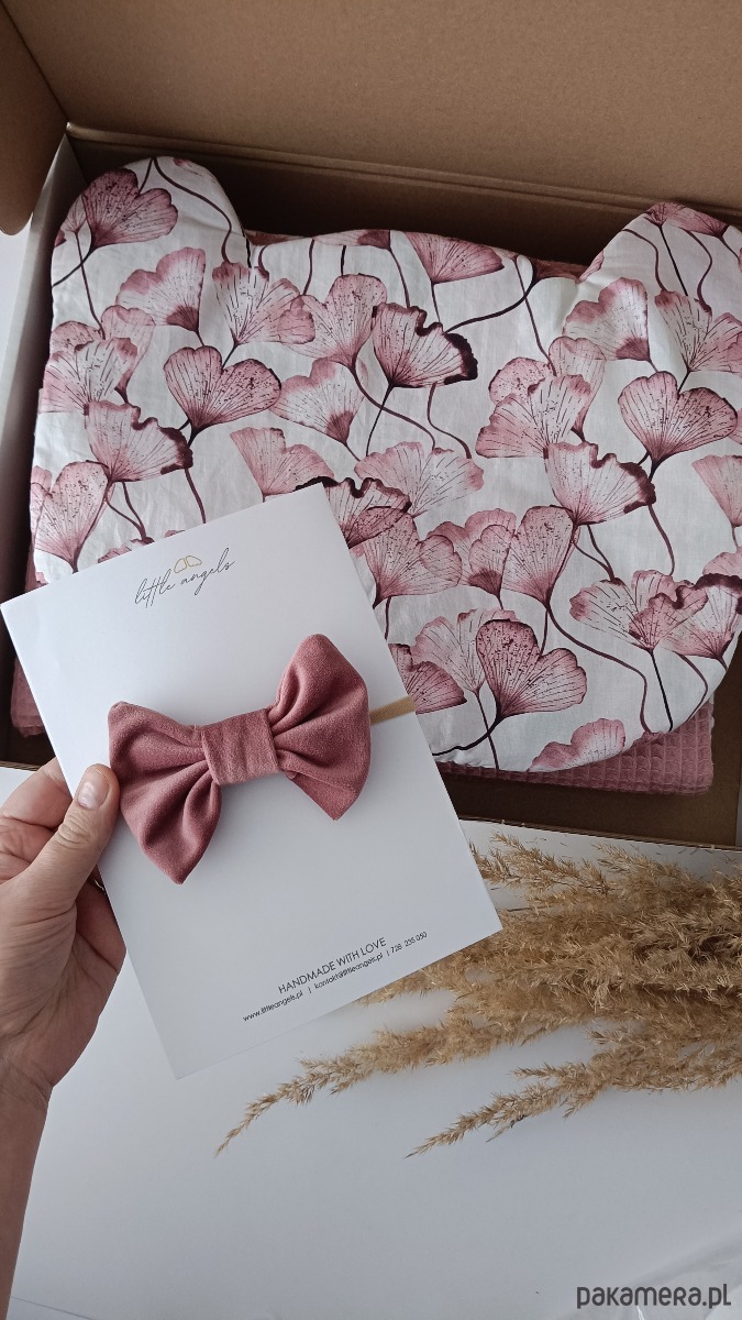 - Urocza kokardka na opasce bezuciskowej velvetowa (możliwość zamiany na muślinową lub bawełnianą we wzór z kocyka)