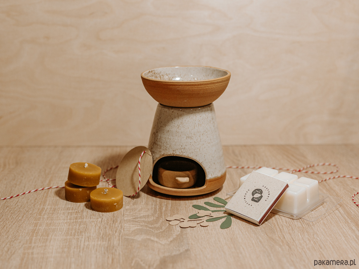 Podaruj komuś bliskiemu na święta zestaw do relaksu składający się z ręcznie toczonego kominka do topienia wosku, naturalnego sojowego wosku zapachowego stworzonego przez Olove i świeczek z wosku pszczelego od Płonka Podleśna.