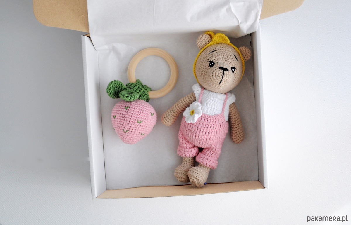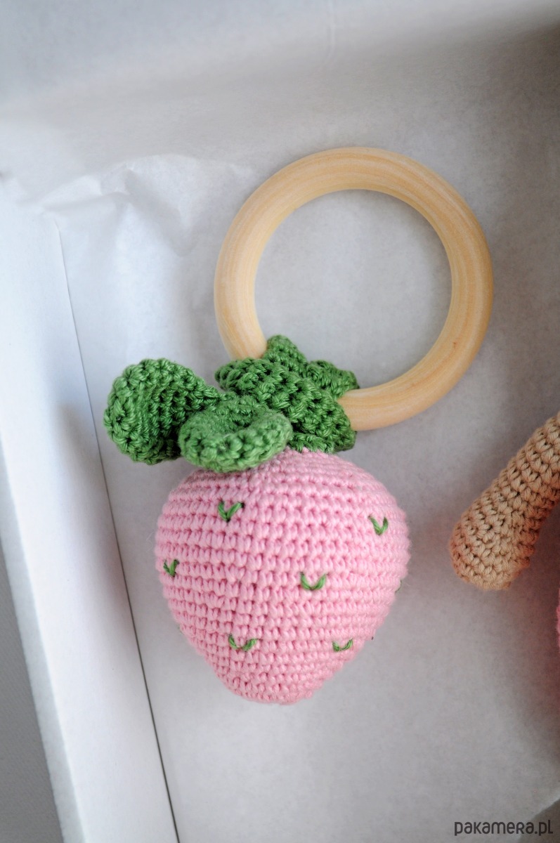 - grzechotki/zawieszki w kształcie truskawki; wys. 14cm, szer. 7cm, miś wydaje delikatny grzechoczący dźwięk