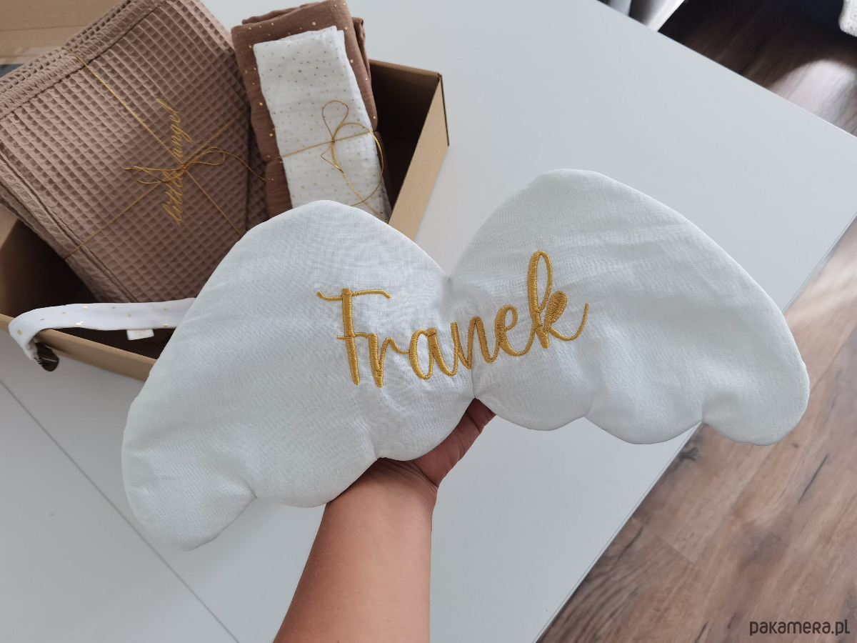 - skrzydełka z imieniem dziecka (jako gadżet do zdjęć, do zabaw lub ozdoba pokoju) lub drobna maskotka np serduszko gwiazdka.