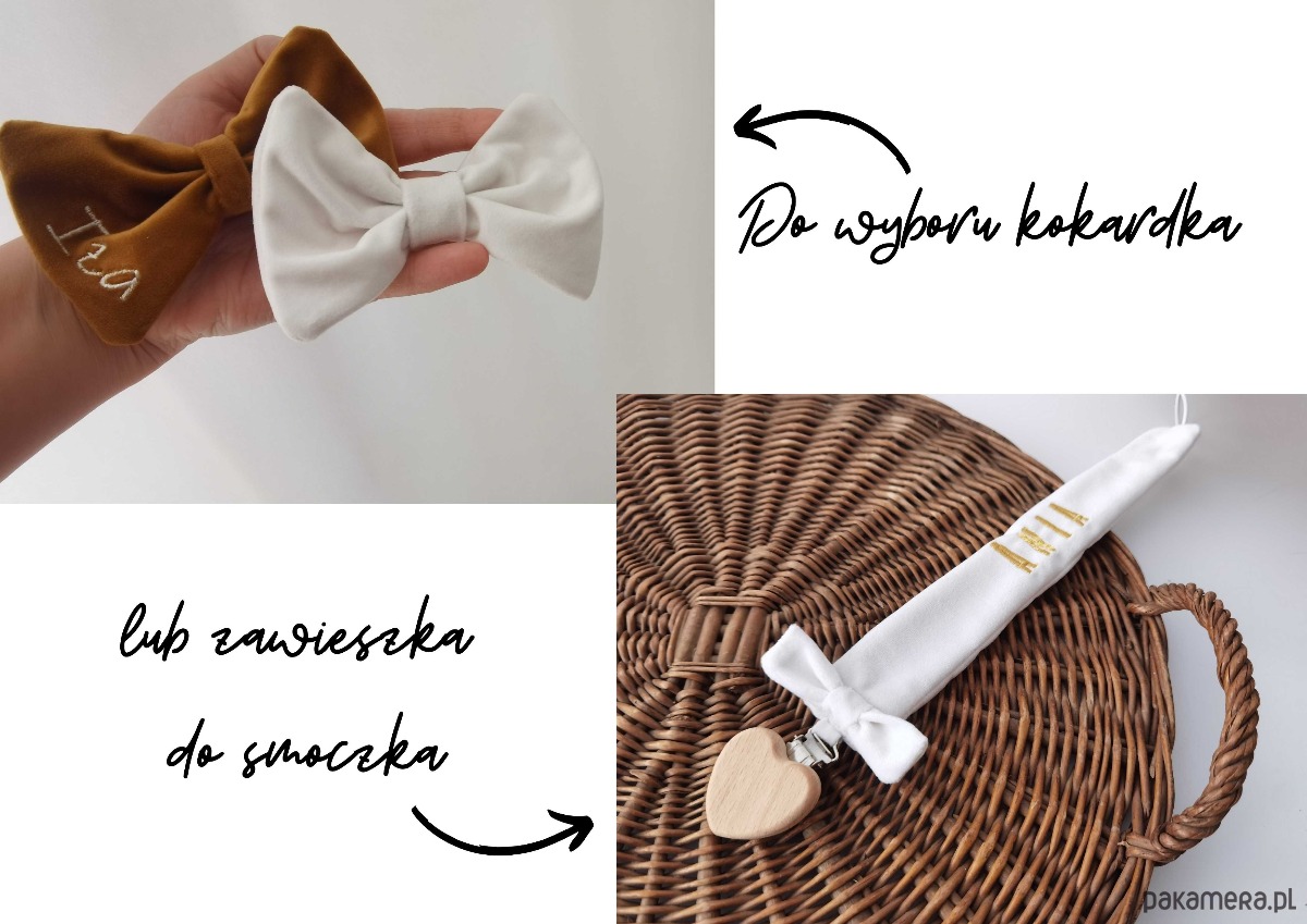 - Zawieszka do smoczka z imieniem dziecka lub kokardka do włosów na opasce bezuciskowej, spince lub gumeczce