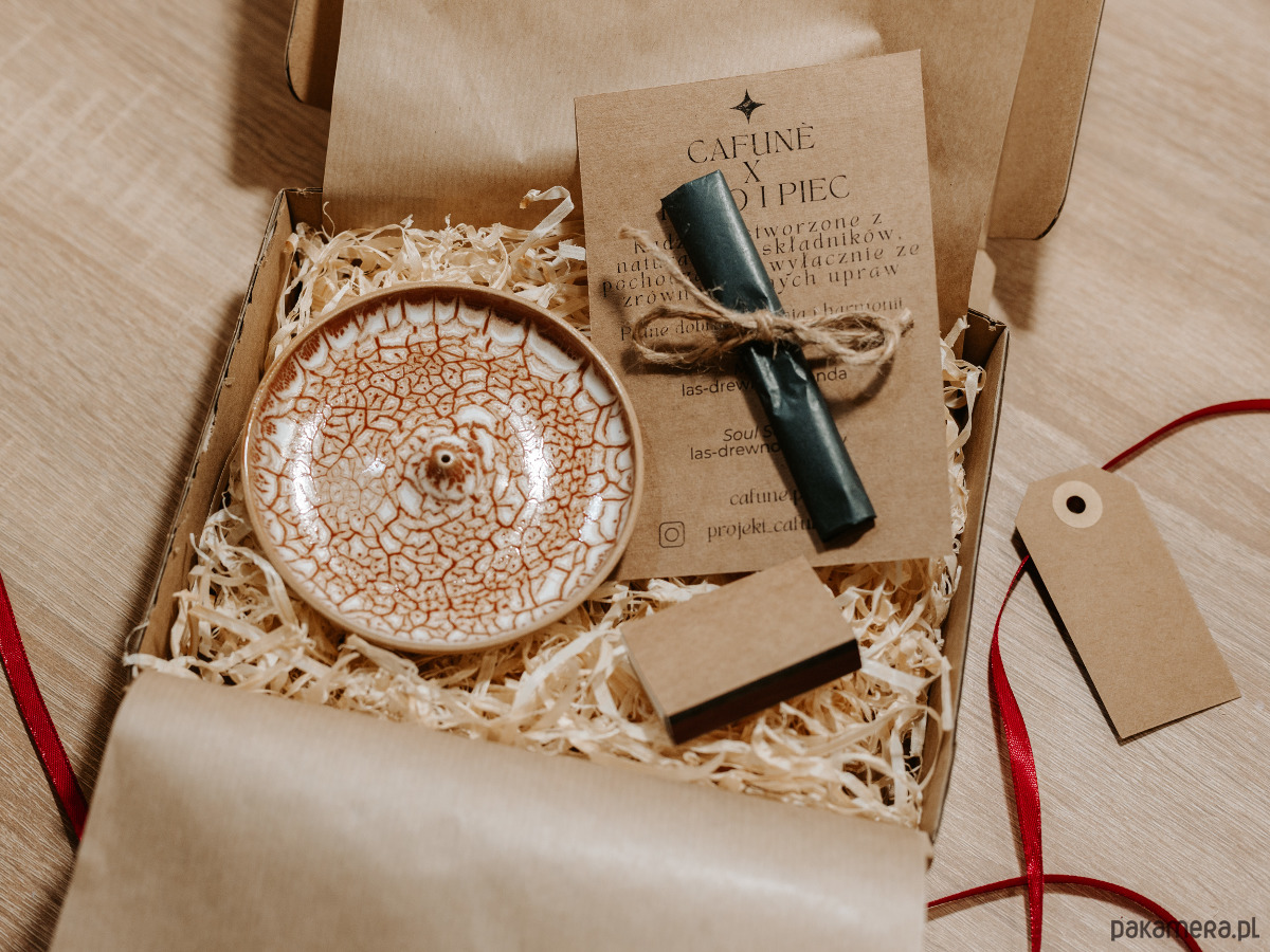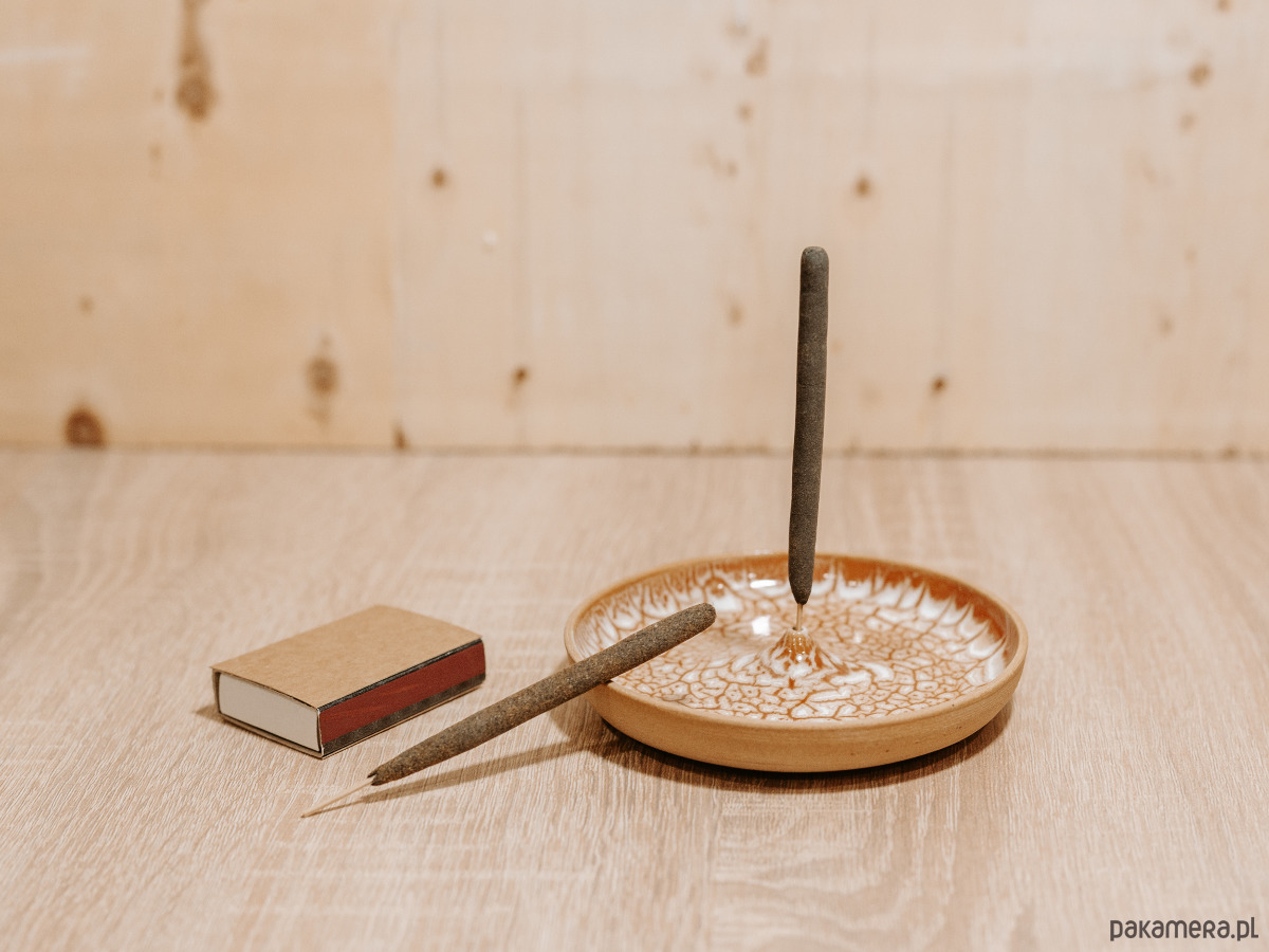 Podaruj komuś bliskiemu zestaw do relaksu składający się z ręcznie toczonej ceramicznej podstawki na kadzidło i dwóch wysokiej jakości kadzideł ręcznie toczonych przez Projekt Cafune.