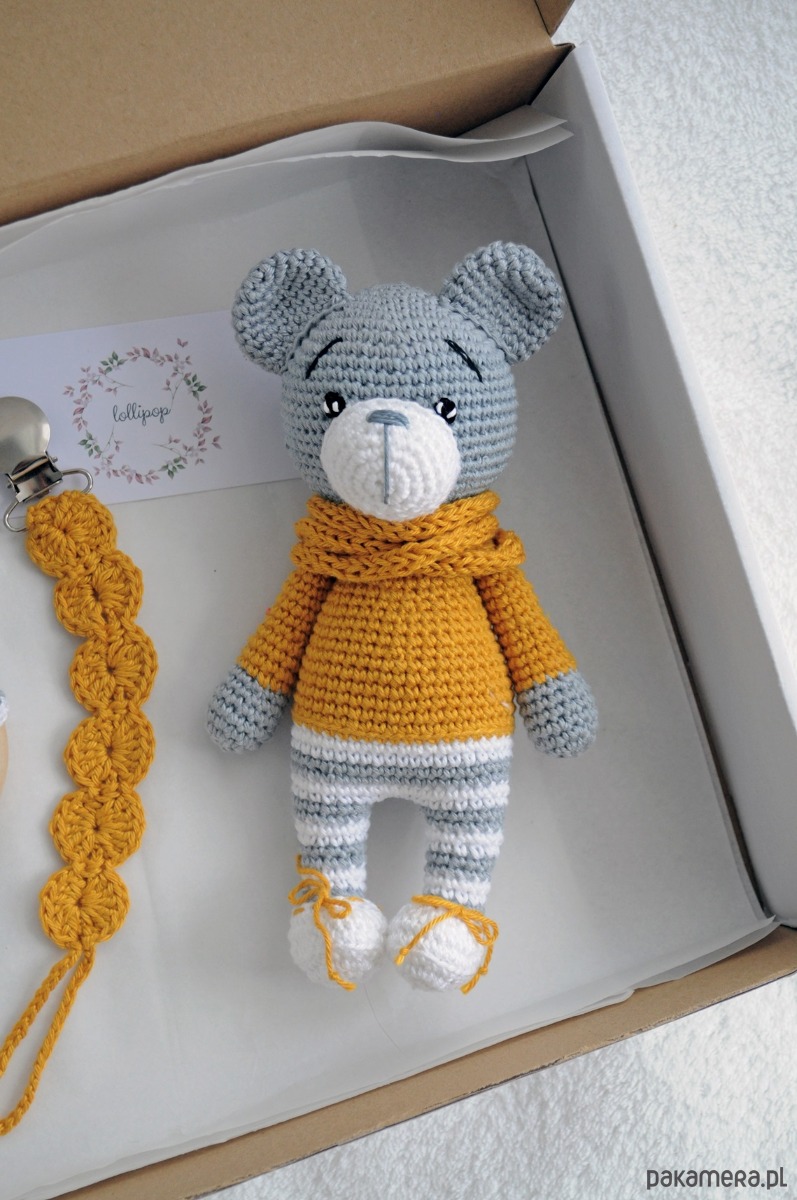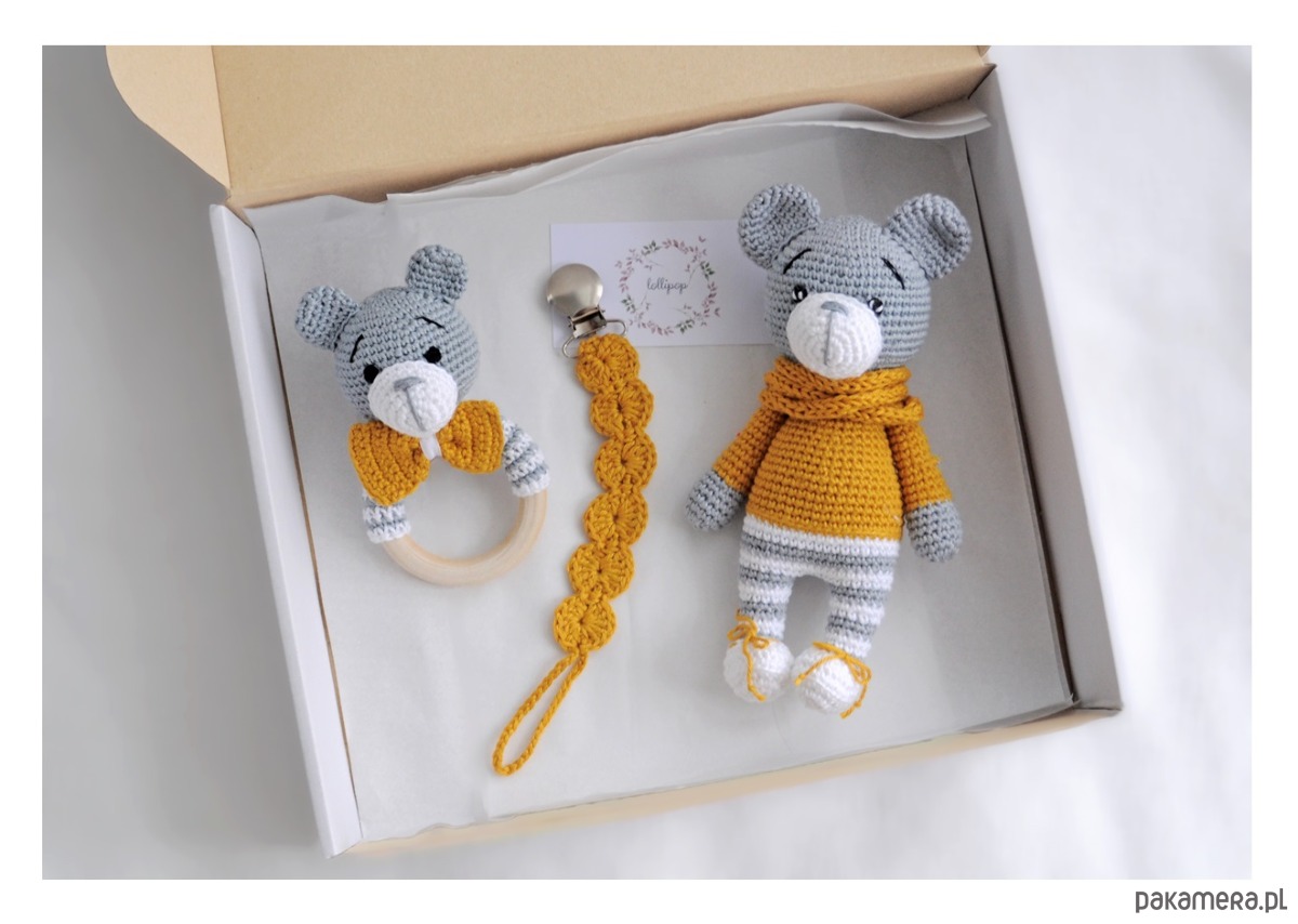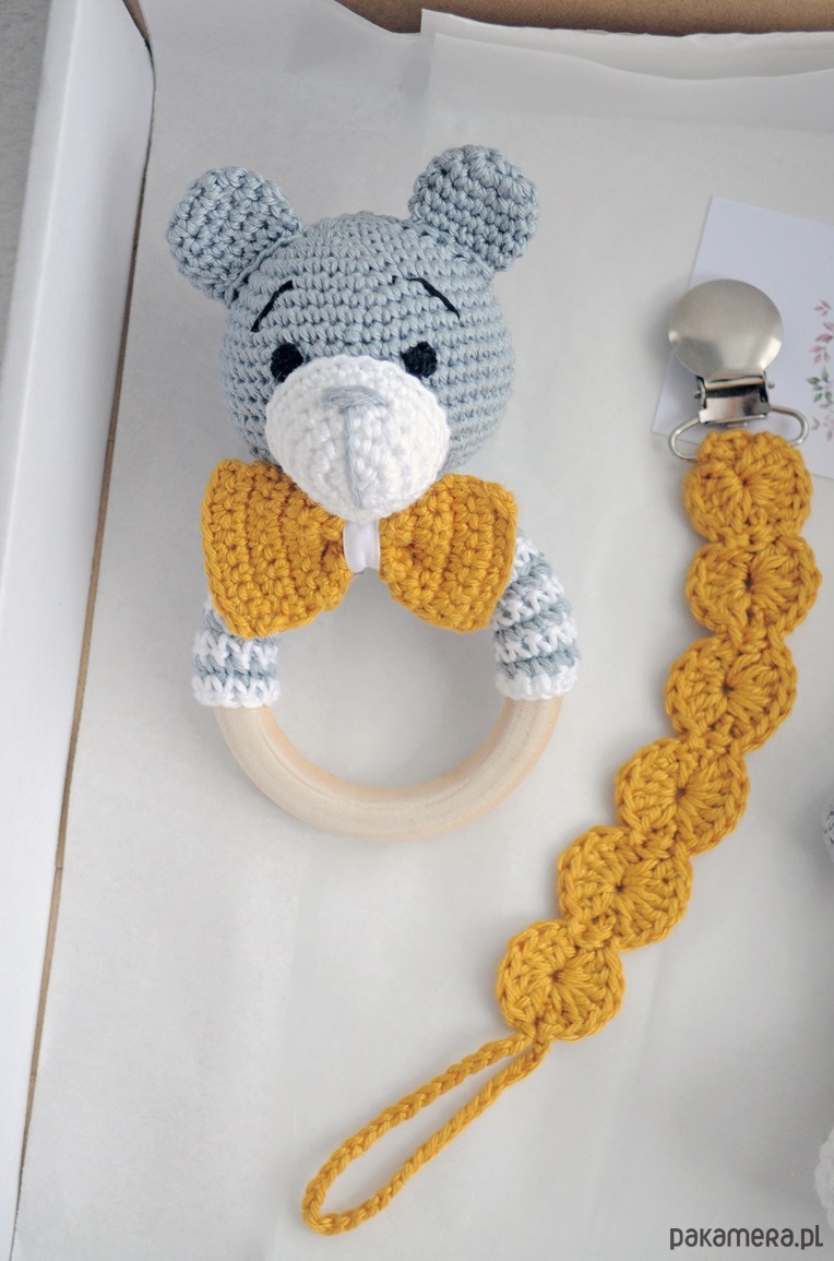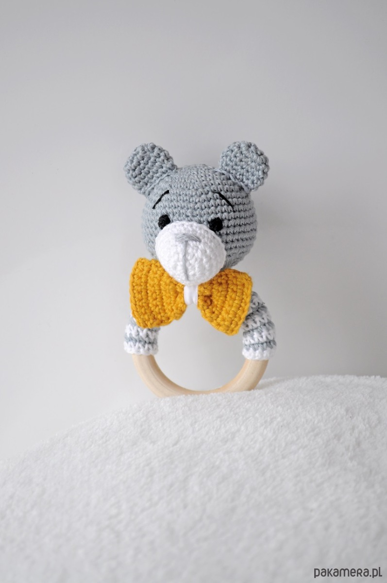 - grzechotki; wys. 13cm, szer. 7cm, miś wydaje delikatny grzechoczący dźwięk