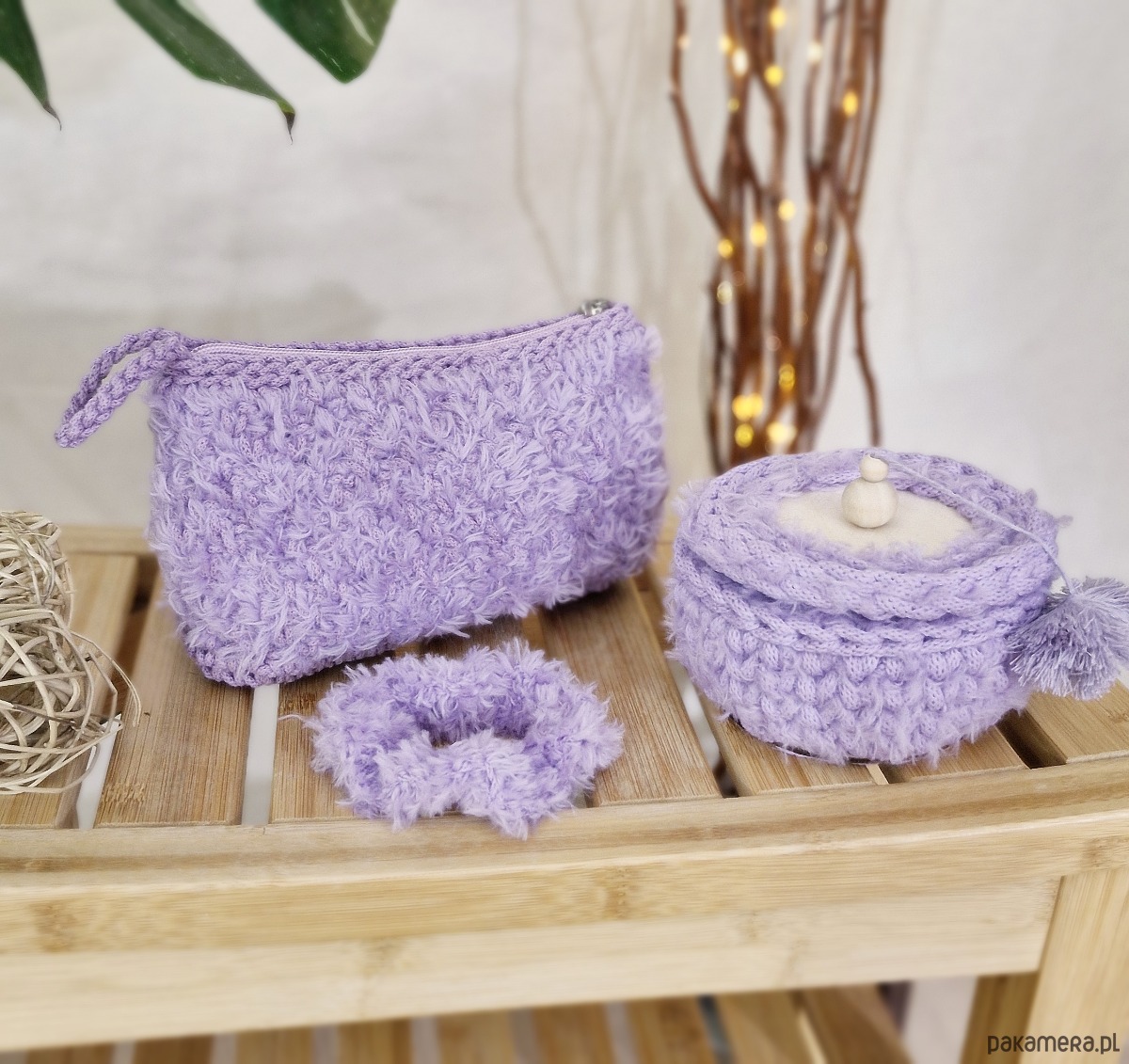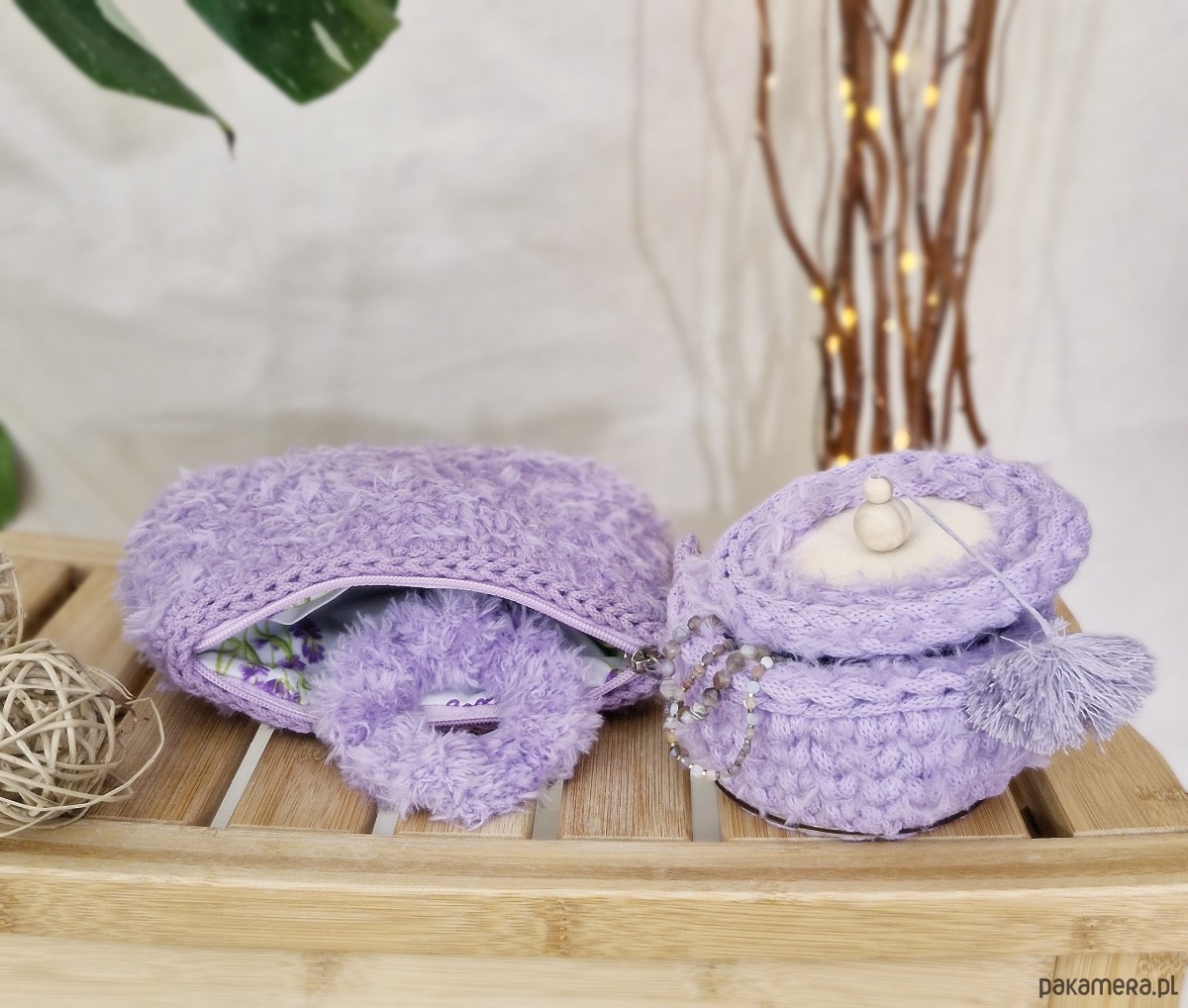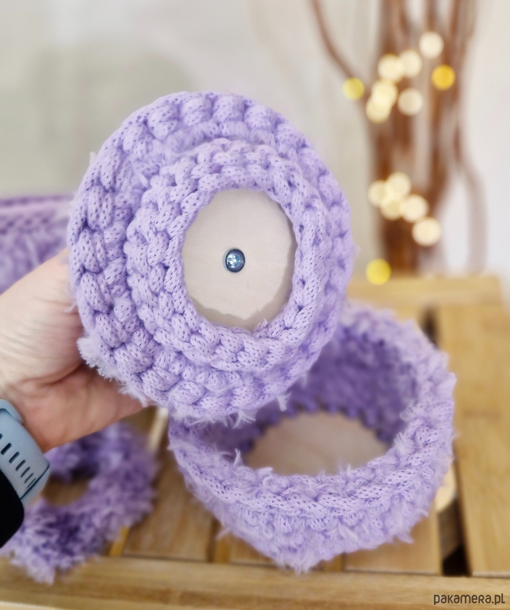 Wykonałam je ręcznie ze sznurka bawełnianego z recyklingu 100% oraz włochatej włóczki syntetycznej. Kosmetyczka ma wszytą bawełnianą podszewkę kolorystycznie dopasowaną do całości z otwartą kieszonką. Zalecam pranie ręczne kosmetyczki oraz gumki oraz delikatne czyszczenie bądź odkurzanie szkatułki.