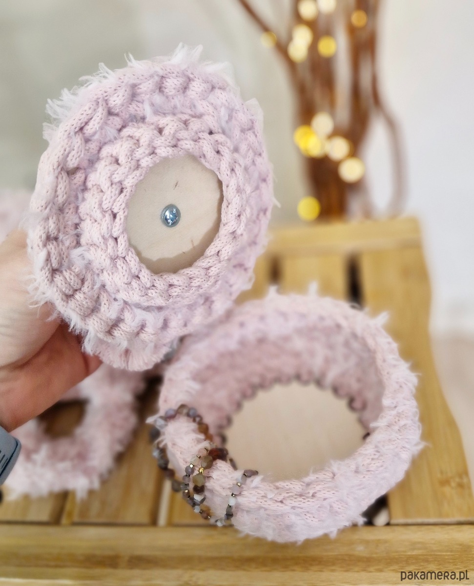 Wykonałam je ręcznie ze sznurka bawełnianego z recyklingu 100% oraz włochatej włóczki syntetycznej. Kosmetyczka ma wszytą bawełnianą podszewkę kolorystycznie dopasowaną do całości z otwartą kieszonką. Zalecam pranie ręczne kosmetyczki oraz gumki oraz delikatne czyszczenie bądź odkurzanie szkatułki.