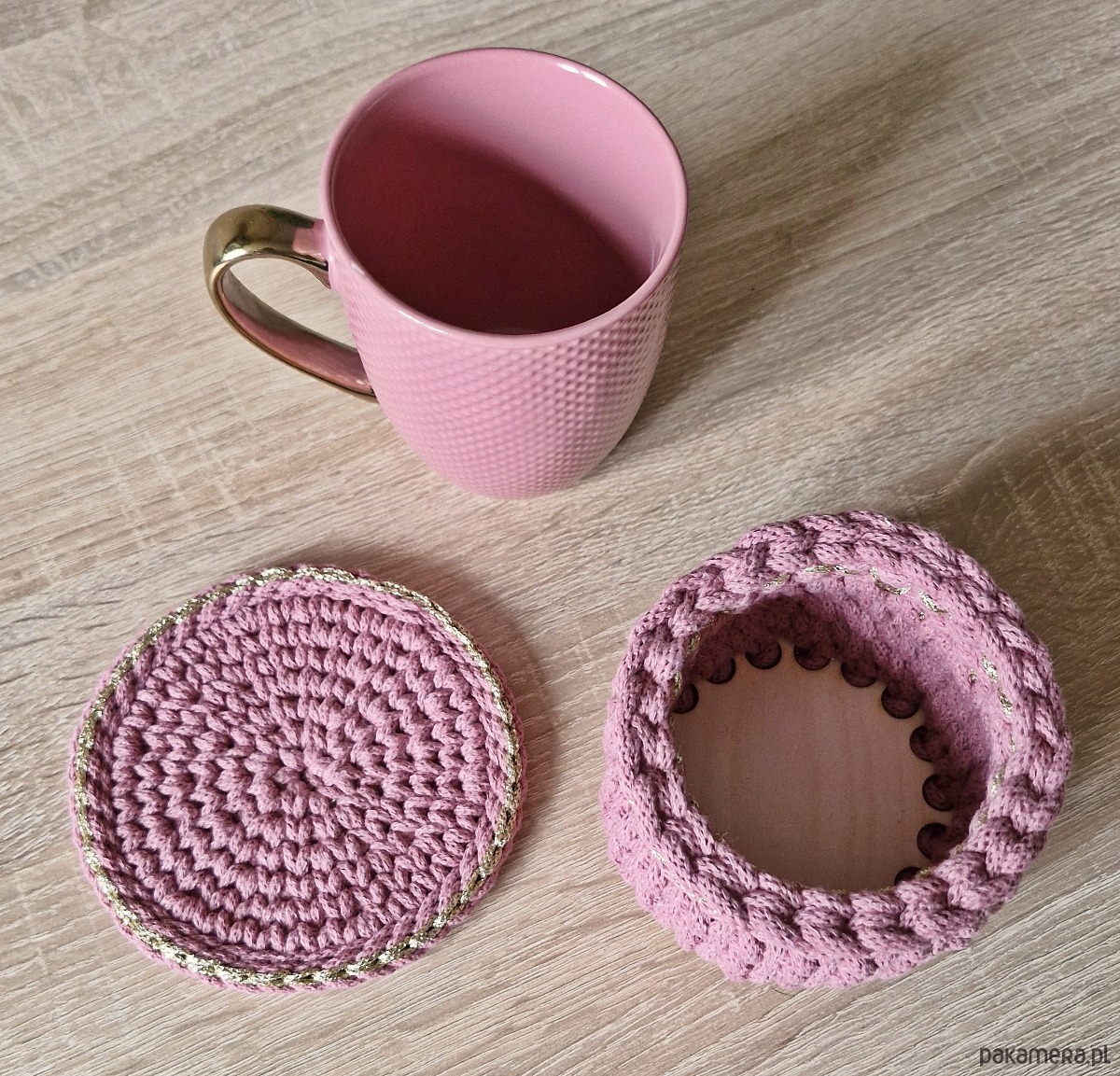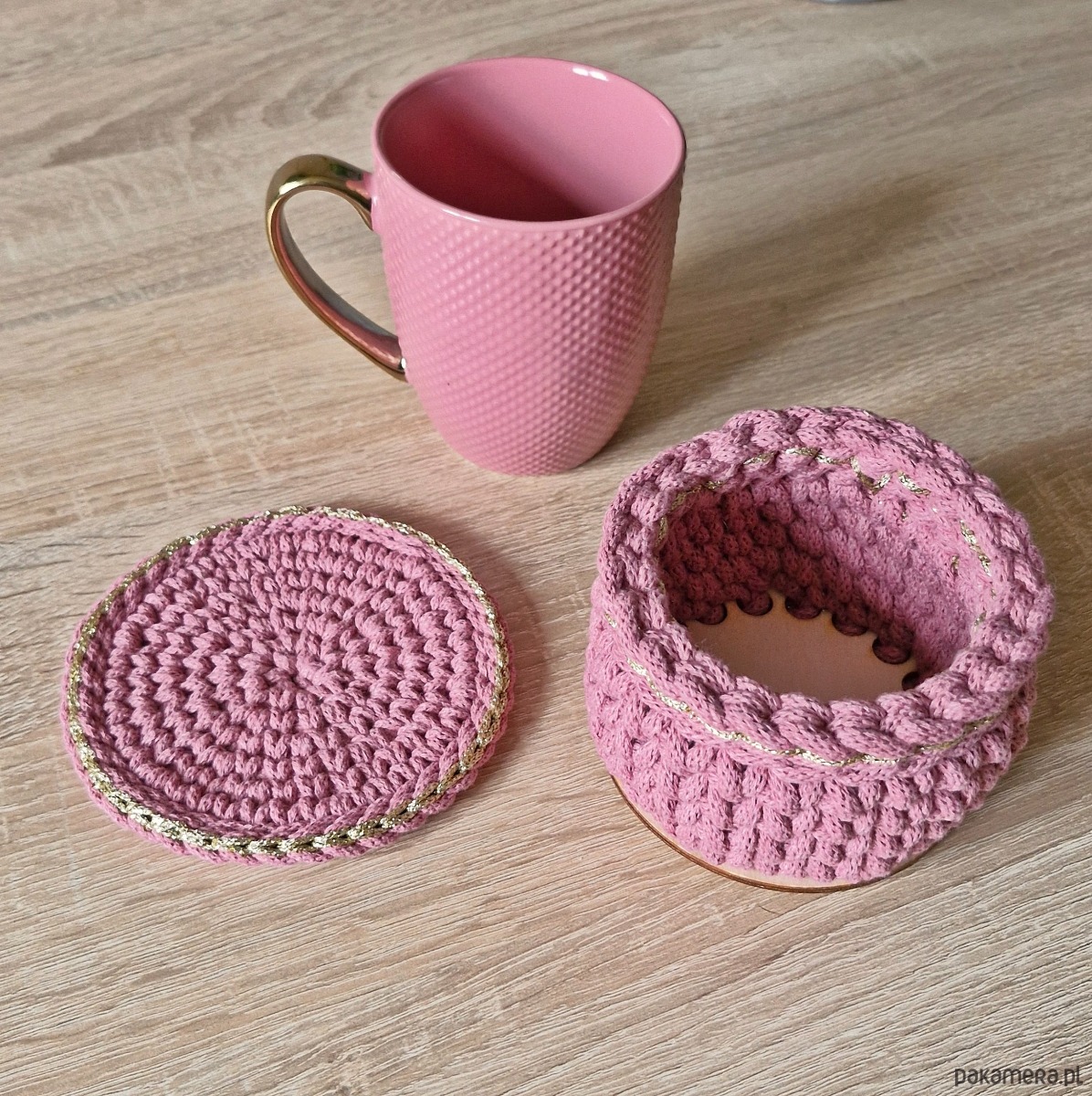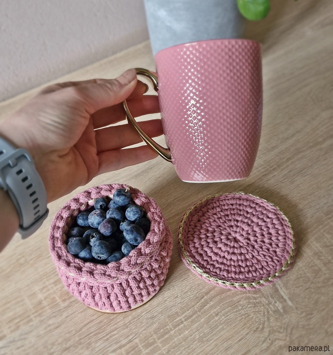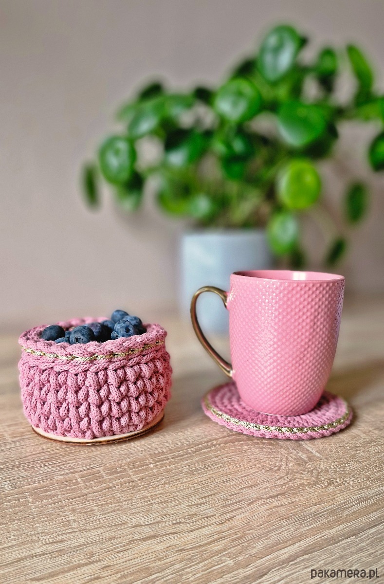 Podkładkę oraz koszyczek na smakołyki wykonałam z bawełny 100% z recyklingu dodatkowo zdobiąc obrzeża pięknie połyskującą, złotą nitką korespondującą z uchem kubka, który jest świetnym uzupełnieniem zestawu.