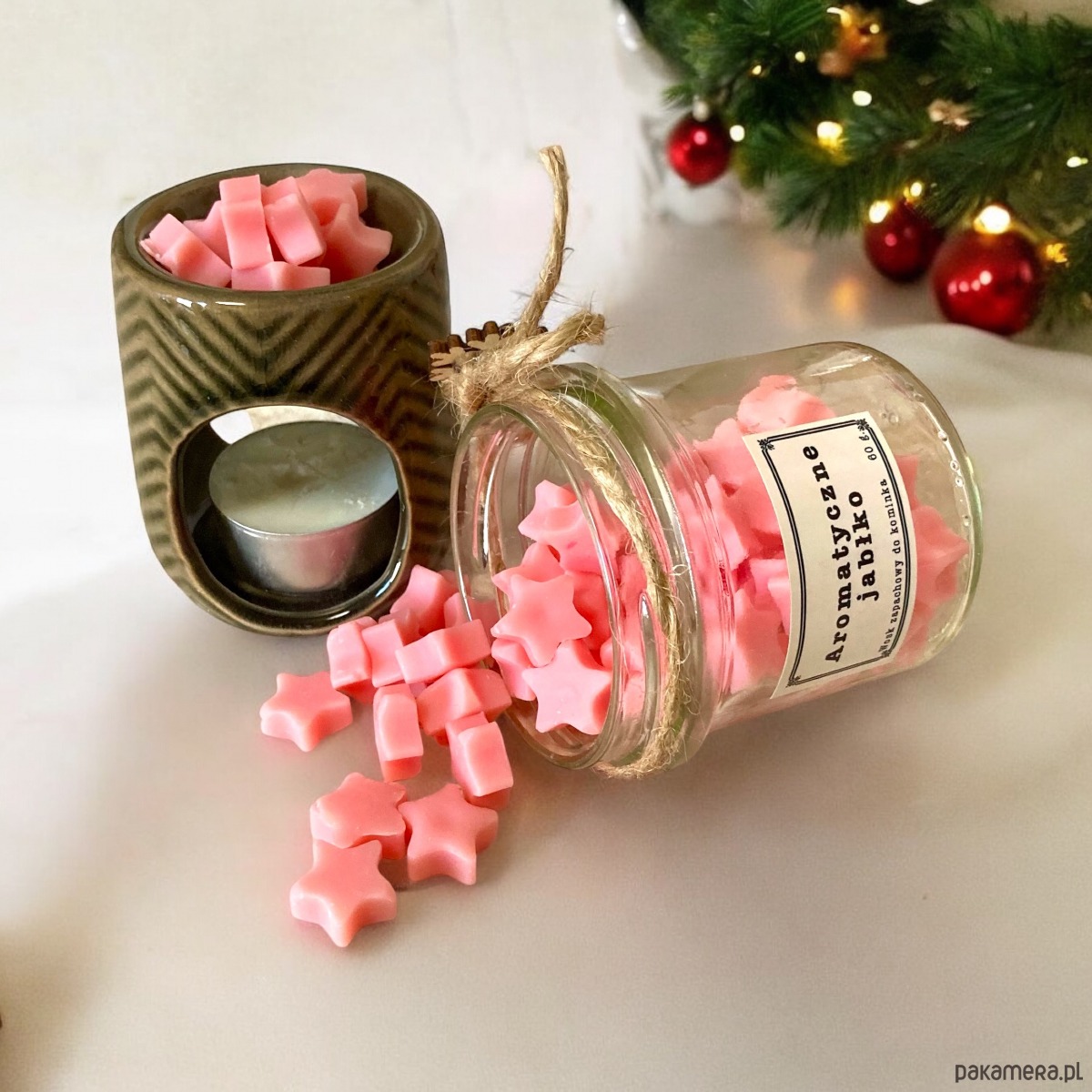 Piękny zestaw prezentowy z ręcznie robionym woskiem pachnącym pieczonym jabłkiem z przyprawami korzennymi oraz ceramicznym kominkiem zapachowym, będzie wspaniałym upominkiem z okazji zbliżających się Świąt.