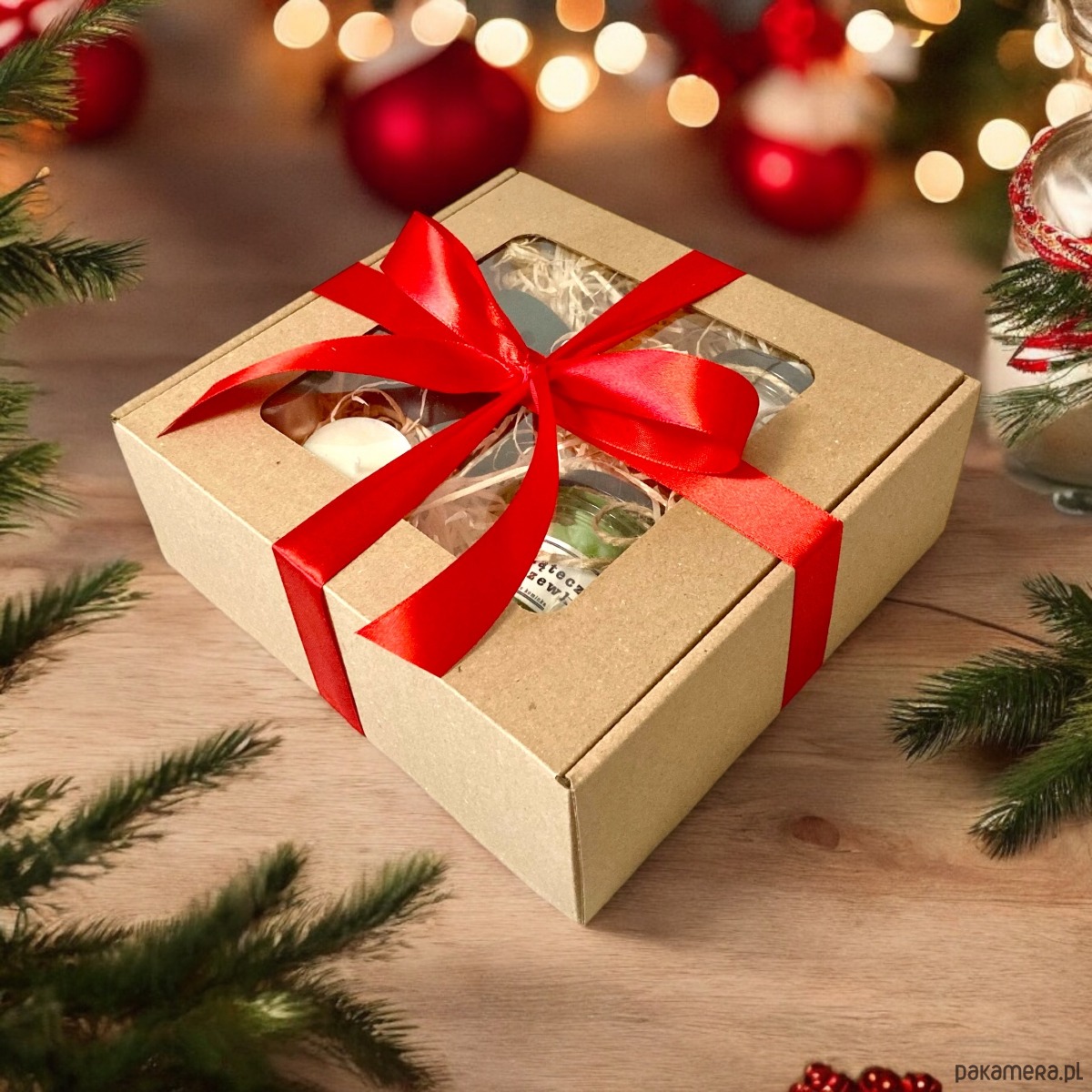 Zestaw zapakowany jest w pudełko prezentowe z okienkiem i przewiązane wstążką.