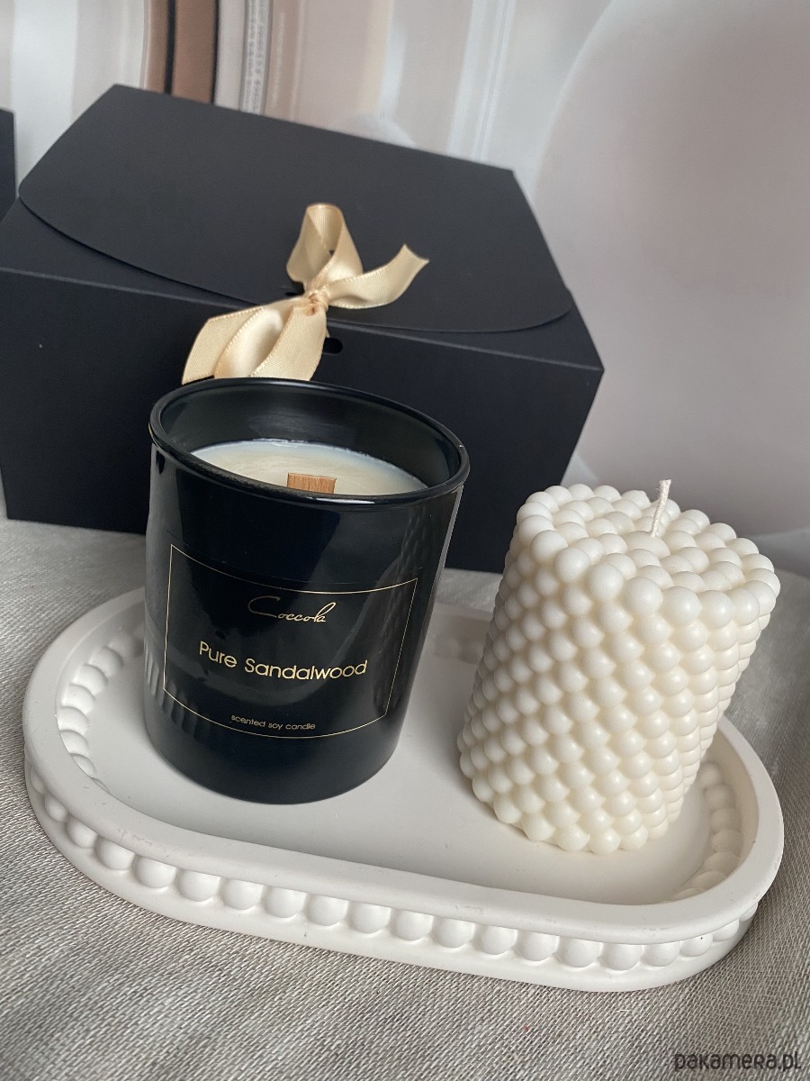 Wprowadź do swojego wnętrza ciepły, elegancki klimat dzięki luksusowemu zestawowi ręcznie wykonanych świec w odcieniu bieli i czerni, dodatkowo z elegancką podstawką.