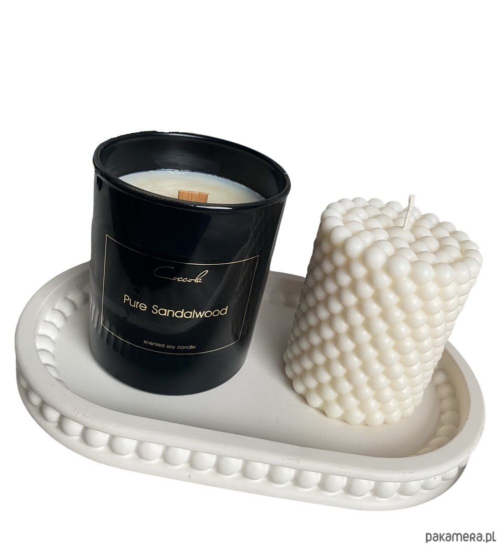 Wprowadź do swojego wnętrza ciepły, elegancki klimat dzięki luksusowemu zestawowi ręcznie wykonanych świec w odcieniu bieli i czerni, dodatkowo z elegancką podstawką.
