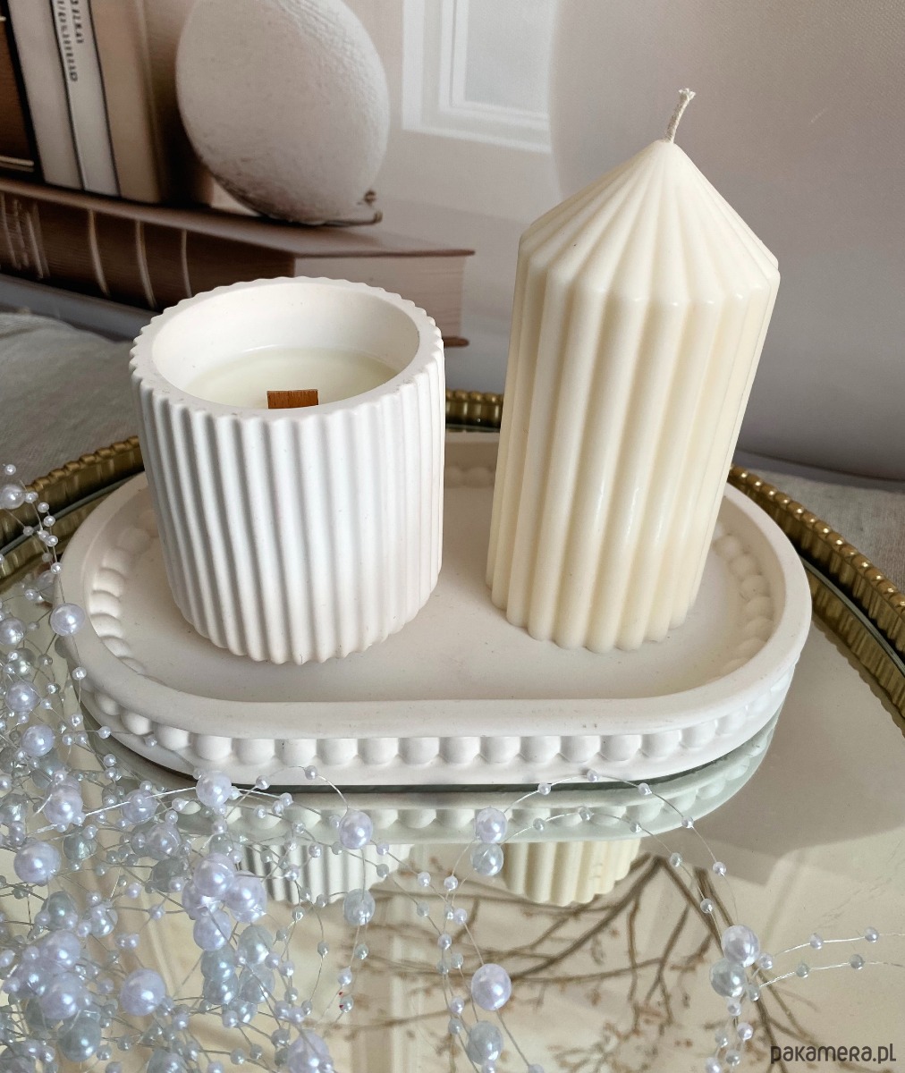 Wprowadź do swojego wnętrza ciepły, elegancki klimat dzięki luksusowemu zestawowi ręcznie wykonanych świec w odcieniu bieli, dodatkowo z elegancką podstawką.