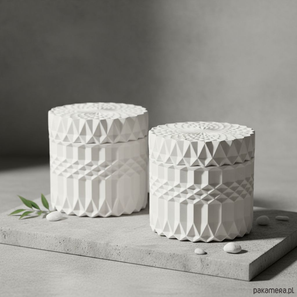 Zestaw obejmuje dwie świece w naczyniu gipsowym.