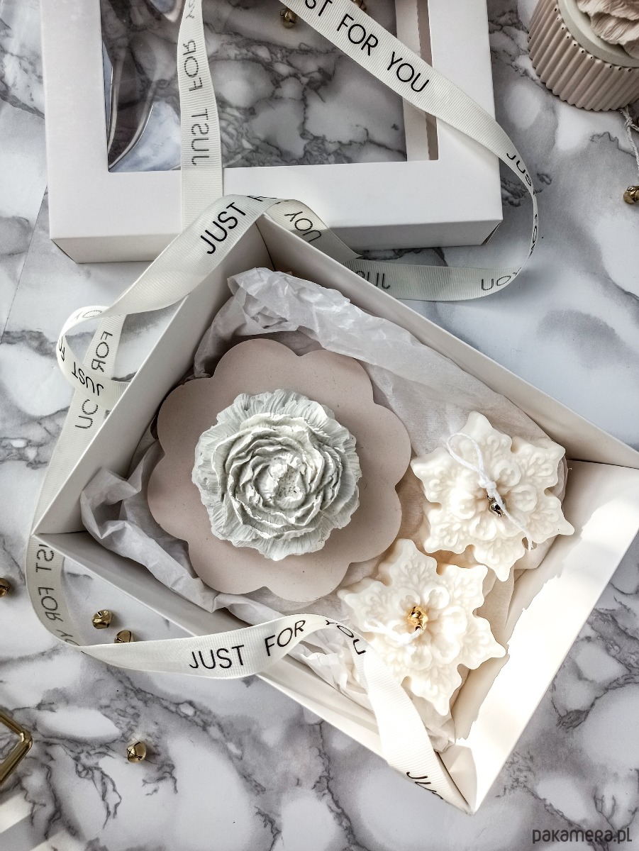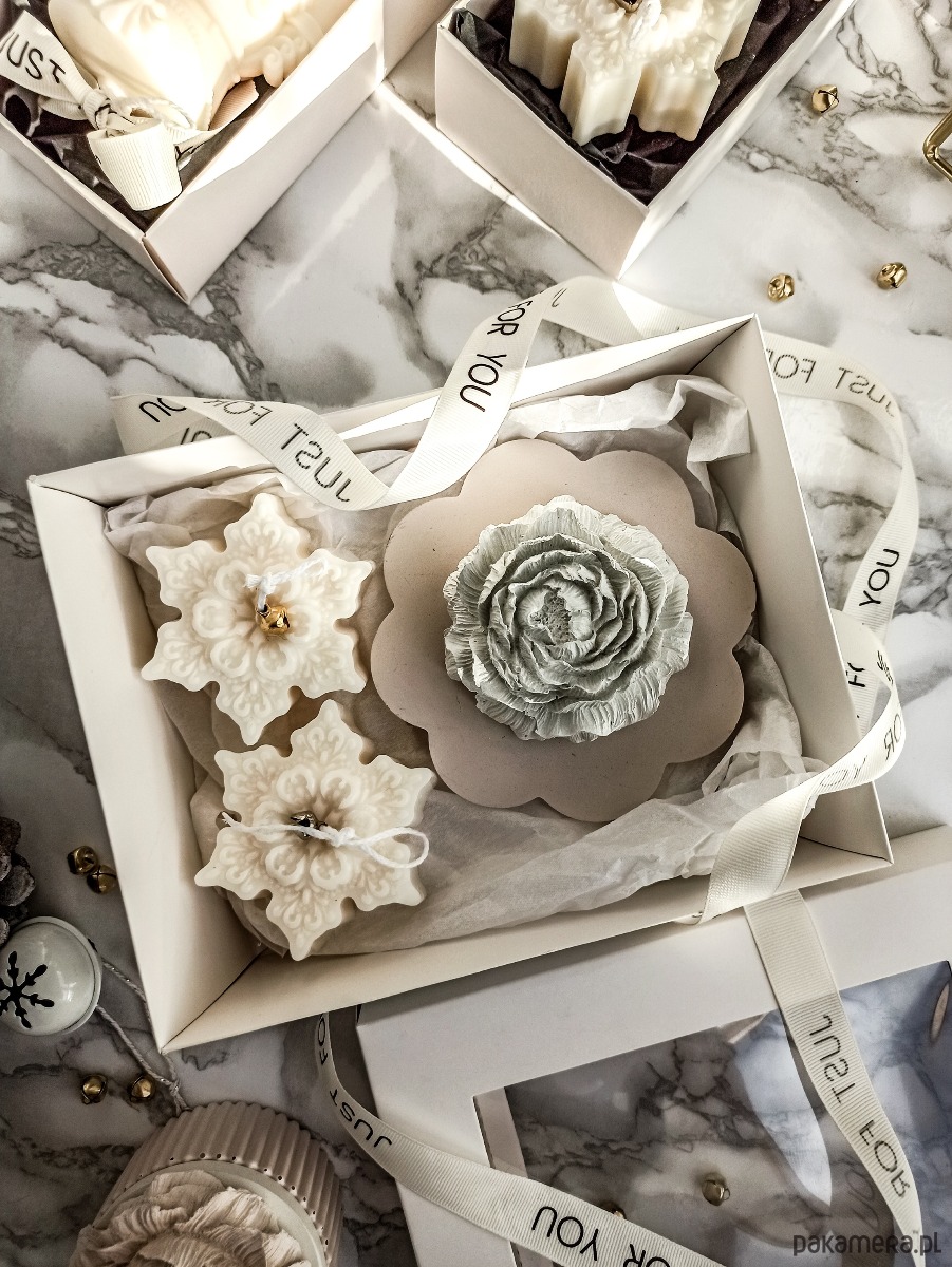 Elegancki box prezentowy dla wyjątkowej osoby. Ręcznie wykonane dekoracje z białego betonu architektonicznego będą pięknym dodatkiem do każdego wnętrza,a eleganckie świeczki sojowe dodadzą przytulnego blasku każdemu wnętrzu.