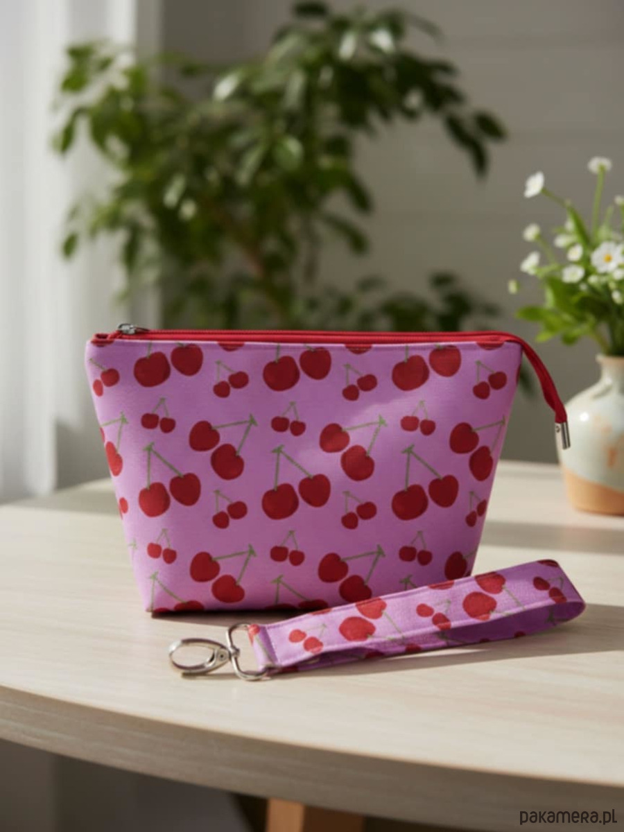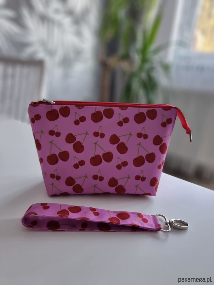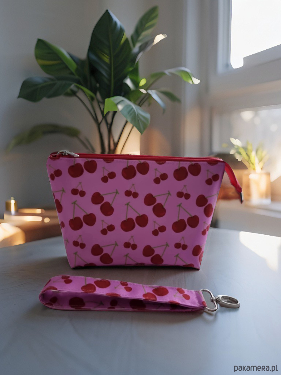 Średniej wielkości kosmetyczka M na różowym tle w czerwone wisienki z czerwonym zamkiem i srebrnym suwakiem, wraz z pasującą smyczą do kluczy z karabińczykiem- wszystko w tym samym wzorze. Wykonane z tkaniny wodoodpornej 100% poliester, wnętrze kosmetyczki wykończono bordową podszewką z małą kieszonką na drobiazgi.