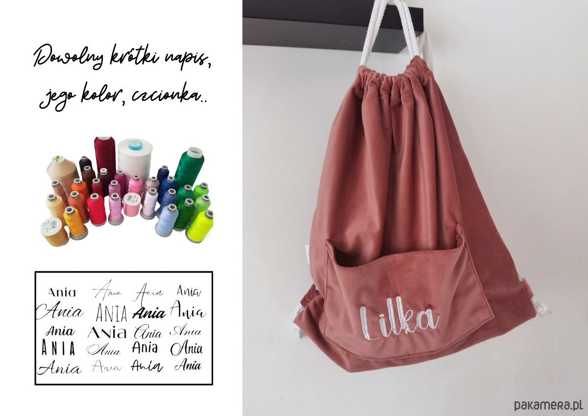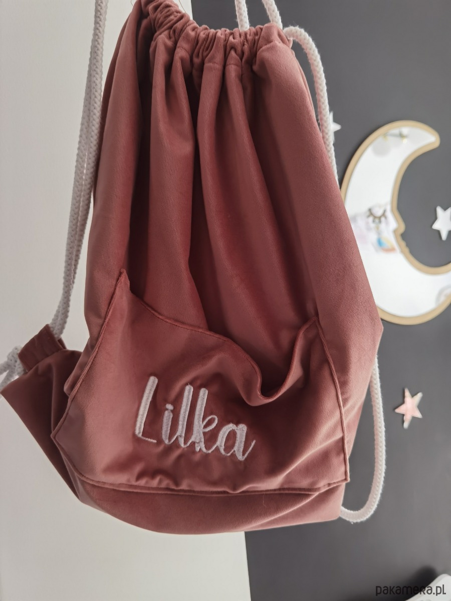 Wykonany z grubej, przyjemnej w dotyku i łatwej w utrzymaniu czystości tkaniny - velvetu. Różne kolory do wyboru. Plecak może mieć kieszonkę, uszy króliczka, misia, może być też gładki, z falbanką, z samym napisem. Jest pojemny, jego rozmiar to 40x42 cm. Wejdą do niego i buty i ubranka, teczka A4. Jeżeli zależy Państwu na innym rozmiarze - możemy nim minimalnie manewrować.