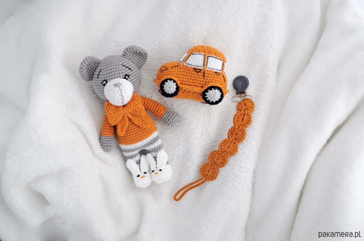 - zawieszki do smoczka z klipsem w kształcie koła; dł całości ok. 23cm (prać ręcznie, po wyschnięciu wyprasować)