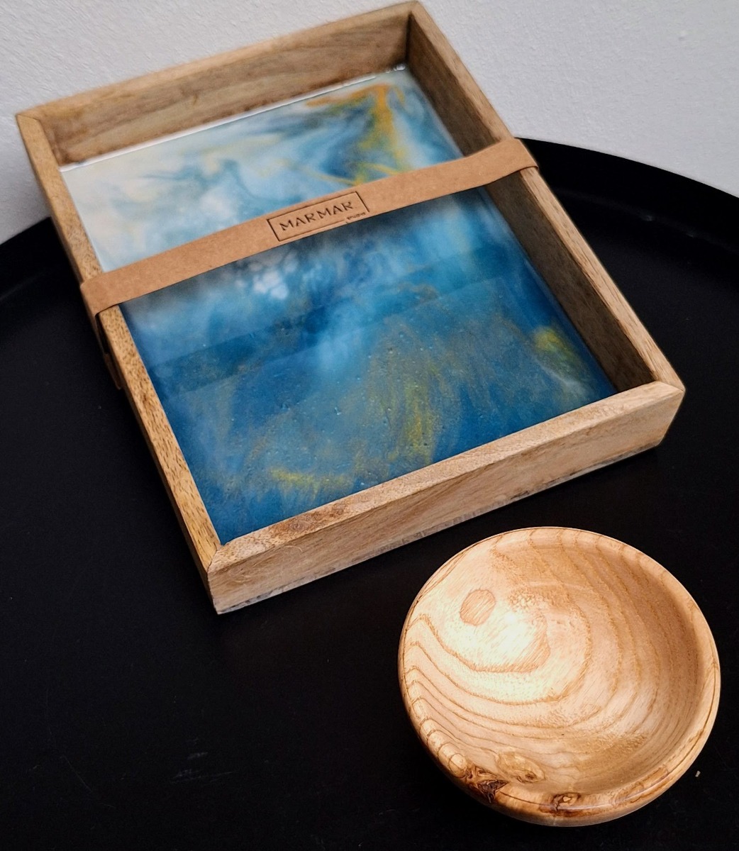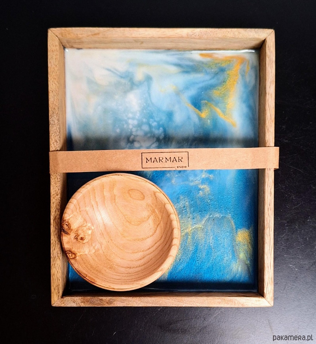 Zestaw doskonale sprawdzi się jako prezent dla miłośników designu, natury i pięknych detali. Połączenie naturalnego drewna z energetyczną głębią żywicy tworzy kompozycję, która jest jednocześnie praktyczna i dekoracyjna.