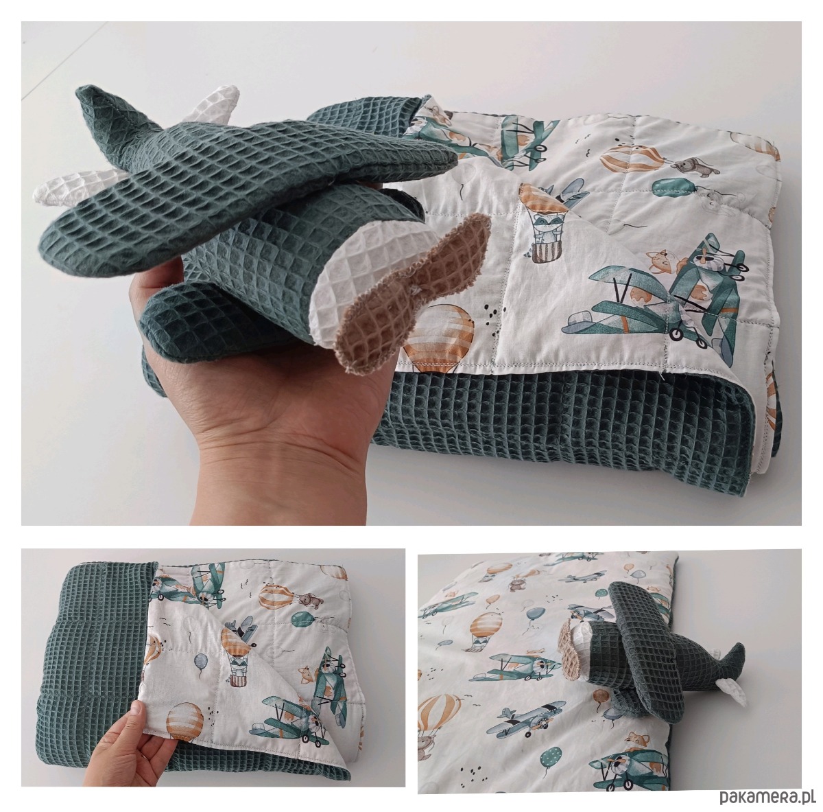Jeśli Twoje dziecko jest małe może mieć kocyk 90 x 120, dla większych polecamy 100 x 135. Kocyk może być wykonany z jednej warstwy grubej bawełny - wafla bawełnianego lub z minky. Możemy uszyć go także z dwóch warstw materiału (np muślinu, bawełny, minky + bawełna) a środek wypełnić antyalergiczną owatą silikonową (kocyk - kołderka). Cena zestawu zależna jest od rozmiaru i wyboru tkanin. Dlatego prosimy o wcześniejsze skontaktowanie się:)