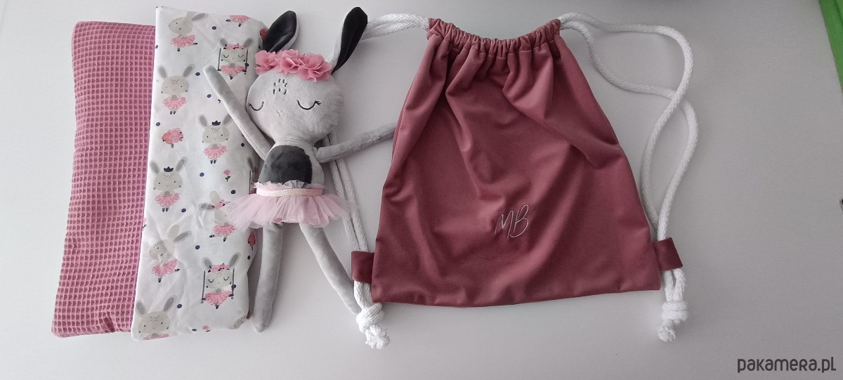Szyjemy też workoplecaczek na ubranka do przedszkola. Worek wykonujemy z tkaniny velvetowej - grubej, wytrzymałej, która się tak szybko nie brudzi. Ma bawełniane grube szelki które nie wżynają się w plecy. Może być prosty lub być w kształcie misia, króliczka, z falbanką, dwukolorowy.