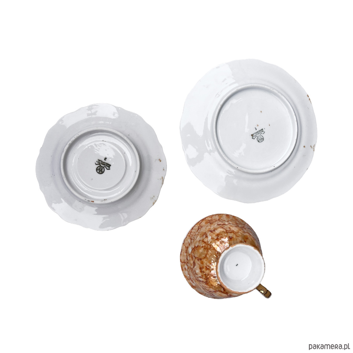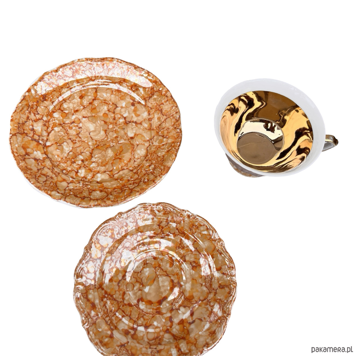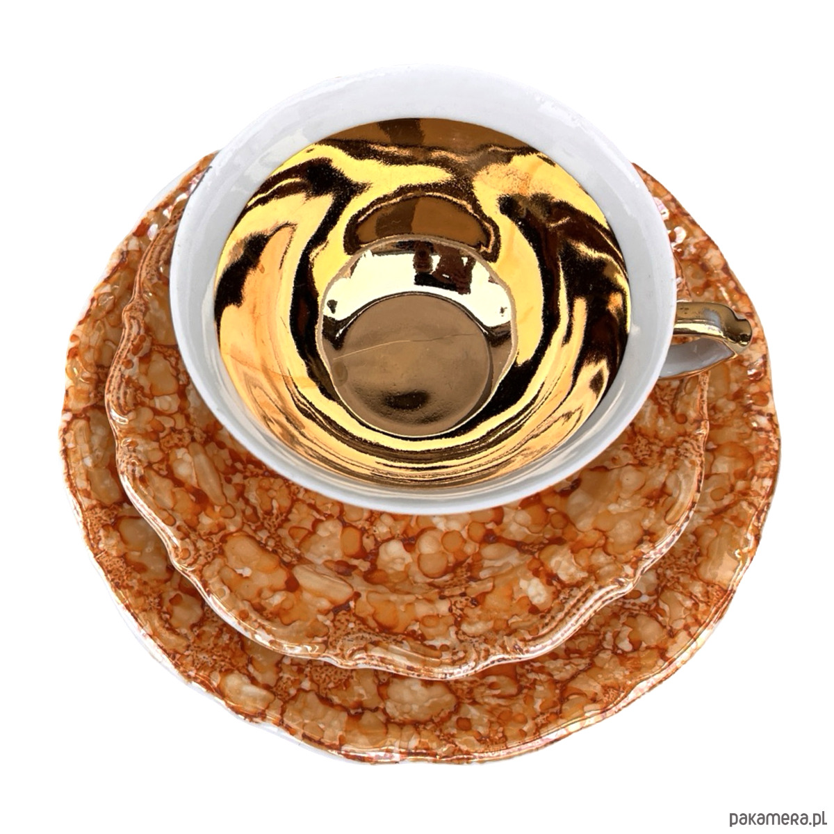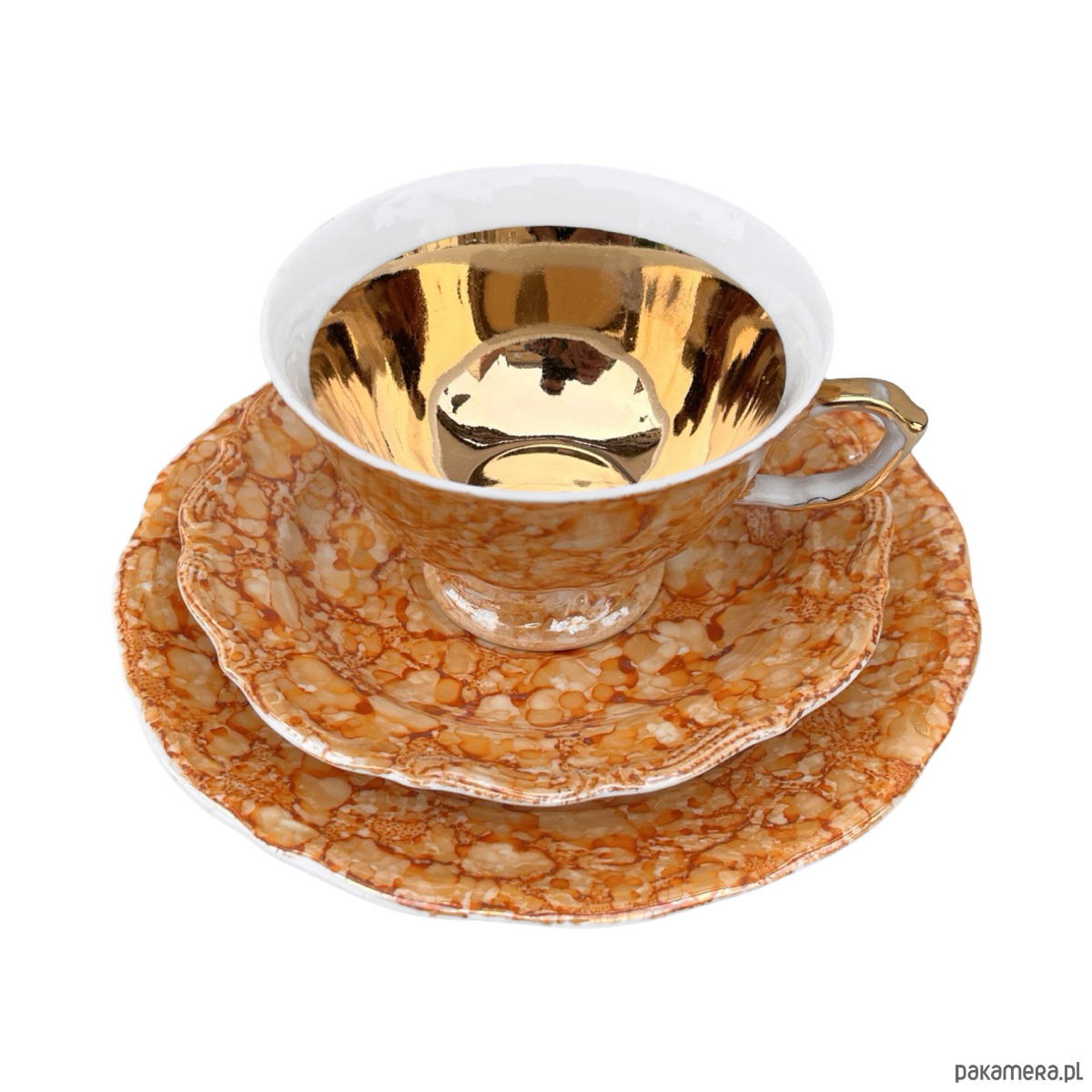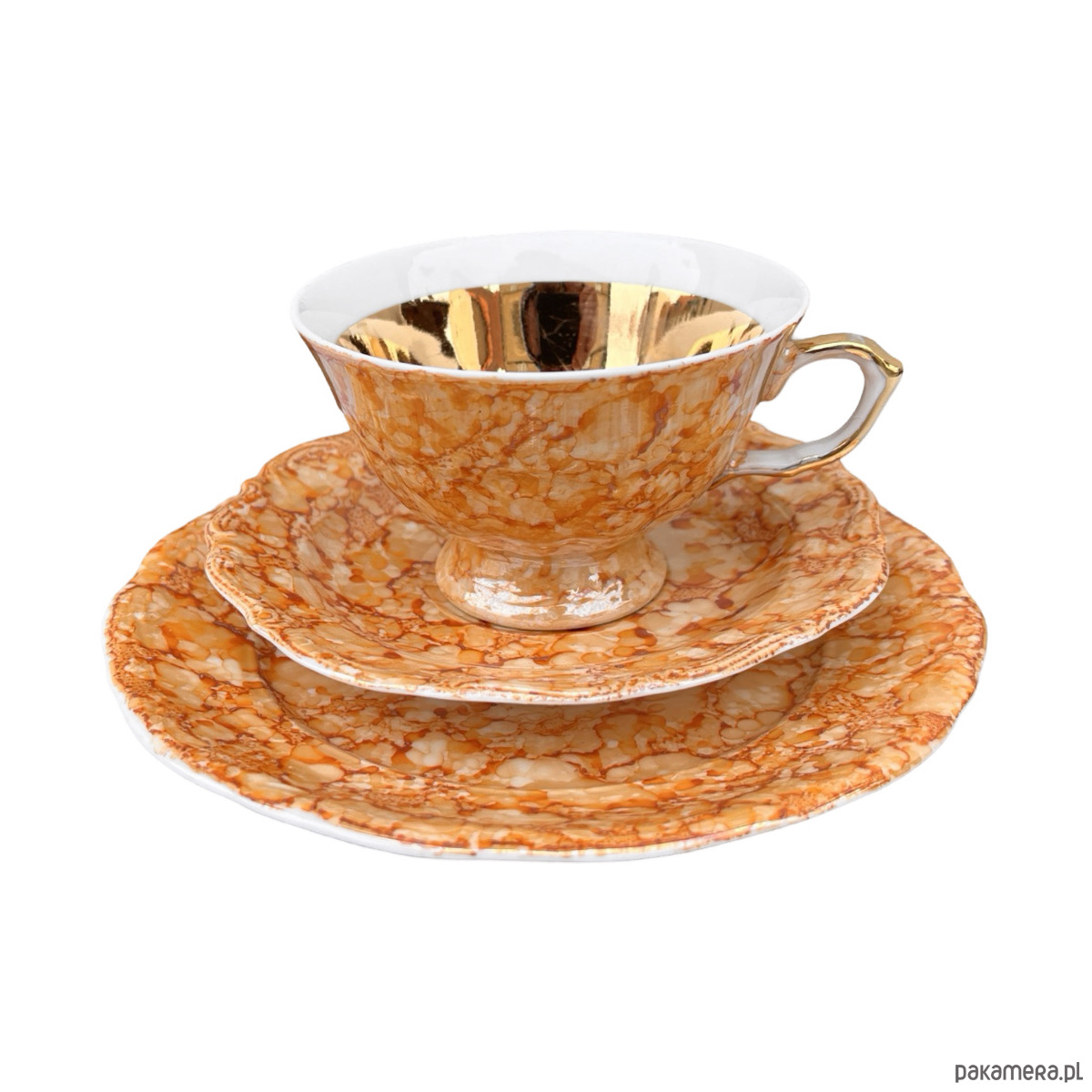 Zestaw śniadaniowy pochodzi z lat 70. wyprodukowany przez Zakłady Porcelany Stołowej Krzysztof w Wałbrzychu. Zestaw składa się z filiżanki, spodka i małego talerzyka. Zestaw w malaturze marmurkowej pomarańczowej z elementami złoconymi. Przedmiot w stanie oryginalnym, nosi normalne ślady użytkowania. Przedmiot sygnowany.