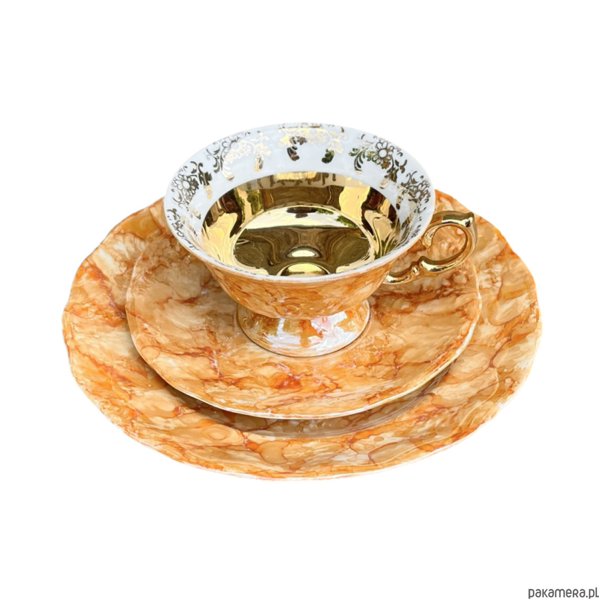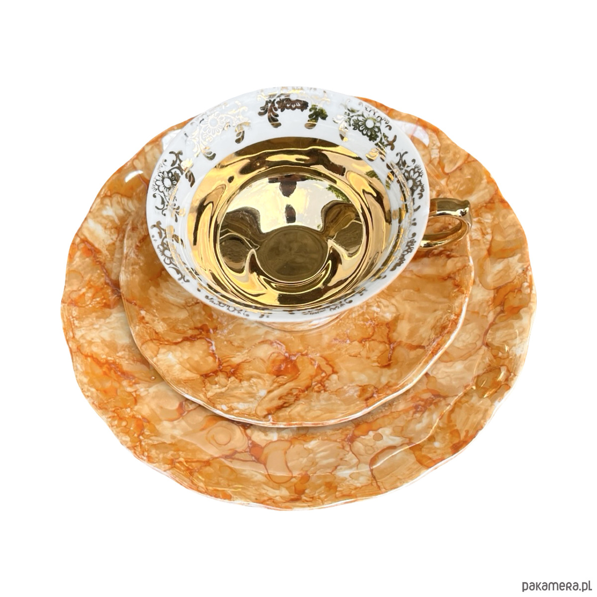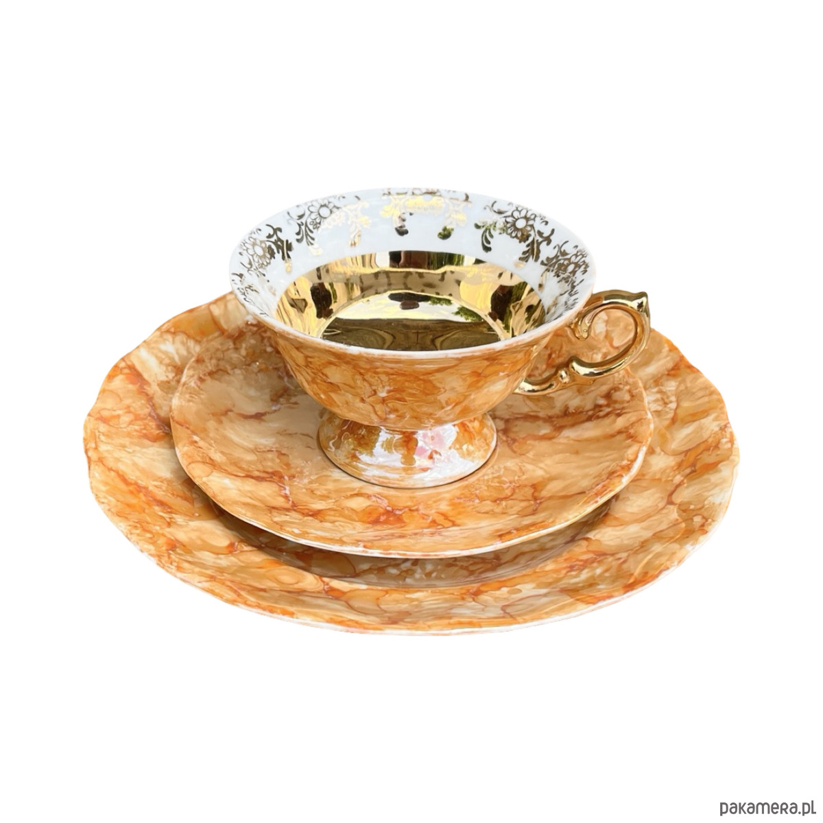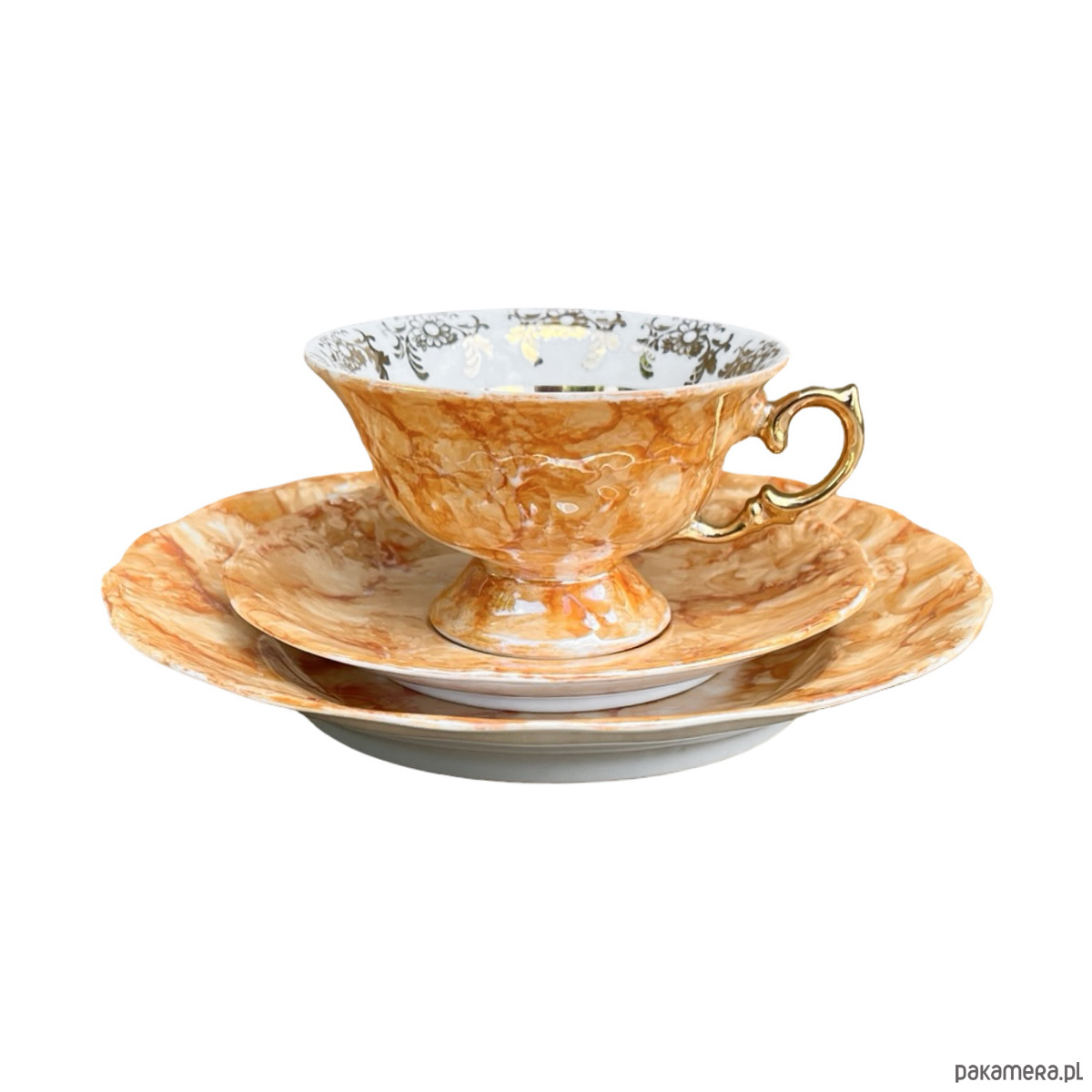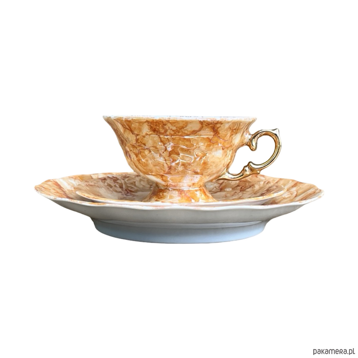 Zestaw śniadaniowy pochodzi z lat 70. wyprodukowany przez Zakłady Porcelany Stołowej Krzysztof w Wałbrzychu. Zestaw składa się z filiżanki, spodka i małego talerzyka. Zestaw w malaturze marmurkowej pomarańczowej z elementami złoconymi. Przedmiot w stanie oryginalnym, nosi normalne ślady użytkowania. Przedmiot sygnowany.Uwaga zestaw "kooperacyjny"- w latach 70. w Polsce powszechne było, że poszczególne części zastawy były produkowane w różnych zakładach, a potem składane w całość.