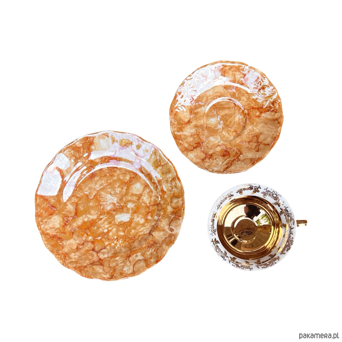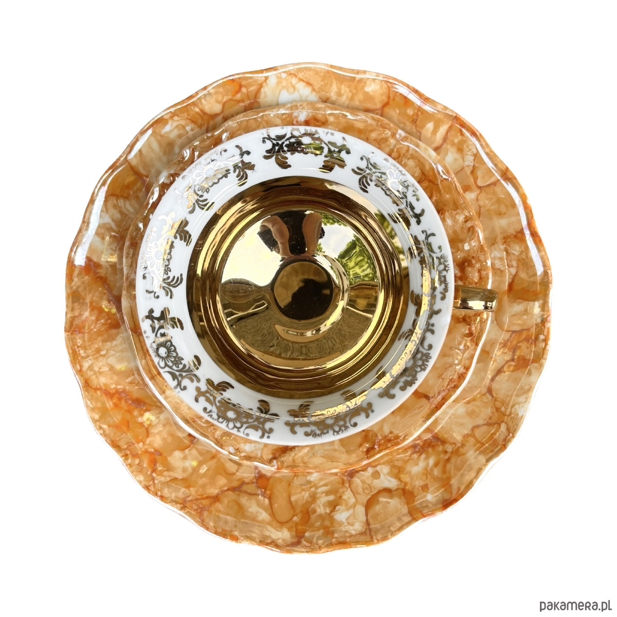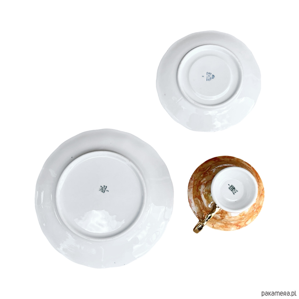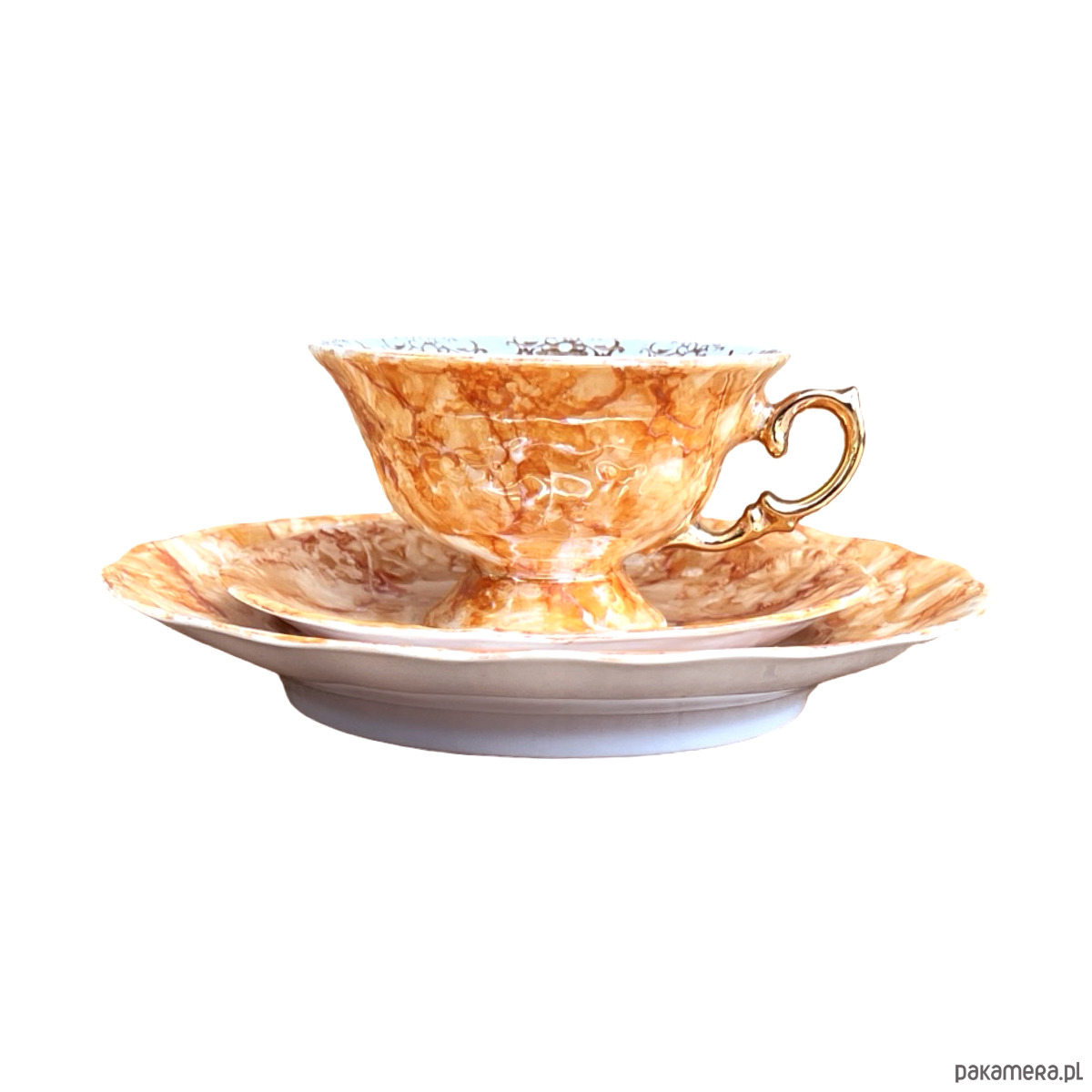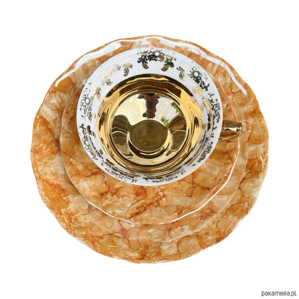 Zestaw śniadaniowy pochodzi z lat 70. wyprodukowany przez Zakłady Porcelany Stołowej Krzysztof w Wałbrzychu. Zestaw składa się z filiżanki, spodka i małego talerzyka. Zestaw w malaturze marmurkowej pomarańczowej z elementami złoconymi. Przedmiot w stanie oryginalnym, nosi normalne ślady użytkowania. Przedmiot sygnowany.Uwaga zestaw "kooperacyjny"- w latach 70. w Polsce powszechne było, że poszczególne części zastawy były produkowane w różnych zakładach, a potem składane w całość.