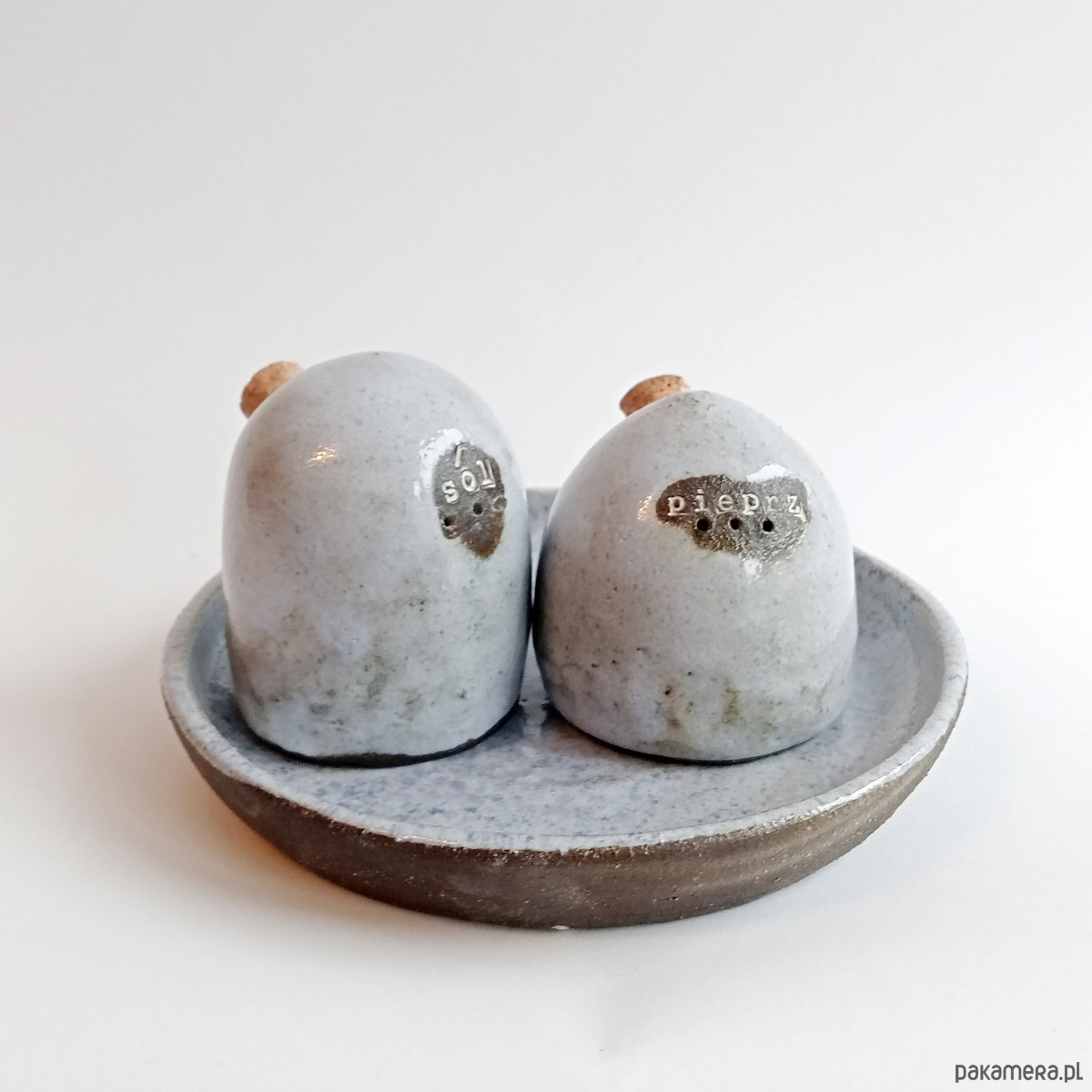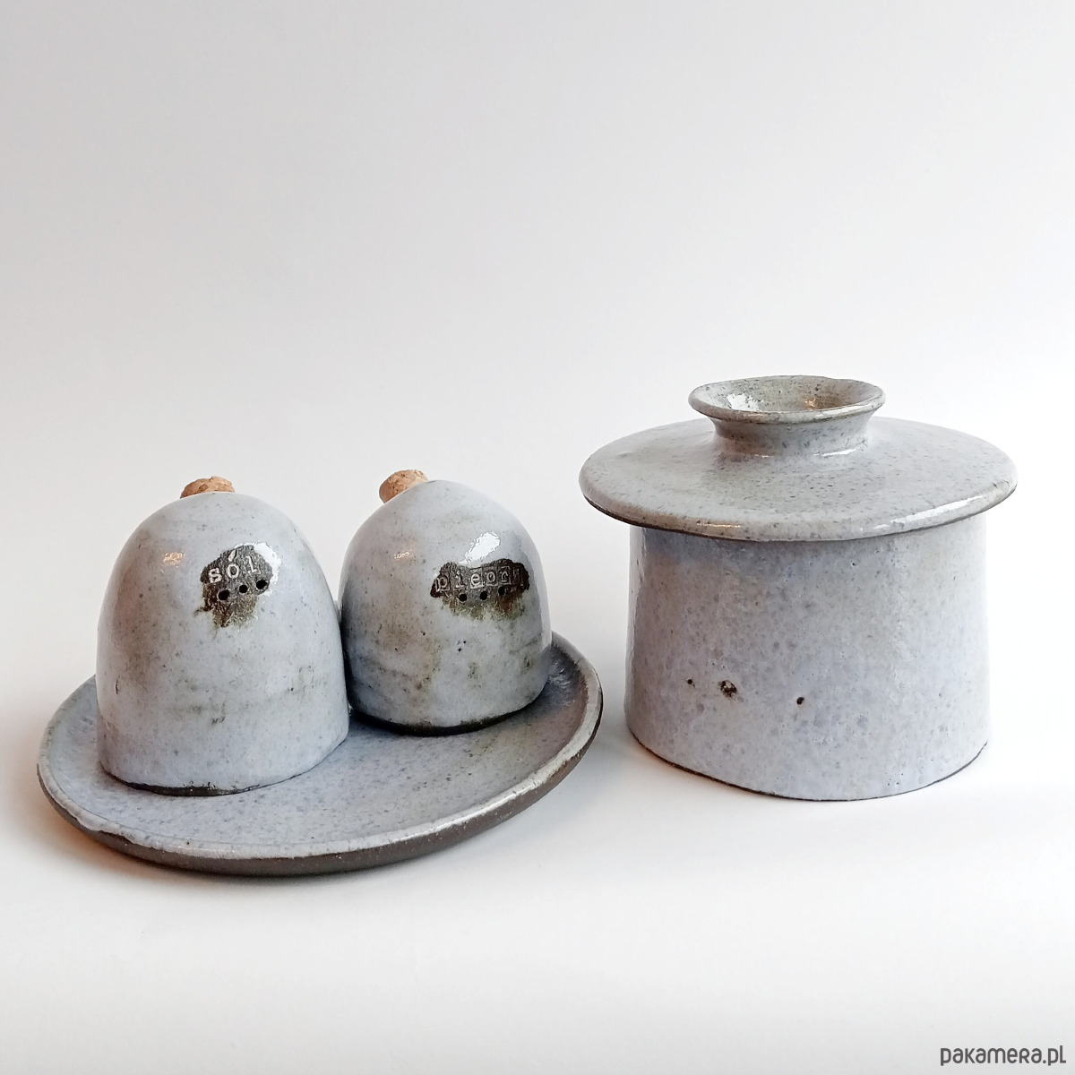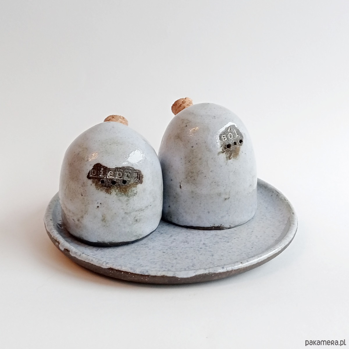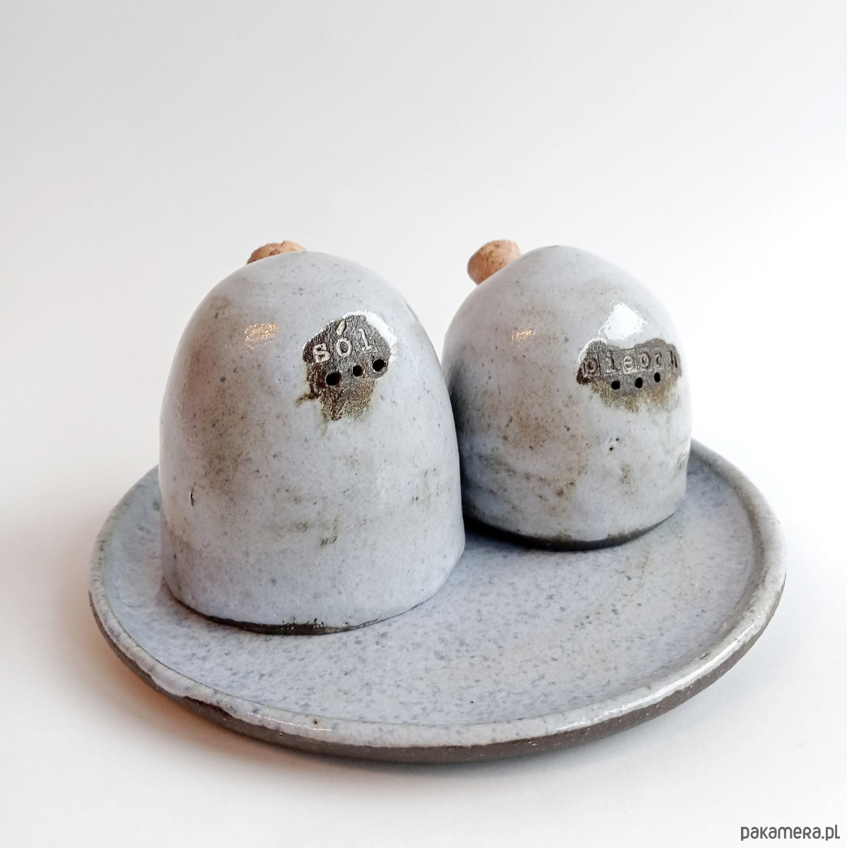 Ręcznie toczony zestaw ceramicznych utensyliów na stół, składający się z solniczki i pieprzniczki z podstawką.