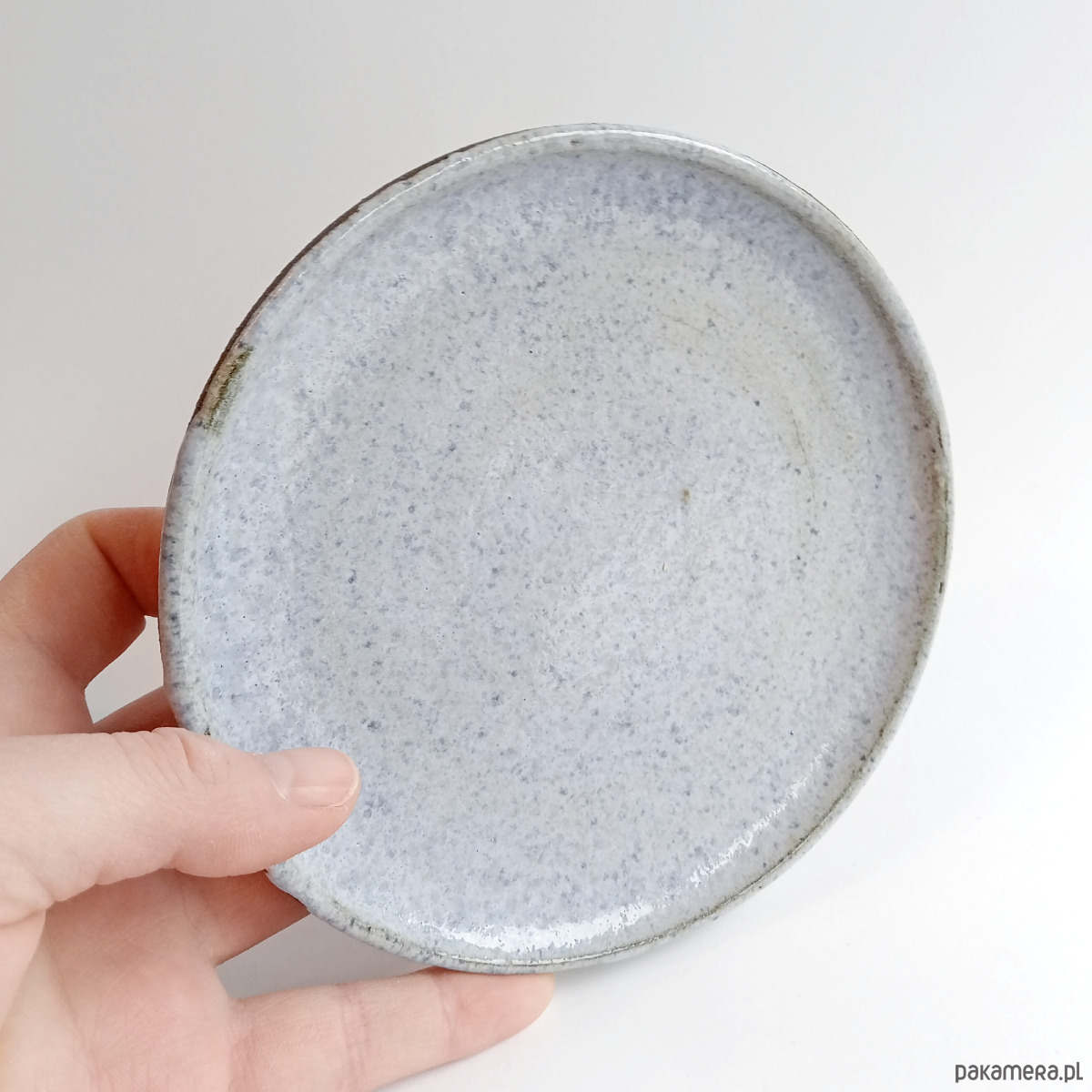 Zestaw wykonany został ręcznie na kole z ciemnej gliny z wyczuwalnym szamotem, po czym odbite i wycięte zostały w nim detale, czyniąc ze zwykłych, codziennie używanych rzeczy, niepowtarzalne, przyciągające oko i dłoń przedmioty. Cały zestaw pokryty jest szkliwem jasnoniebieskim w kropeczki.