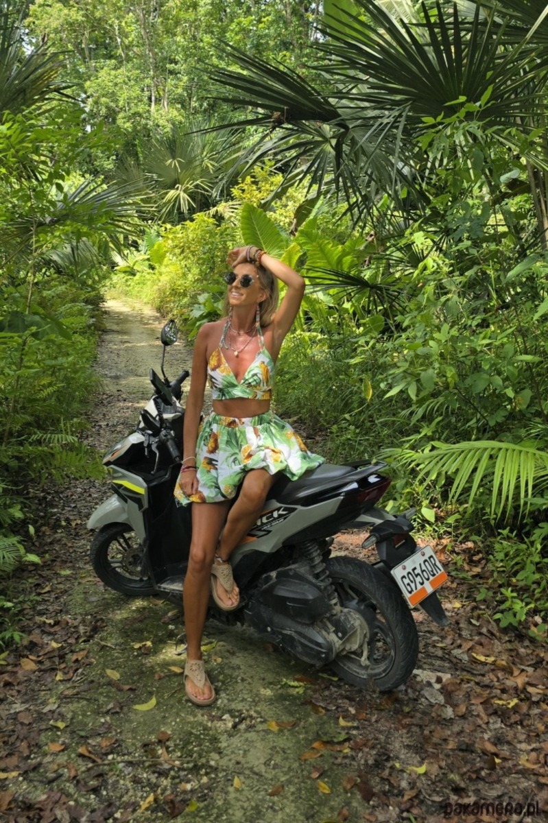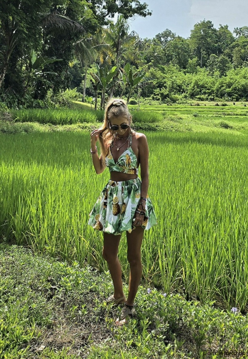 Zestaw spódnica bombka mini z wszytymi krótkimi spodenkami pod spodem oraz krótki top wiązany na plecach.