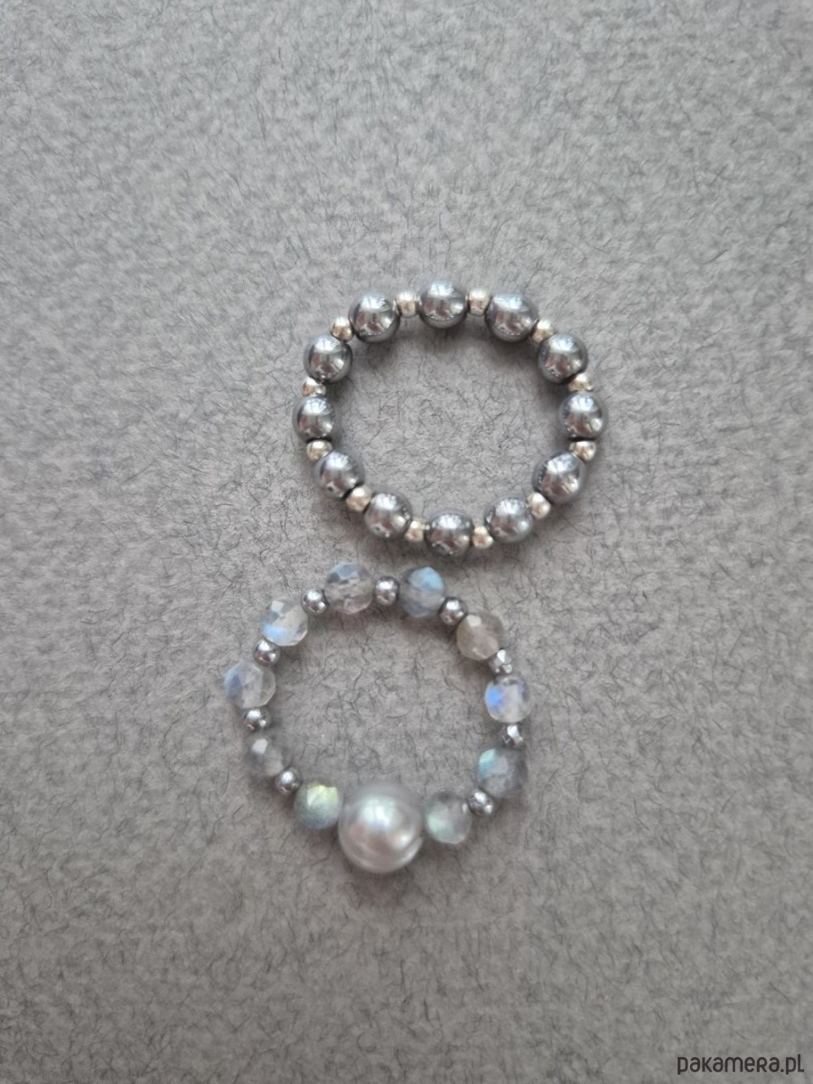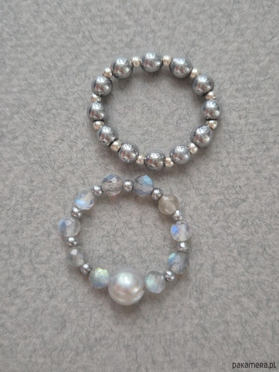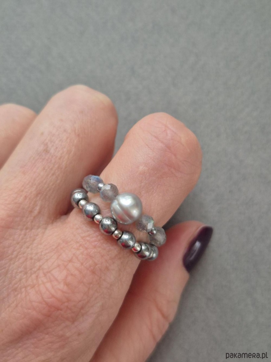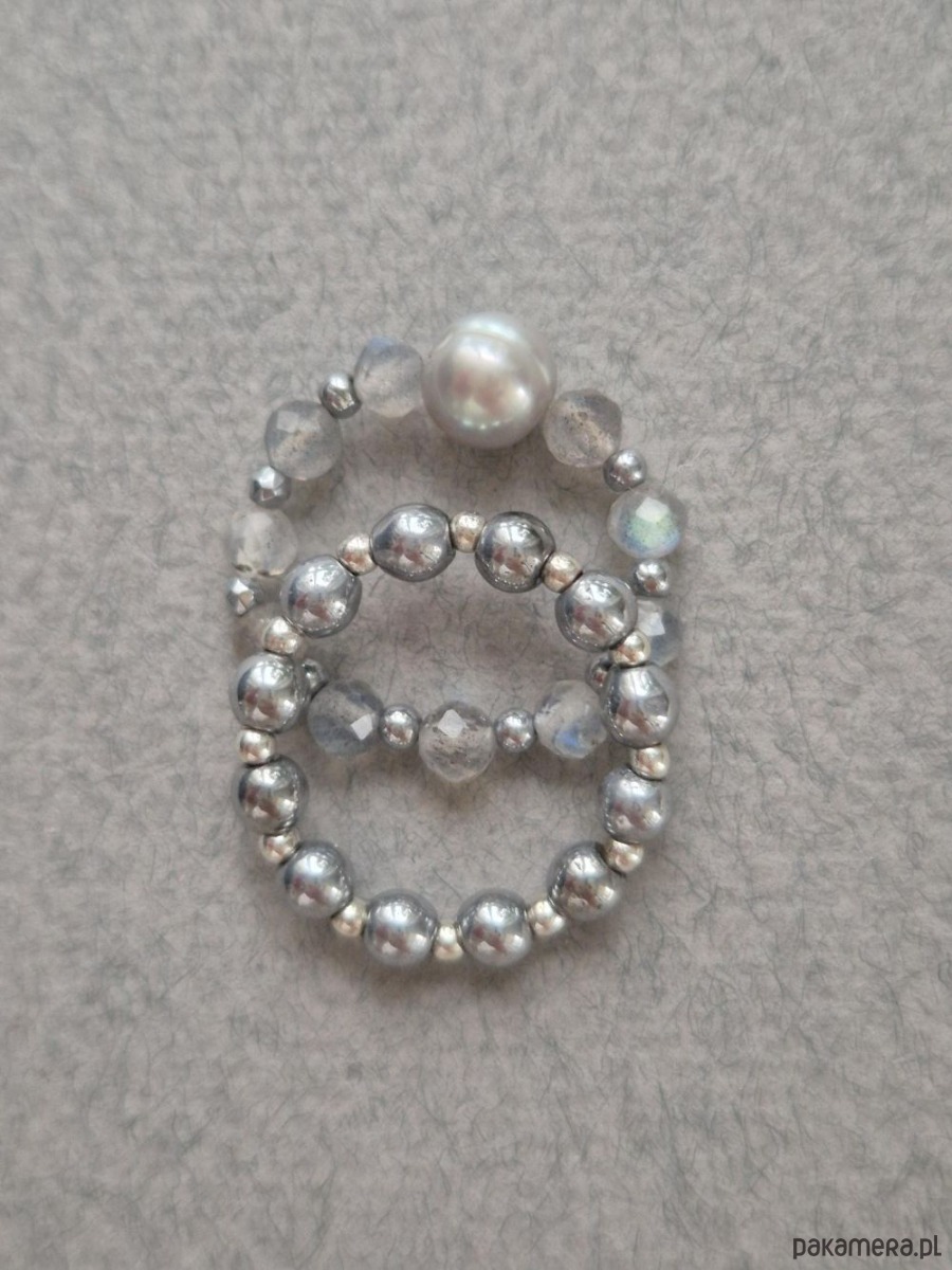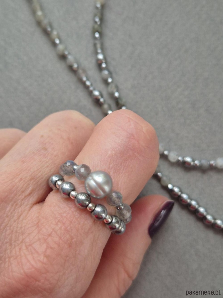 Zestaw pierścionków w chłodnych odcieniach szarości wykonanych ręcznie z labradorytów, szarej perły i hematytów w srebrnym odcieniu. Pierścionek z hematytów pięknie podkreśla detale labradorytowego pierścionka, który mieni się niebieskimi ognikami. Zwieńczeniem szarego pierścionka jest szara perła naturalna.