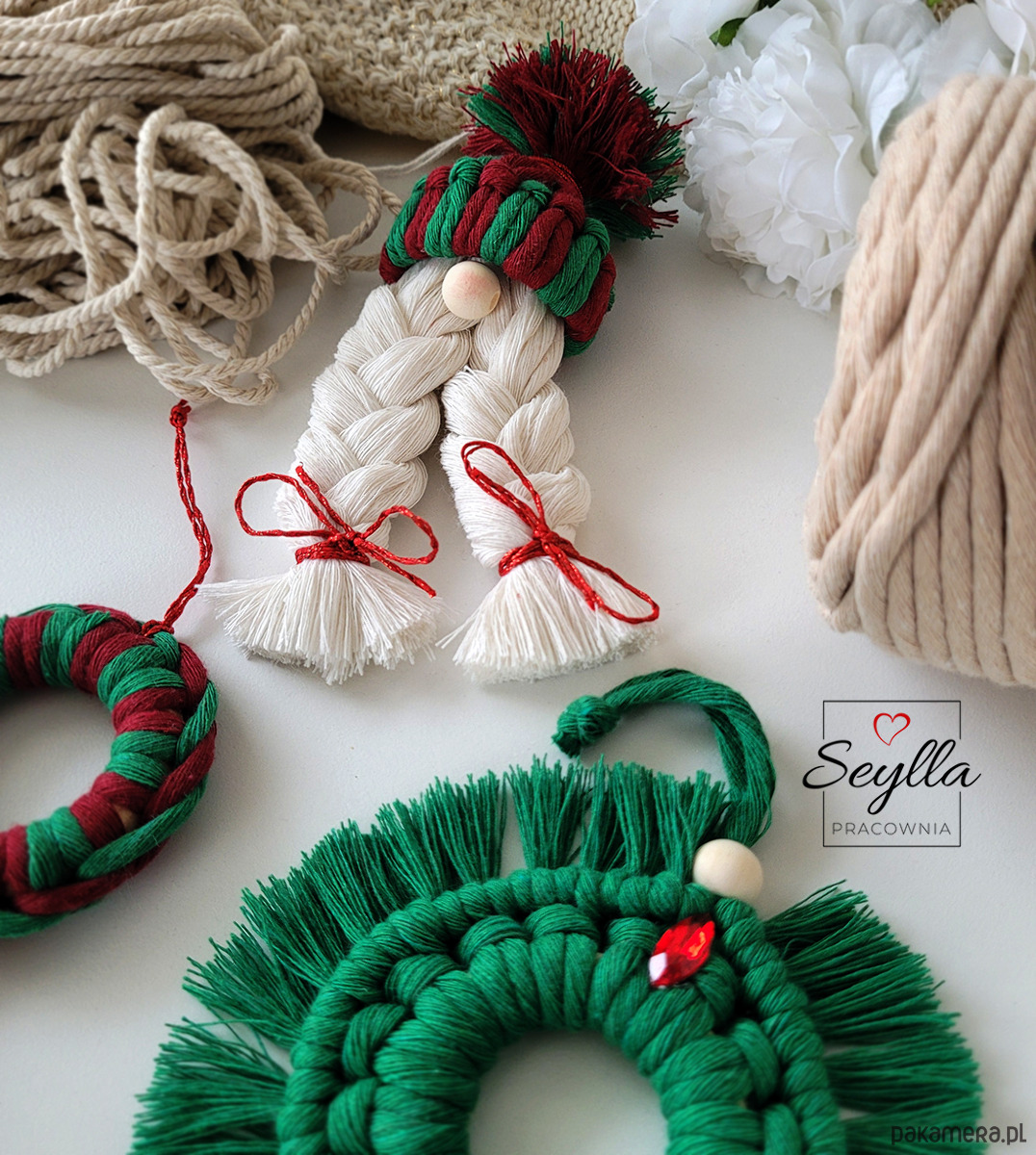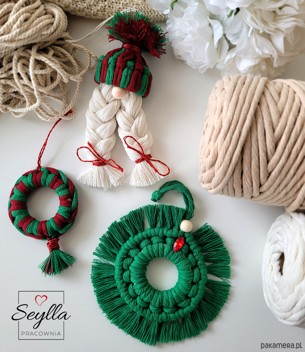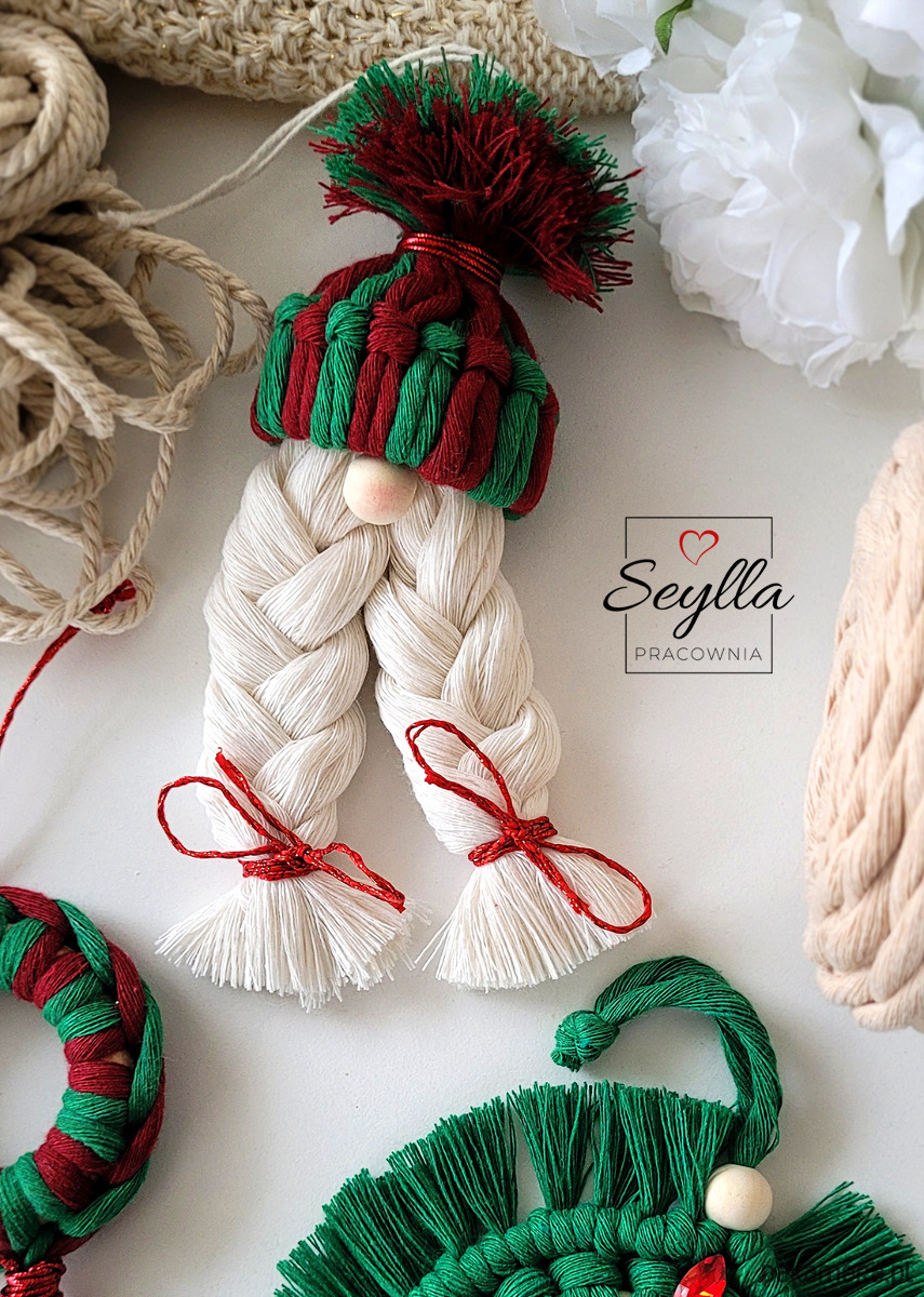 Świąteczny zestaw składający się z trzech zawieszek makramowych w kolorze zieleni, borda i ecru. Jedna zawieszka przyozdobiona czerwonym kryształkiem.