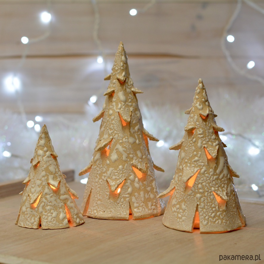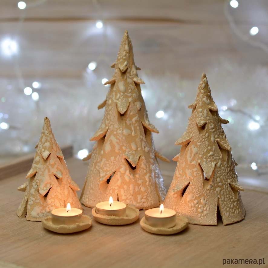 Swiąteczny zestaw trzech latarenek ceramicznych w kształcie choinki. Choinki zostały uformowane ręcznie i poszkliwione tak, aby sprawiały wrażenie obsypanych pierwszym śniegiem. Każda choinka posiada w komplecie mały talerzyk pod tea-light. Zestaw będzie niecodzienną dekoracją świątecznego stołu. Opcjonalnie oferuję choinki na tacy o średnicy około 25 cm.