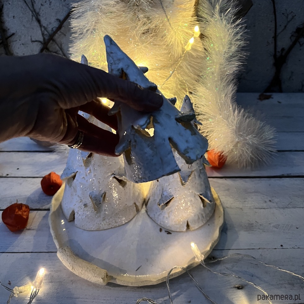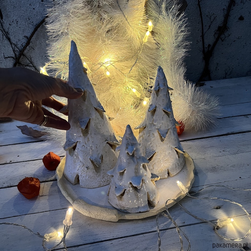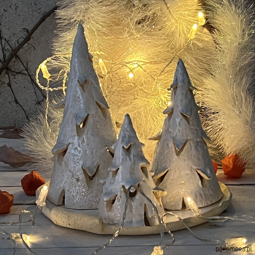 Zestaw trzech ręcznie wykonanych ceramicznych latarenek w kształcie choinki na tacy z uchwytami. To wyjątkowa dekoracja świątecznego stołu. Dekoracja jest uformowana z jasnej gliny szamotowej i poszkliwiona białym szkliwem w sposób, który przypomina naturalne czapy śnieżne. Można używać z tea lightami (uwaga czubek choinki może być gorący, należy chwytać w połowie) lub bez.