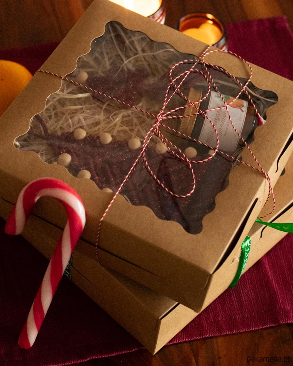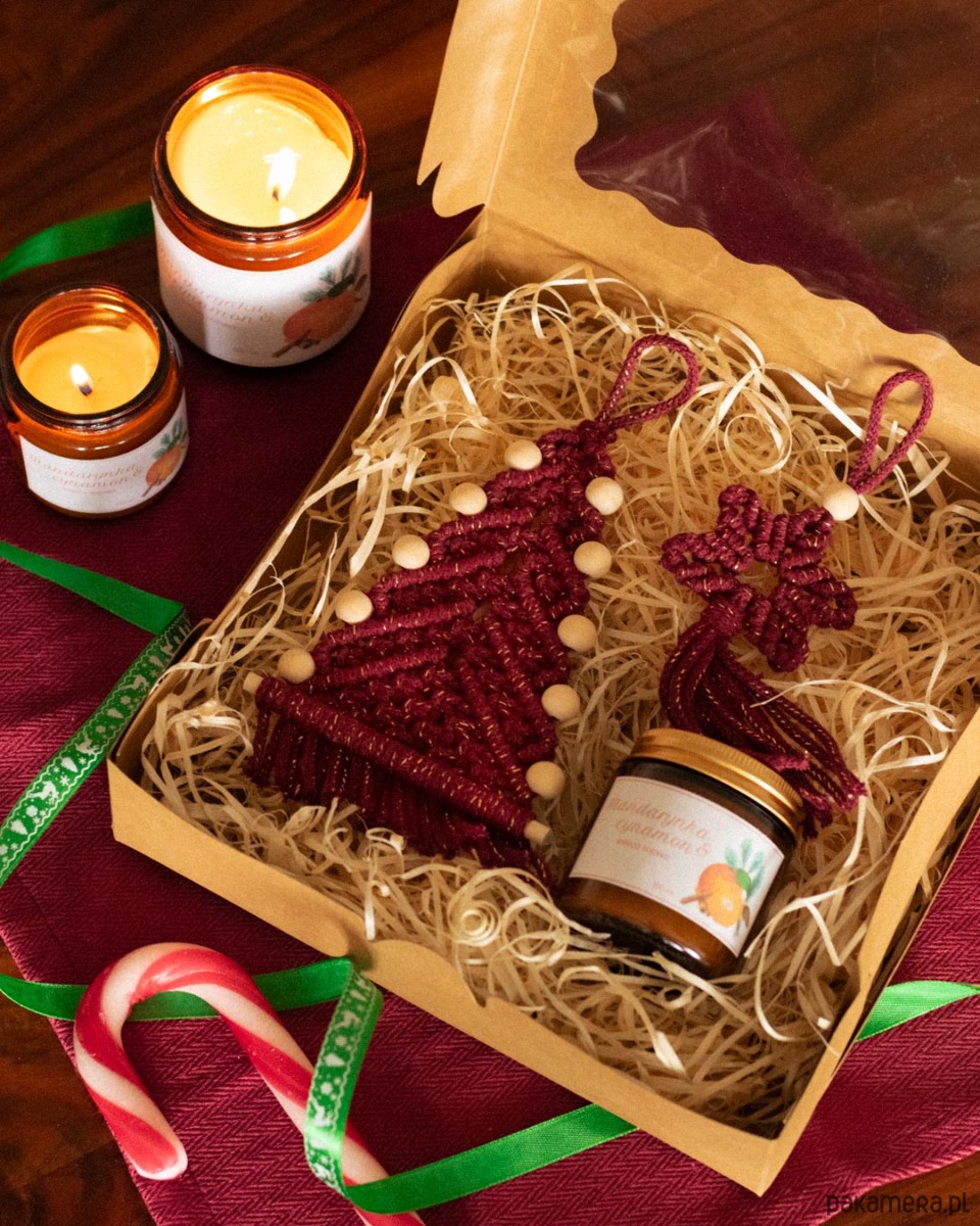 Świąteczny zestawy w kolorze czerwonym (dostępna również wersja zielona w osobnym ogłoszeniu). W każdym zestawie znajduje się choinka i gwiazdka z makramy oraz zimowa świeca sojowa z olejkami eterycznymi 100 ml o zapachu mandarynki, pomarańczy i cynamonu.