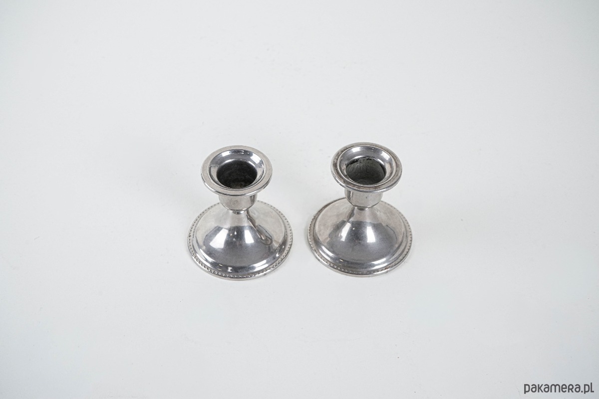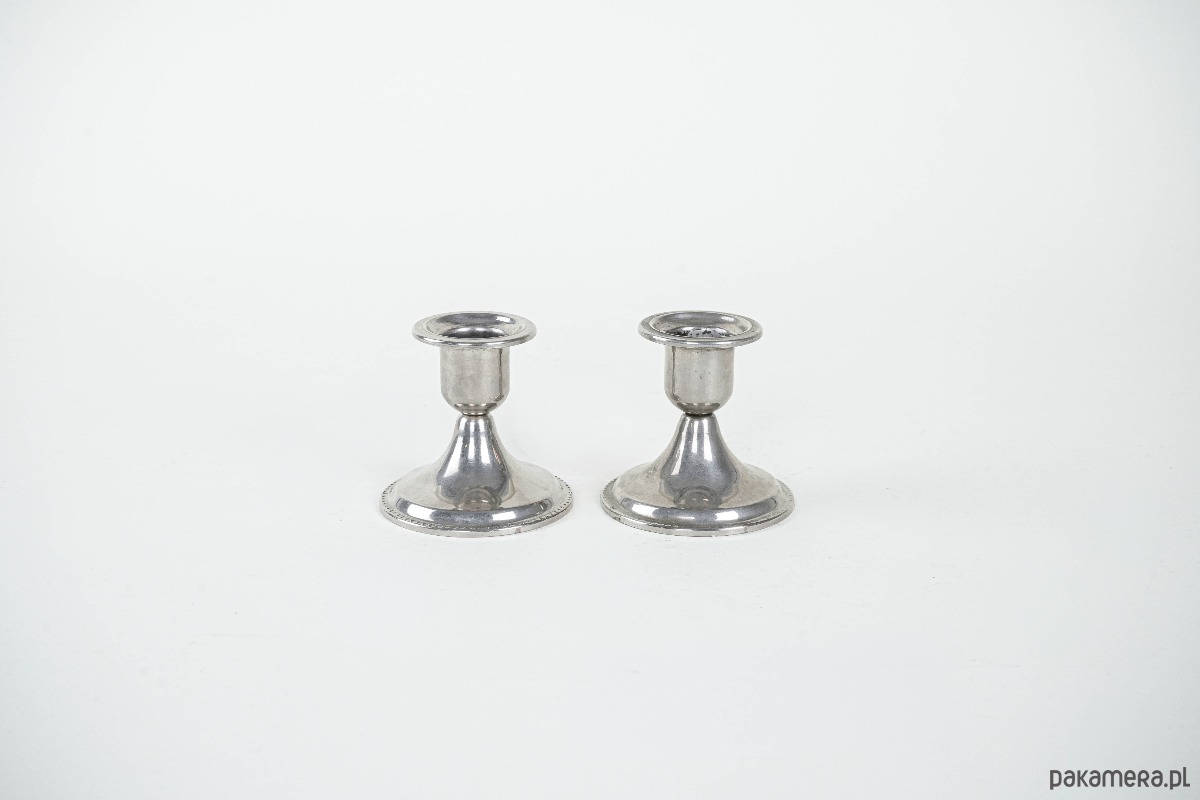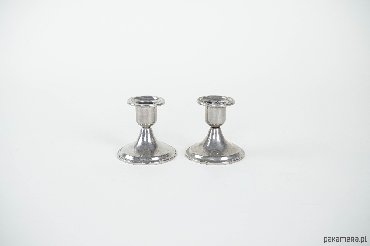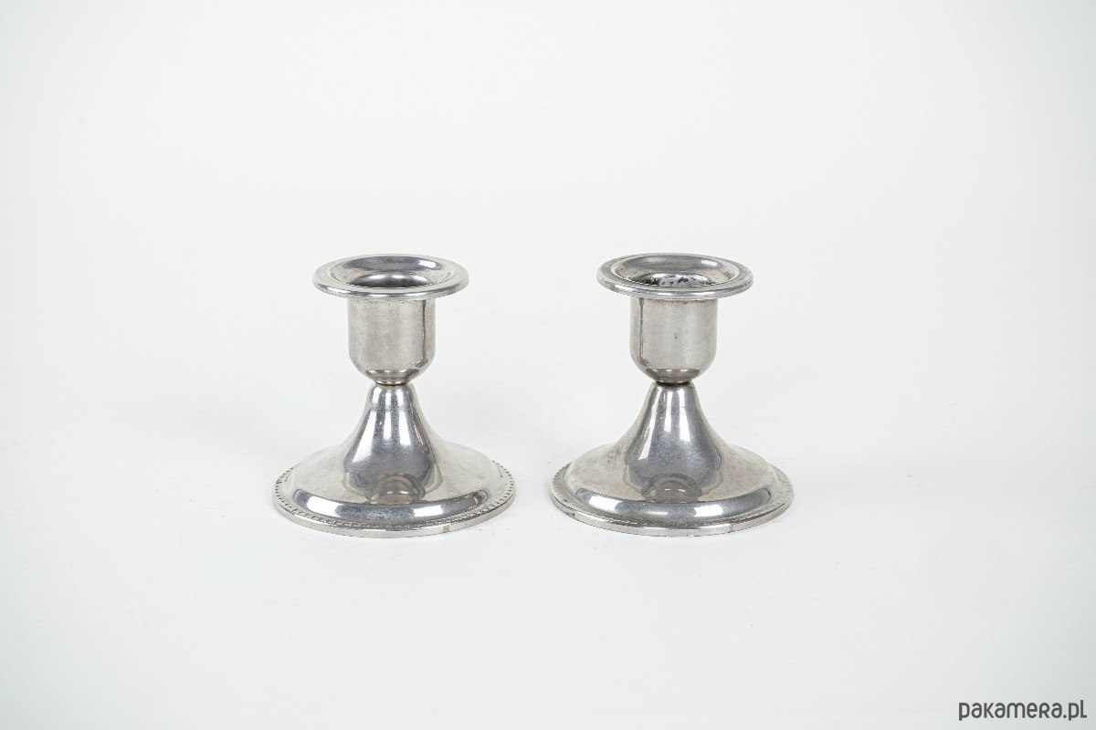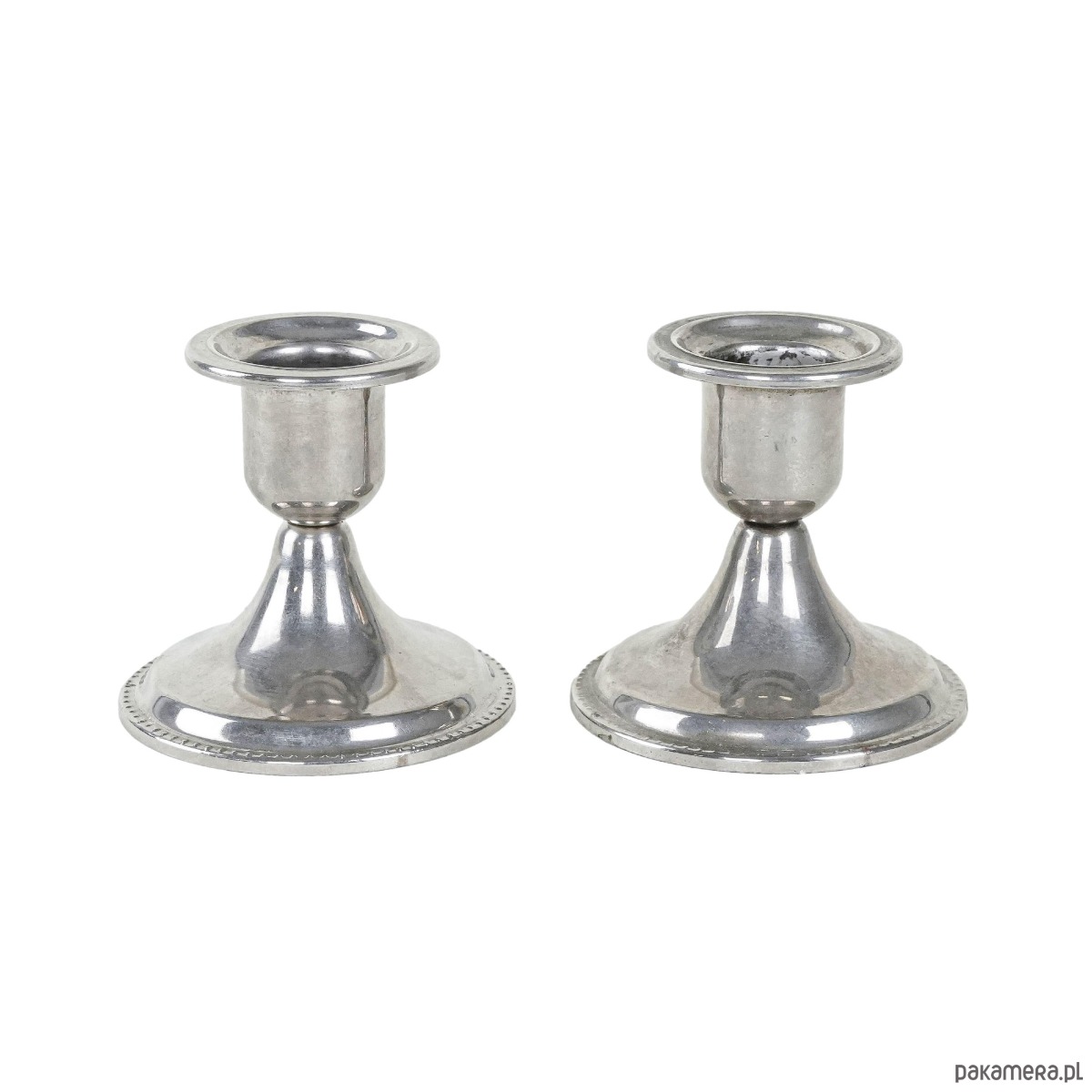 Para klasycznych, metalowych świeczników w srebrzystym odcieniu. Prosta forma z delikatnym zdobieniem na rancie podstawy nadaje im elegancki i ponadczasowy charakter. Idealne jako element dekoracyjny stołu lub komody.