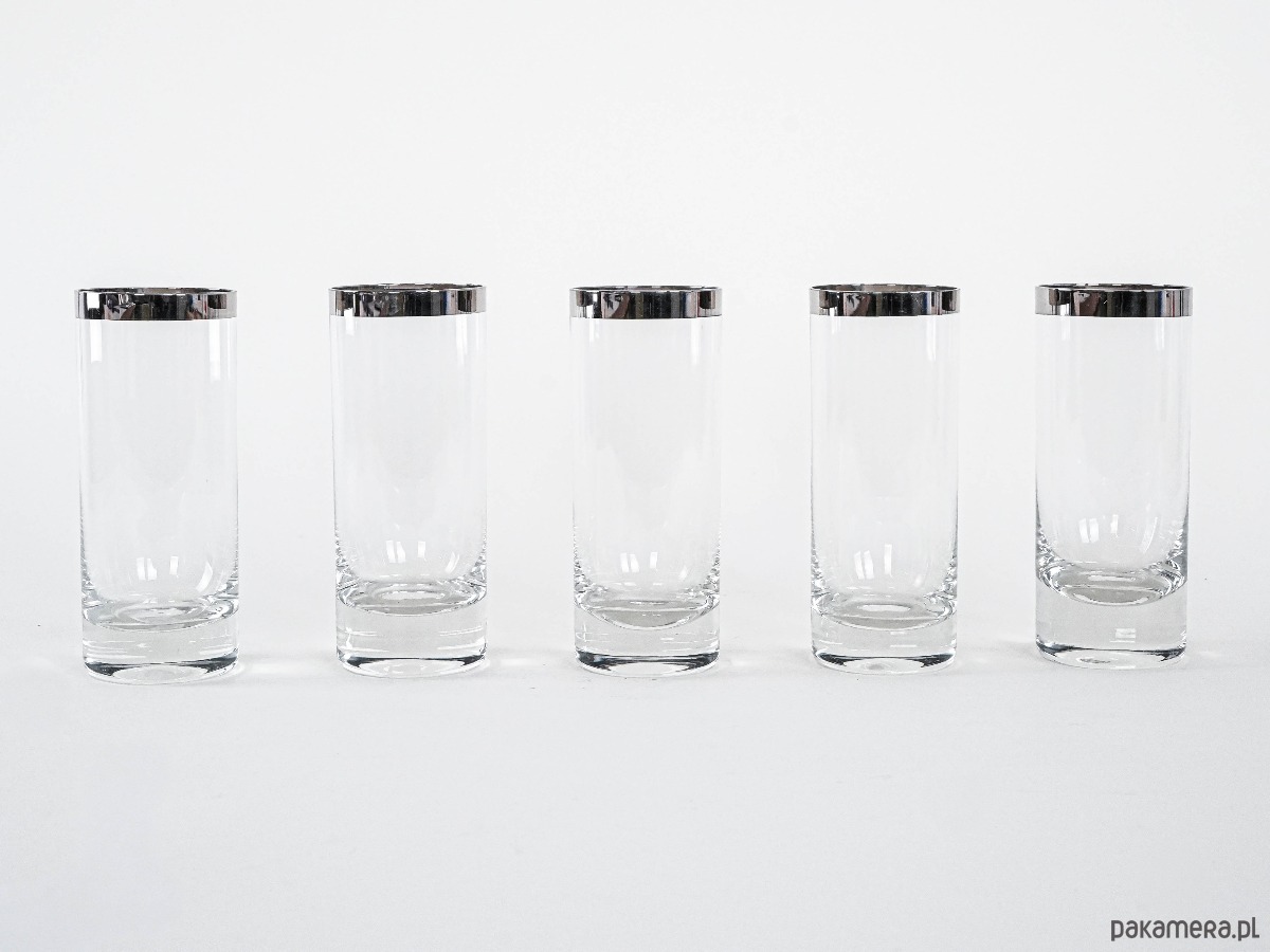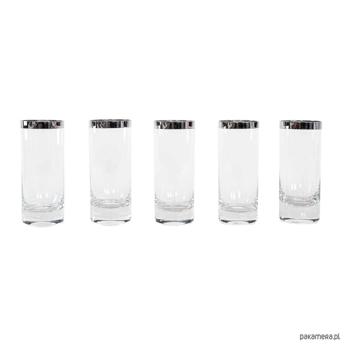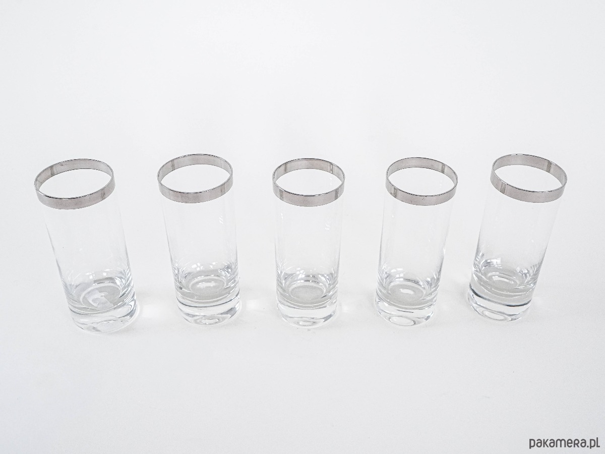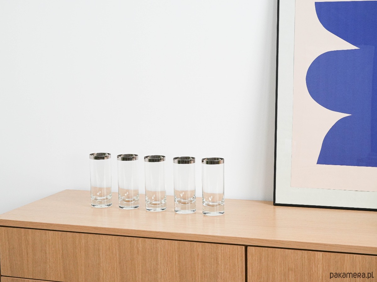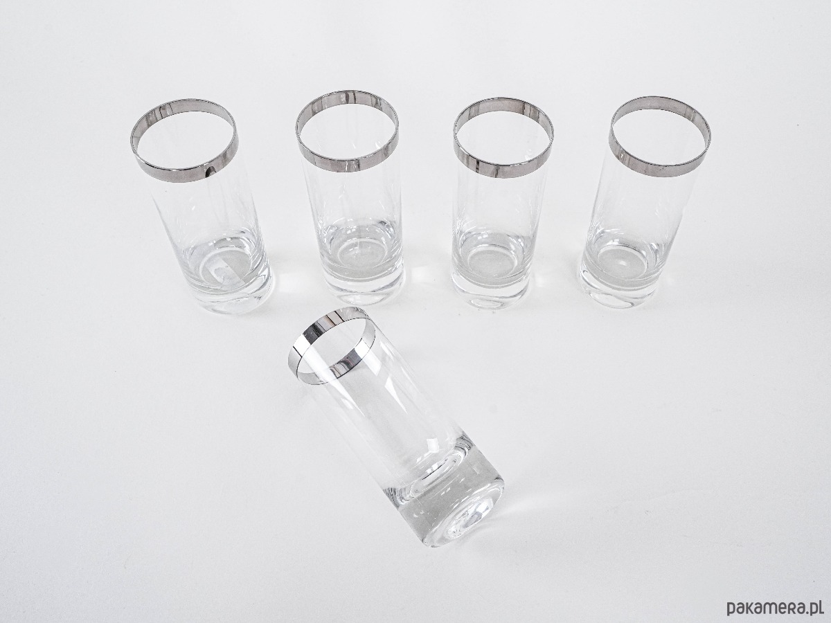 Komplet 6 wysokich szklanek z lat 60./70., z lustrzanym, srebrnym rantem – klasyka stylu Hollywood Regency, inspirowana projektami Dorothy Thorpe. Idealne do koktajli, whisky z lodem lub jako stylowy akcent na domowym barze.