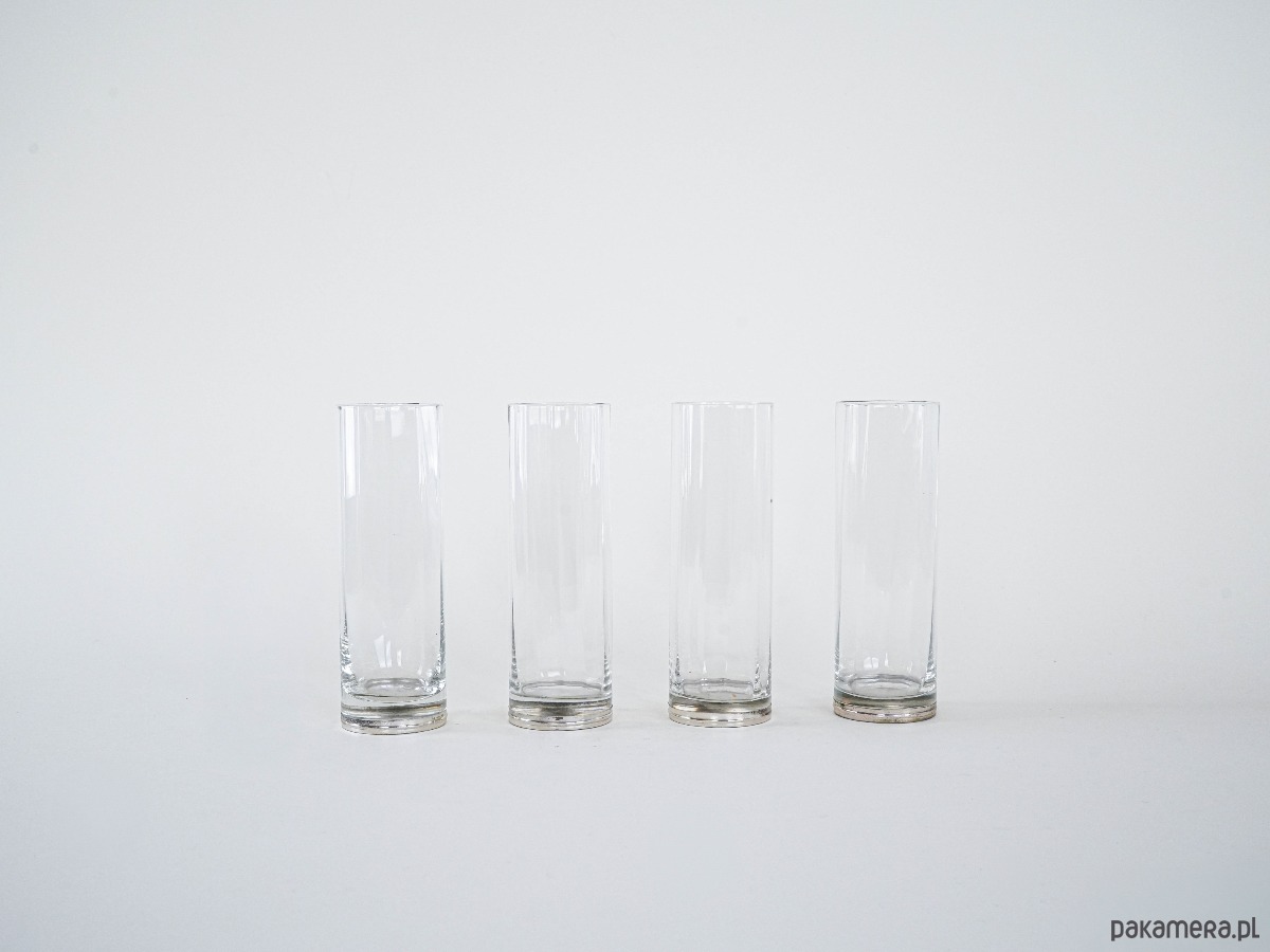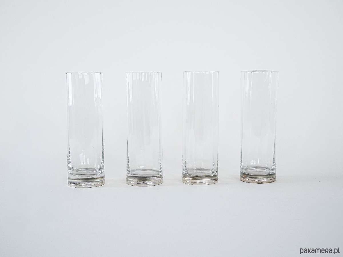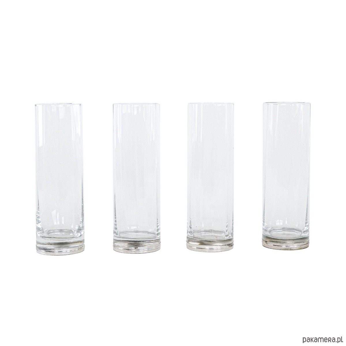 Komplet czterech wysokich szklanek z przezroczystego szkła, z dekoracyjnym srebrnym rantem u podstawy – subtelne, ale wyjątkowe wykończenie w duchu Hollywood Regency. Idealne do drinków, wody lub jako elegancki akcent w domowym barku.