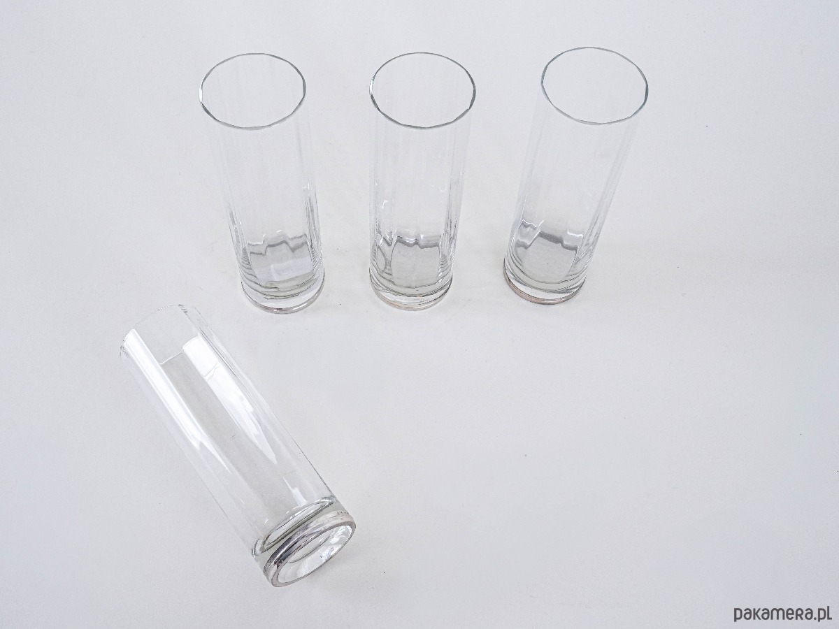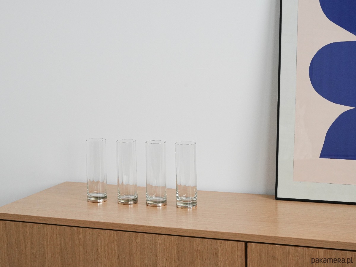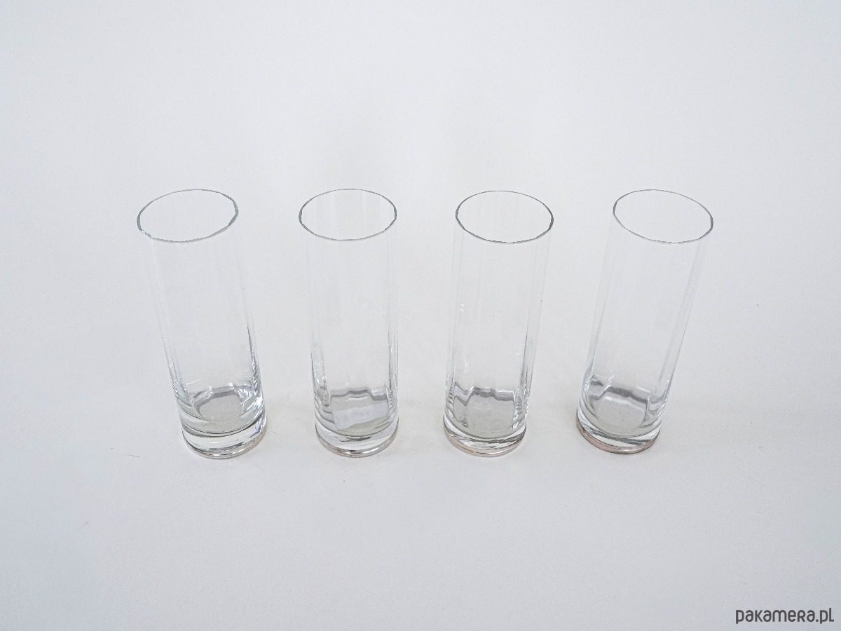 Komplet czterech wysokich szklanek z przezroczystego szkła, z dekoracyjnym srebrnym rantem u podstawy – subtelne, ale wyjątkowe wykończenie w duchu Hollywood Regency. Idealne do drinków, wody lub jako elegancki akcent w domowym barku.