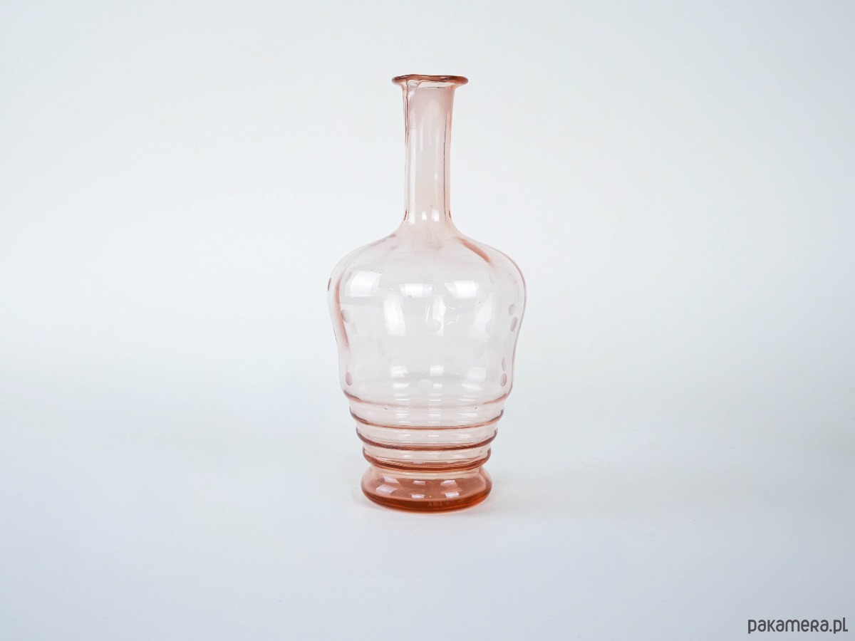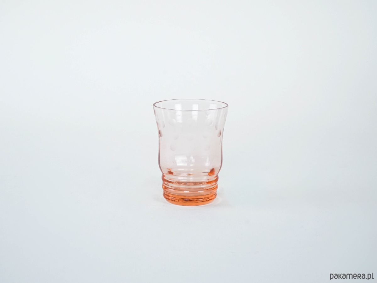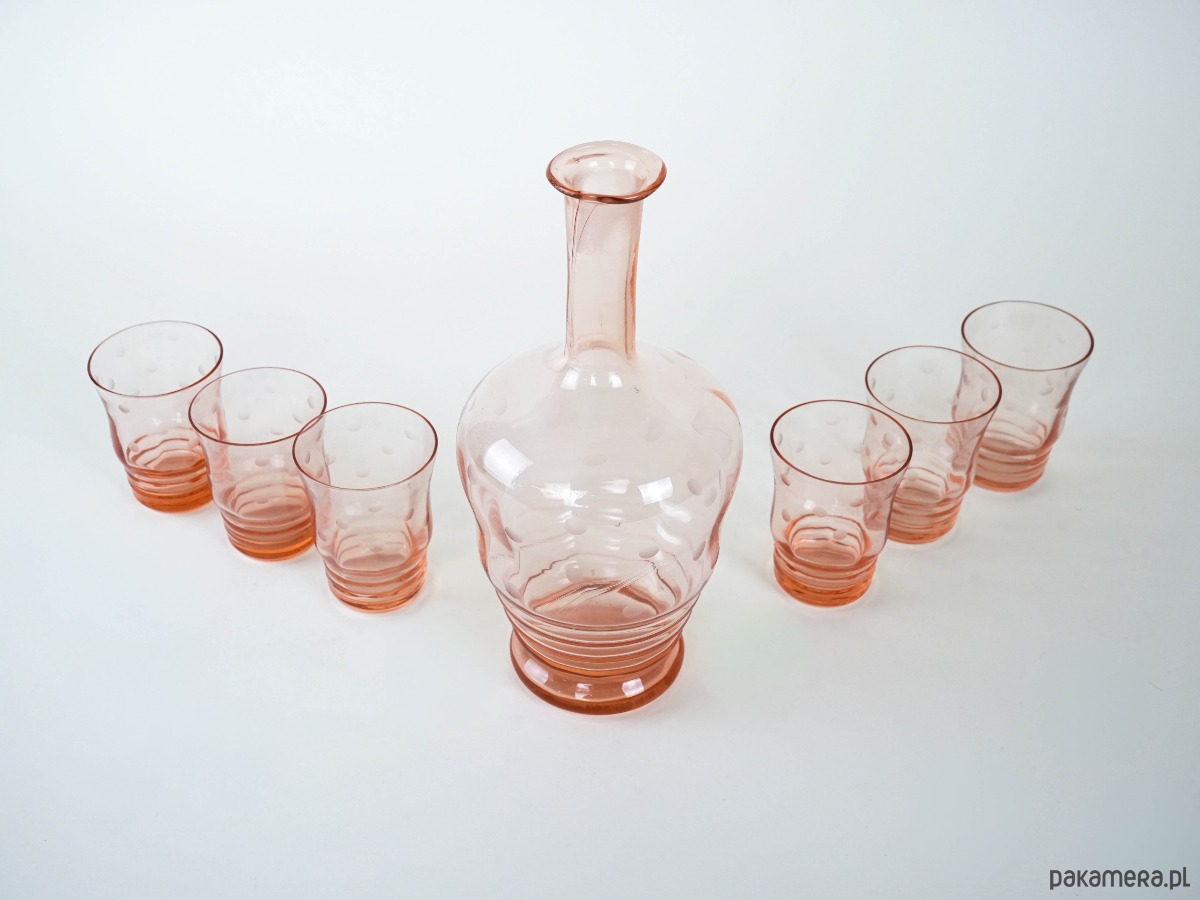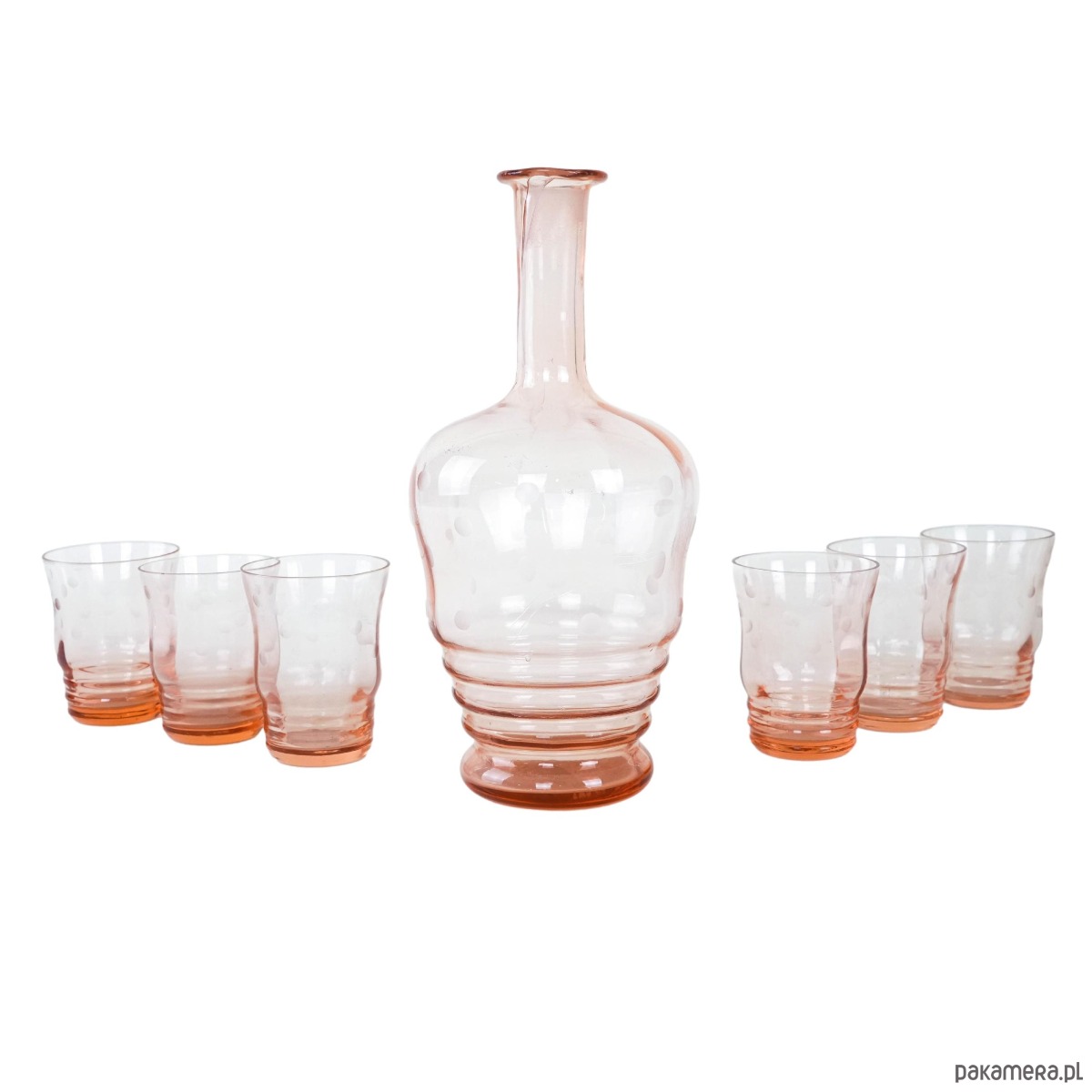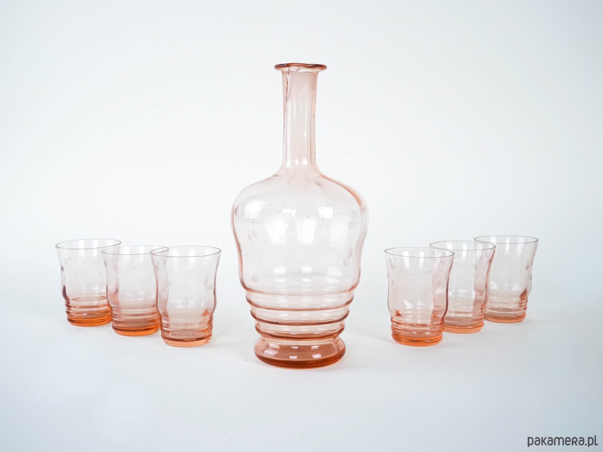 Szklany komplet składający się z karafki i sześciu szklanek w odcieniu łososiowo-różowym, zdobionych subtelnym, polerowanym w kropki wzorem. Karafka ma smukłą szyjkę i delikatnie pękaty brzusiec z poziomymi żłobieniami w dolnej części, co nadaje jej lekko retro charakter. Całość idealna do serwowania wody, soków lub drinków w stylowy, dekoracyjny sposób.