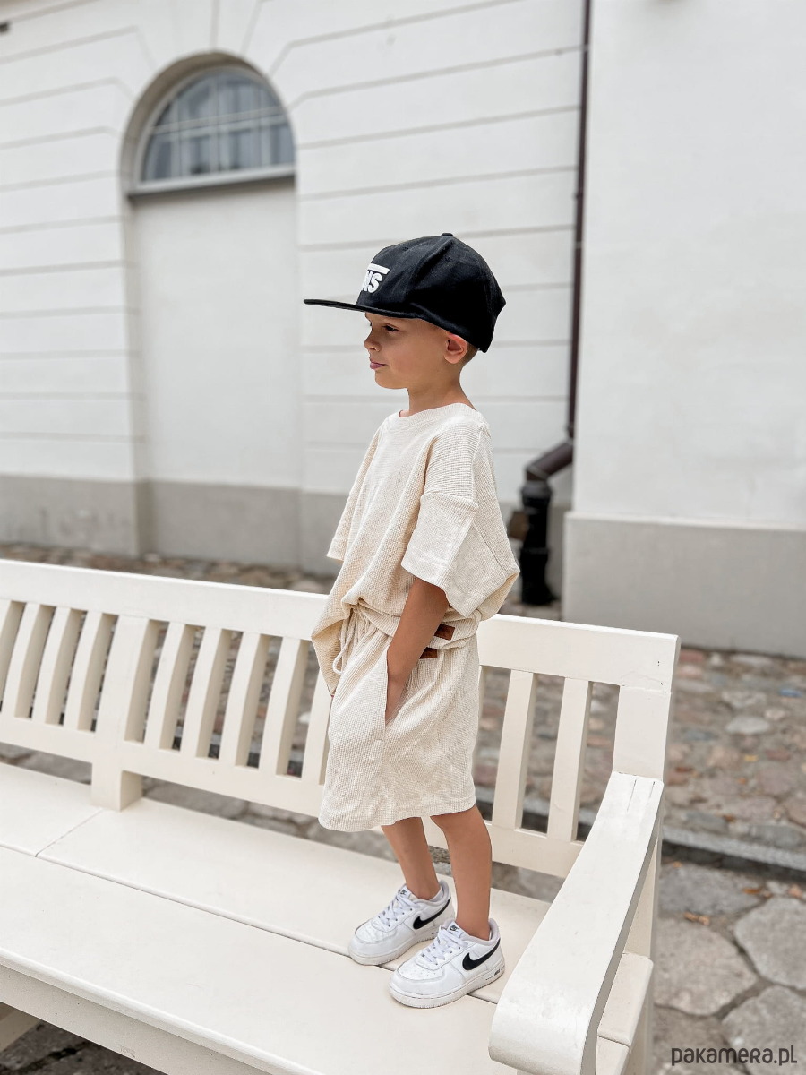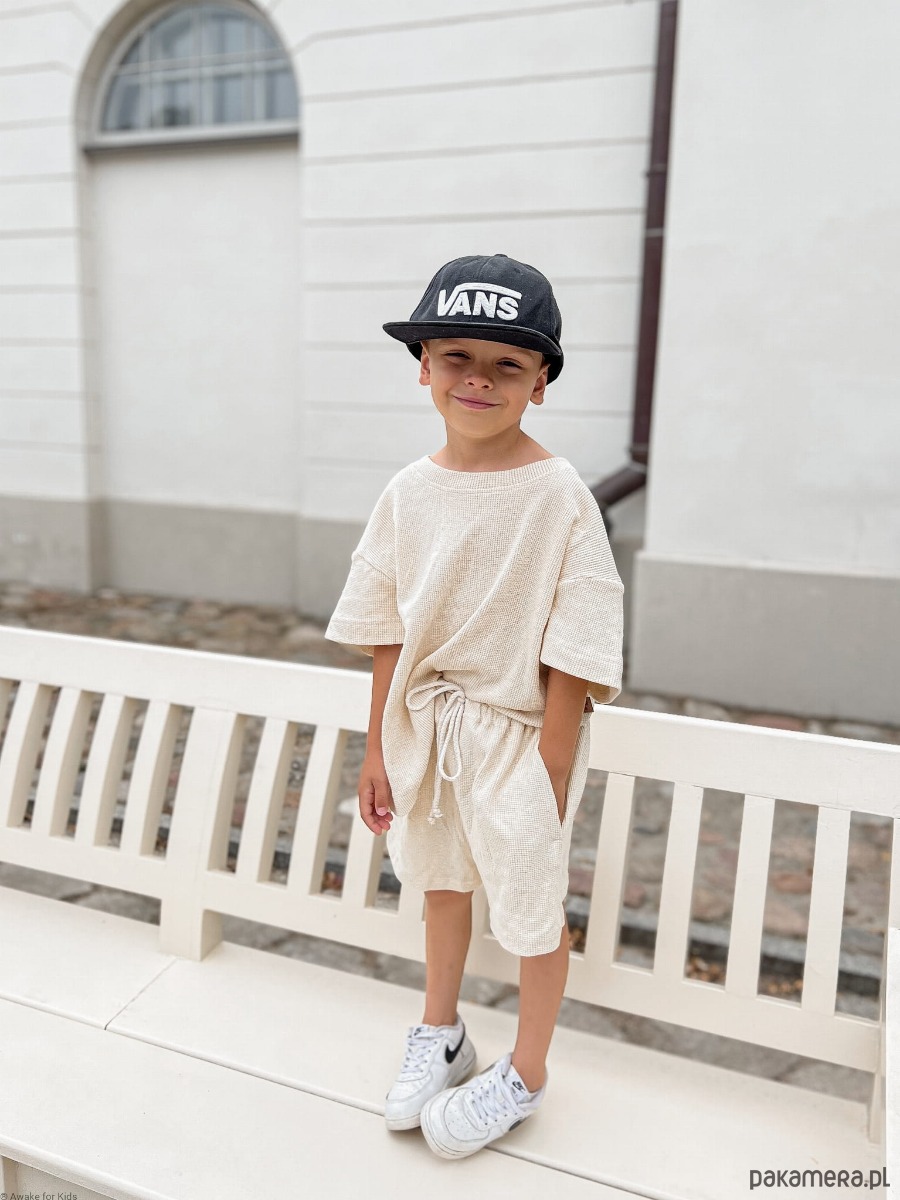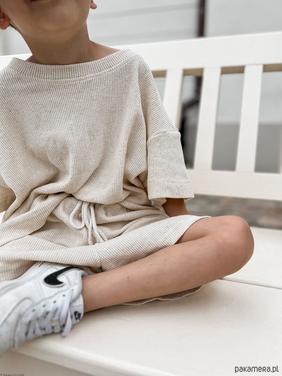 T-shirt ma wygodny krój oversize, a spodenki mają kieszonki na skarby i sznureczek w pasie do regulacji szerokości. Zestaw uniwersalny, pasuje na chłopców i dziewczynki. Zrobiony z bardzo miękkiego bawełnianego wafelka z dodatkiem lnu. Sprawdźcie pozostałe ubranka z wafelka lnianego: bluzę oversize z kapturem i joggersy oraz bluzobody oversize z kapturem idealne na chłodniejsze dni.
