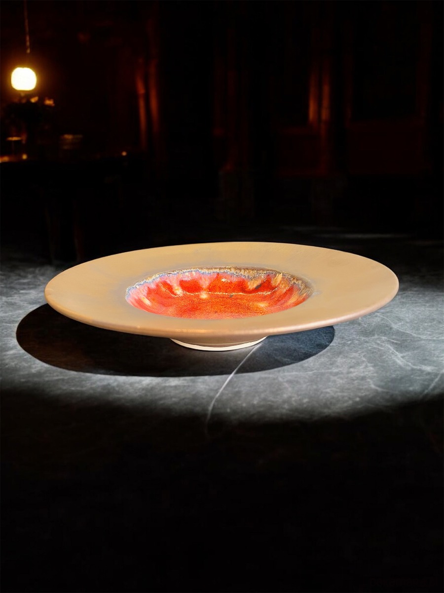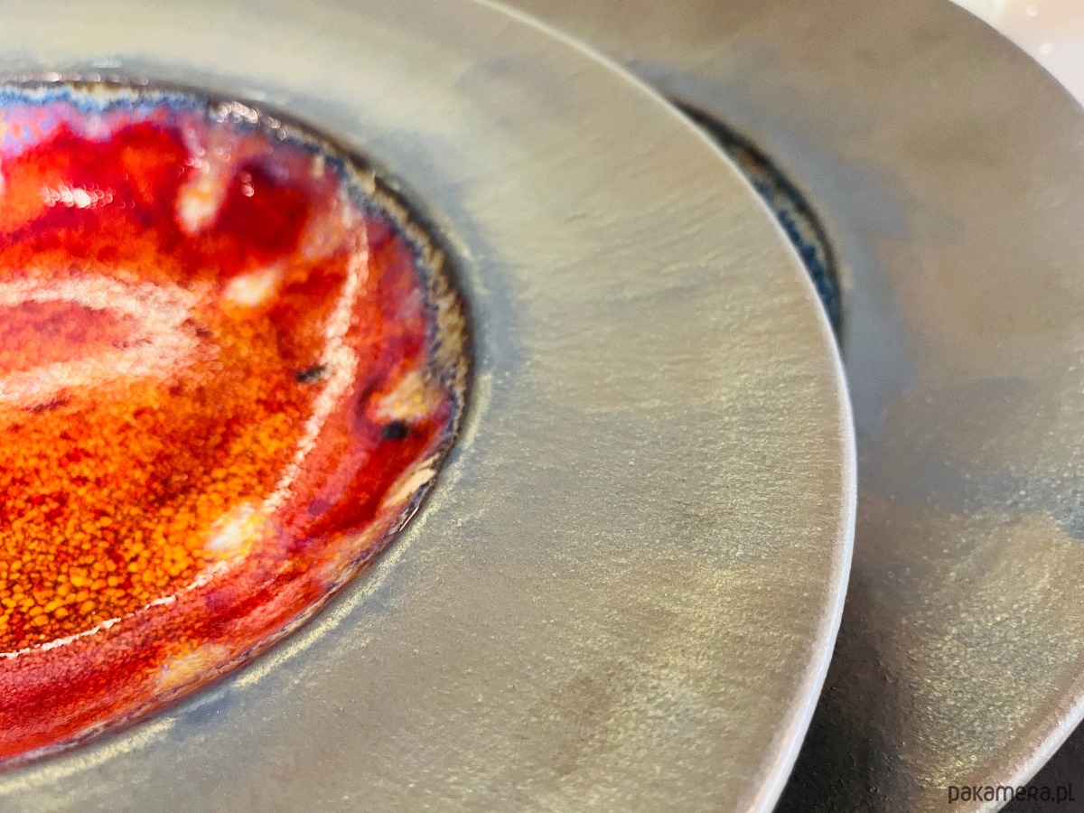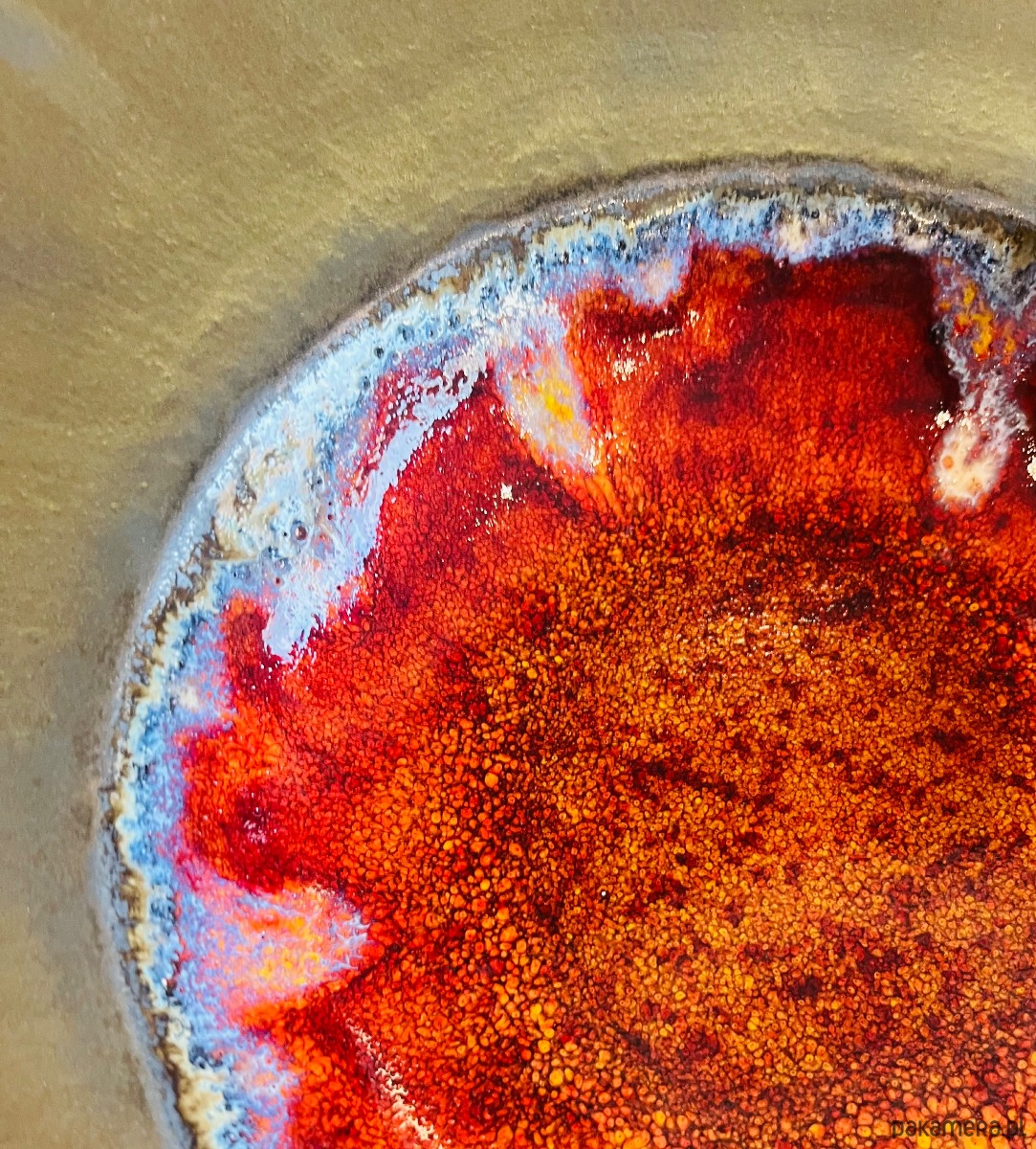 Piękny ręcznie robiony zestaw 4 talerzy do pasty/makaronu czy zwyczajnie zupy 🙃talerze stanowią unikatowy jedyny na świecie zestaw☺️kolory satynowej miedzi tudzież starego złota a środek błyszczący przypominający ogień 🔥 użyte szkliwa wysokiej jakości do kontaktu z żywnością.Średnica każdego talerza 27 cm.