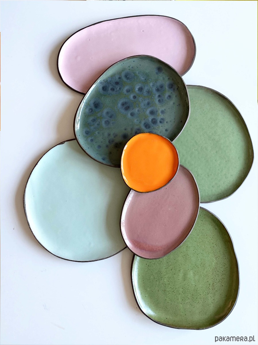 Zestaw siedmiu nieregularnych talerzy z ceramiki.