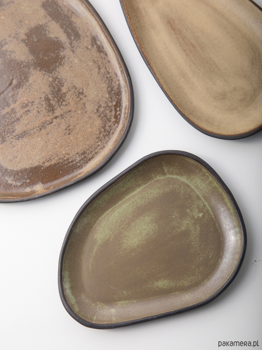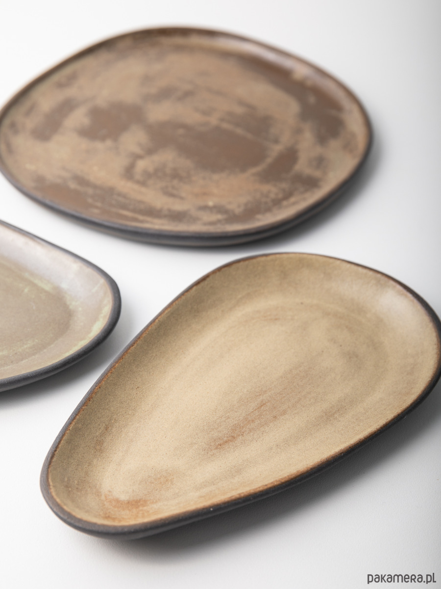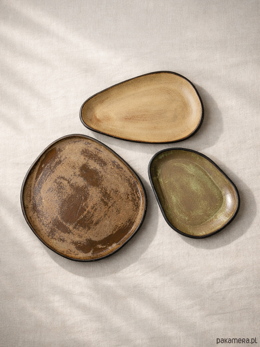 Każdy element zestawu ma nieregularny, organiczny kształt, dzięki czemu talerze doskonale się uzupełniają, a jednocześnie pozostają unikatowe. Subtelne, ziemiste szkliwa tworzą spokojną, elegancką paletę barw, idealną do nowoczesnych i minimalistycznych wnętrz.