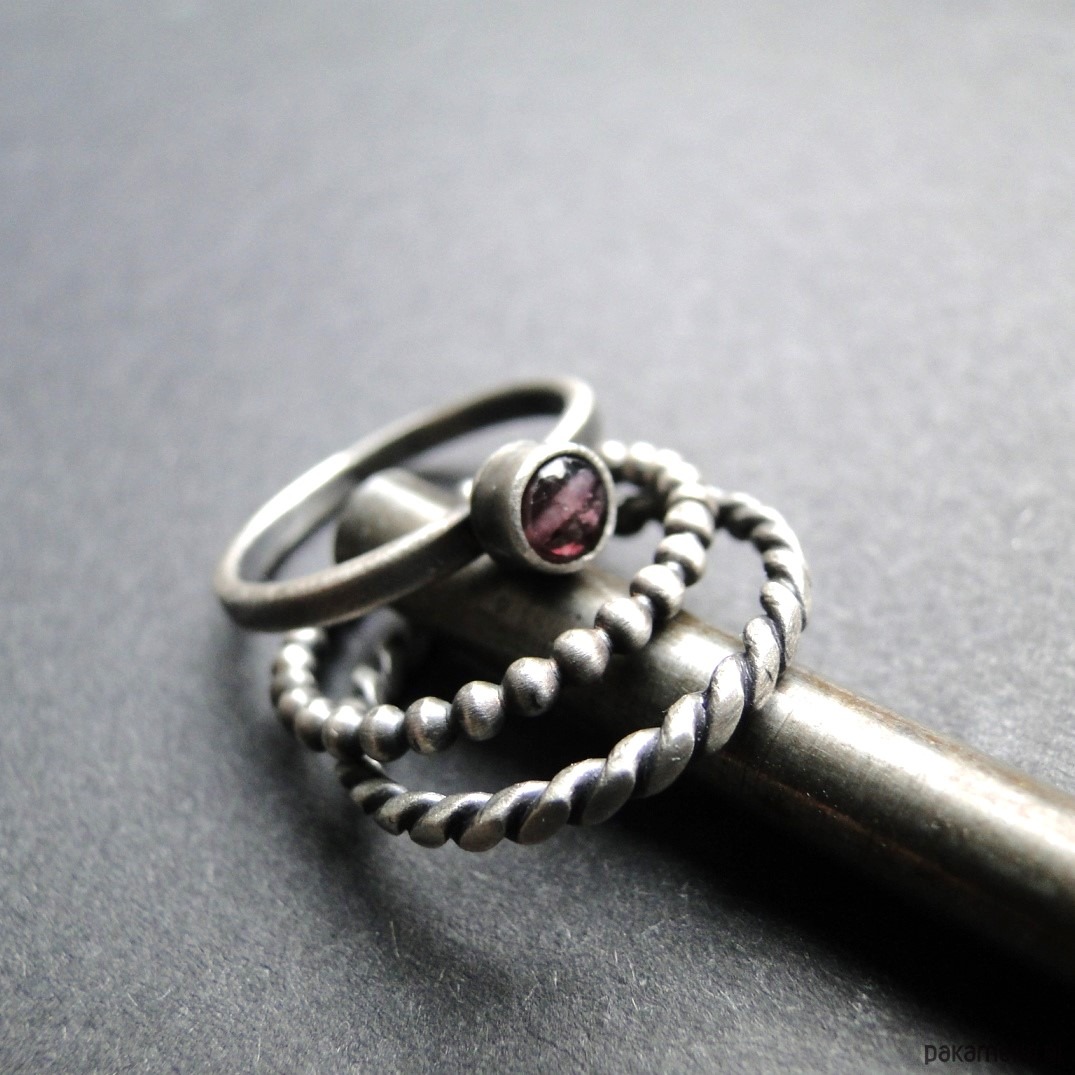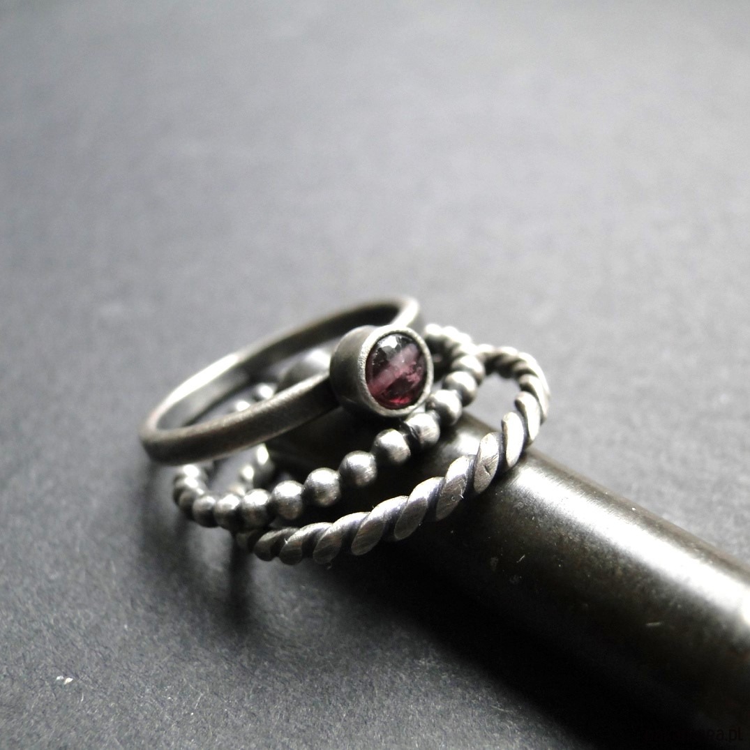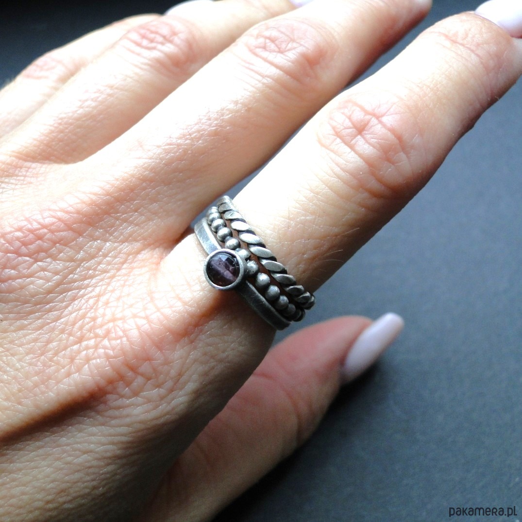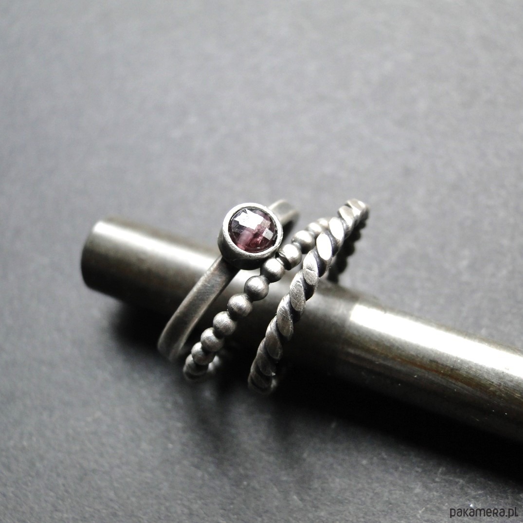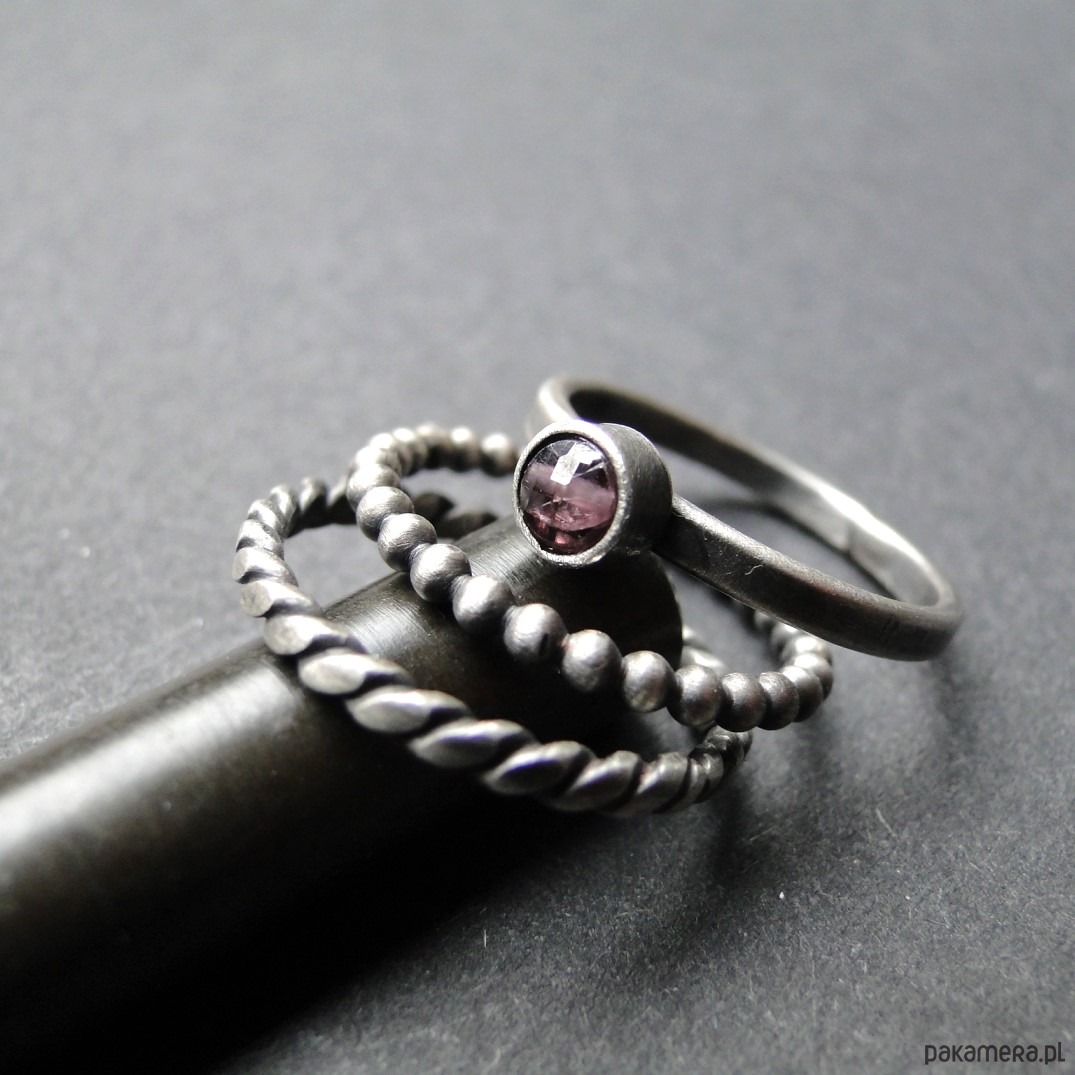 Surowy,delikatny zestaw trzech pierścionków ze srebra pr.925. Oksydowane i szorowane srebro. Pierwszy kulkowy pierścionek jest grubości ok.1,5mm; drugi z naturalnym spinelem surowym w kolorze śliwkowym. śr.4 mm; trzeci to pleciona obrączka. Rozmiar jubilerski 14. Nie moczyć w wodzie. Do zestawu można dokupić wisior oraz proste kolczyki widoczne na stronie (pojedyncze).
