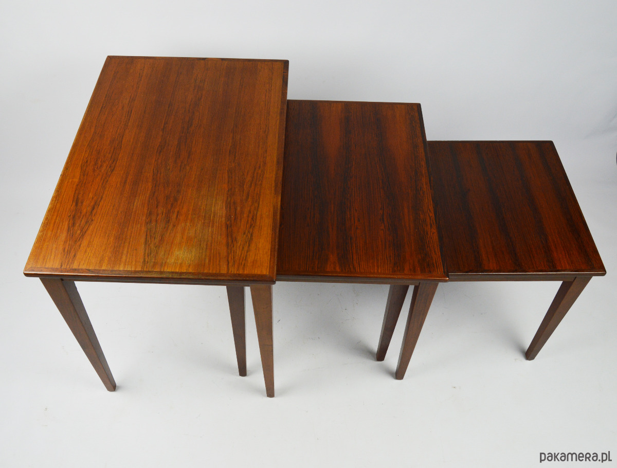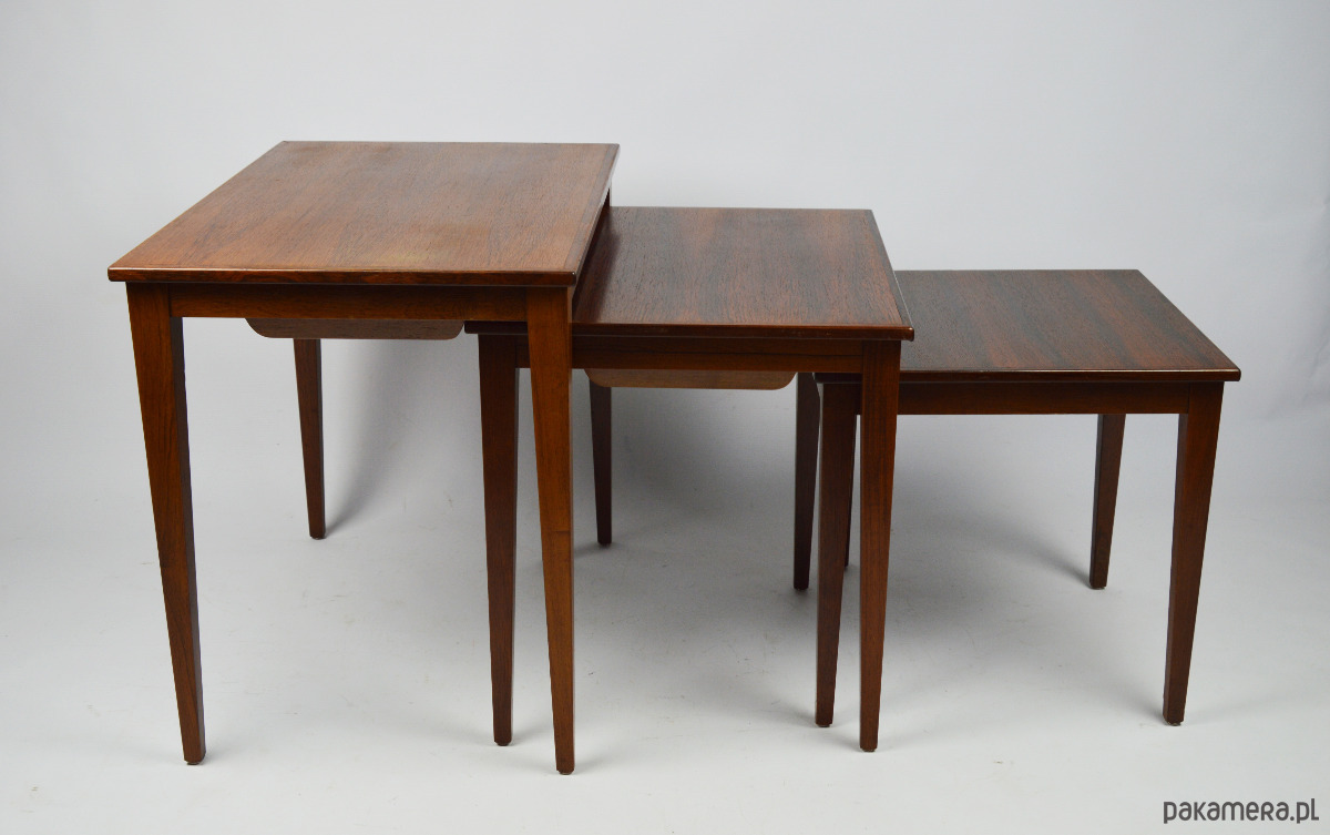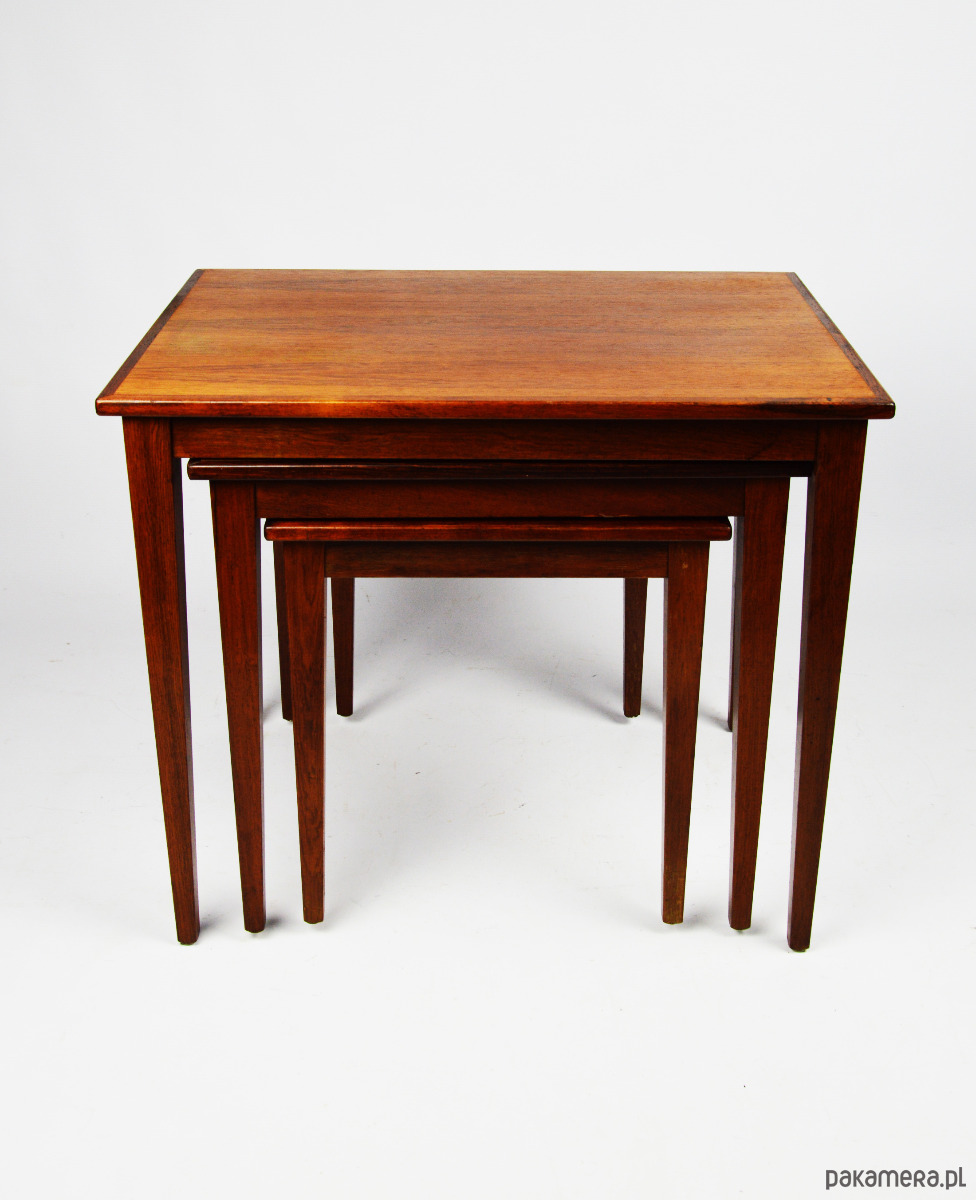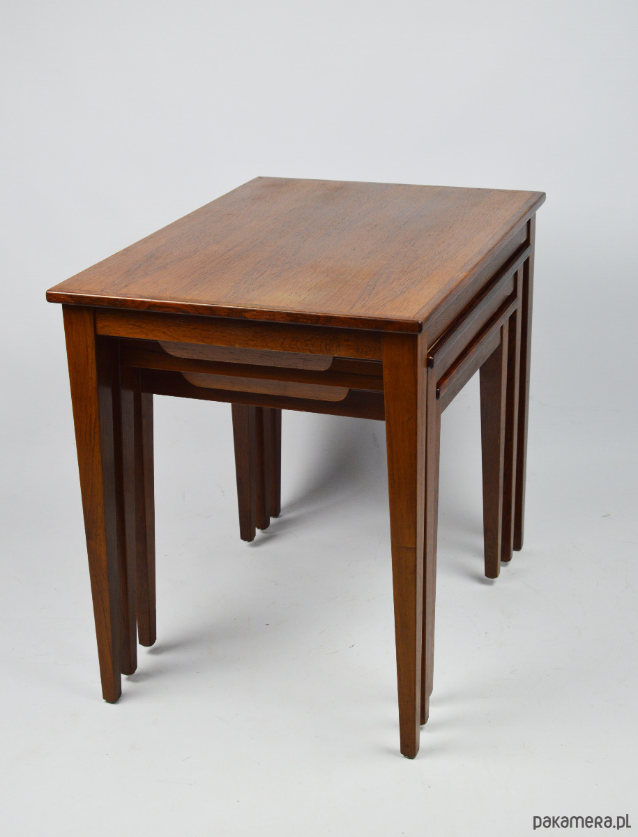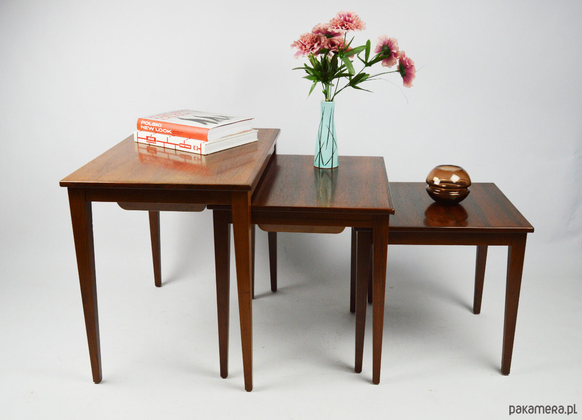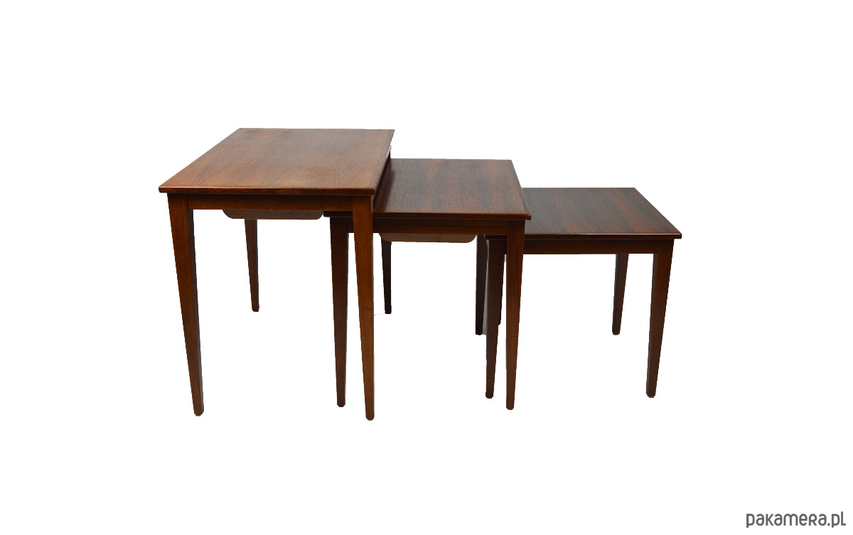 Zestaw trzech stolików o różnych rozmiarach z lat 70. Każdy z mniejszych stolików wchodzi w drewnianą szynę i można je swobodnie przesuwać i chować jeden w drugi. Stan zachowania dobry, widoczne przetarcia i odbarwienie na największym stoliku.